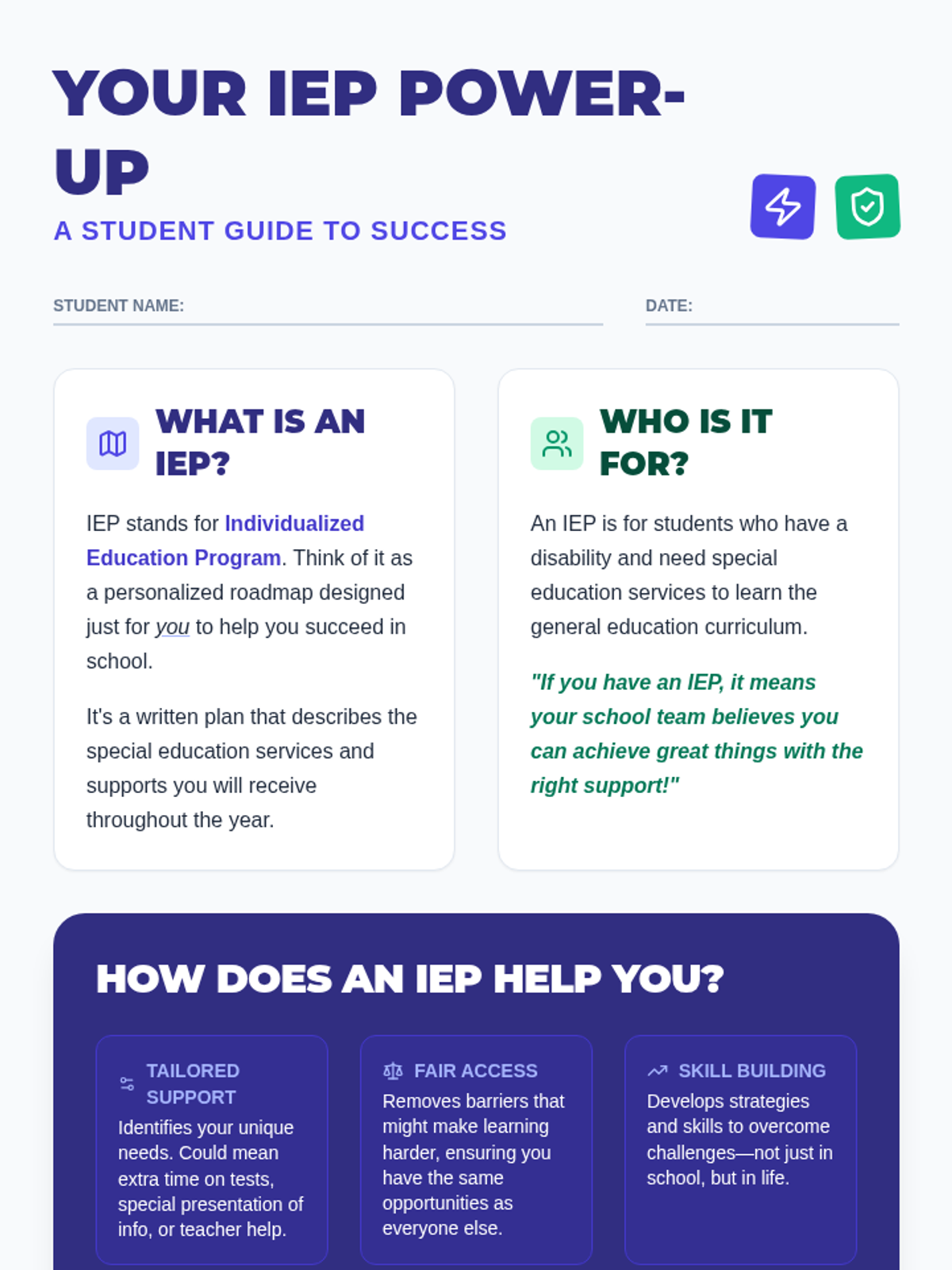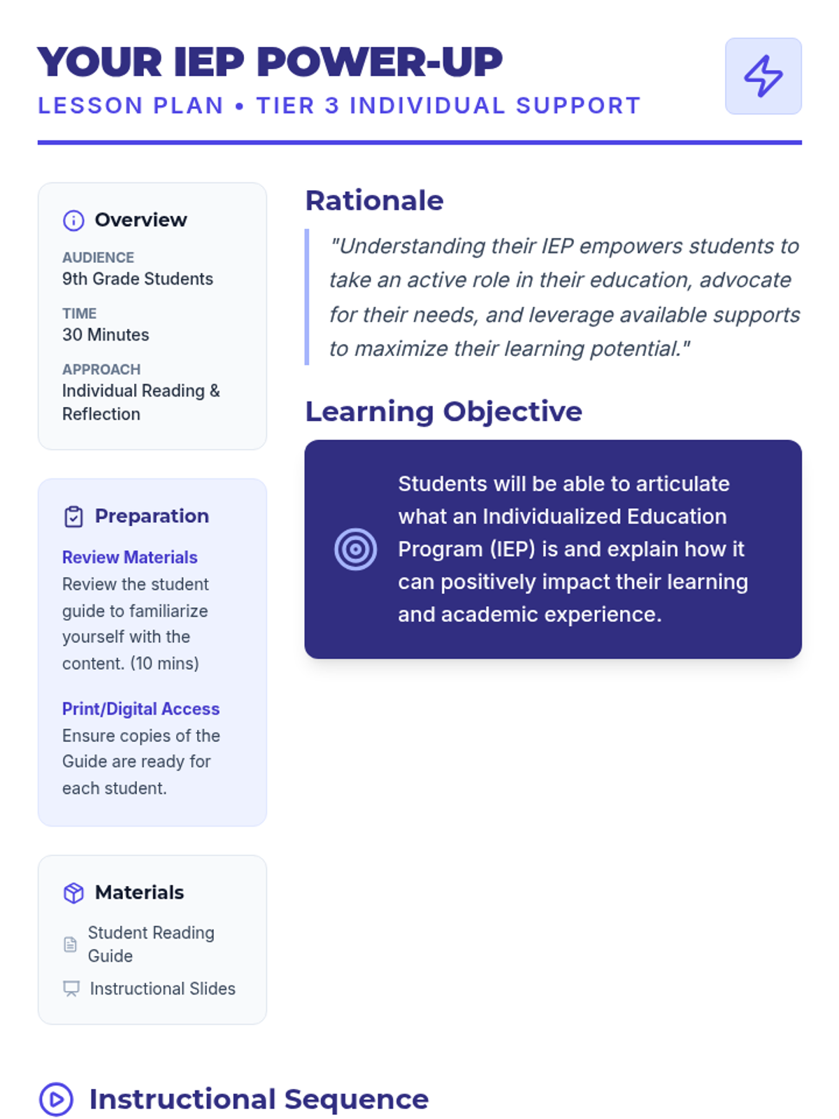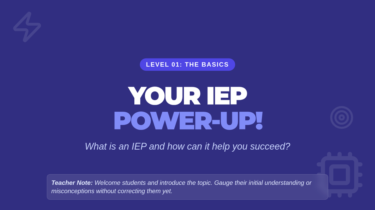 A specialized lesson for 9th-grade students to demystify the Individualized Education Program (IEP), reframing it as a 'power-up' tool for academic success and self-advocacy.