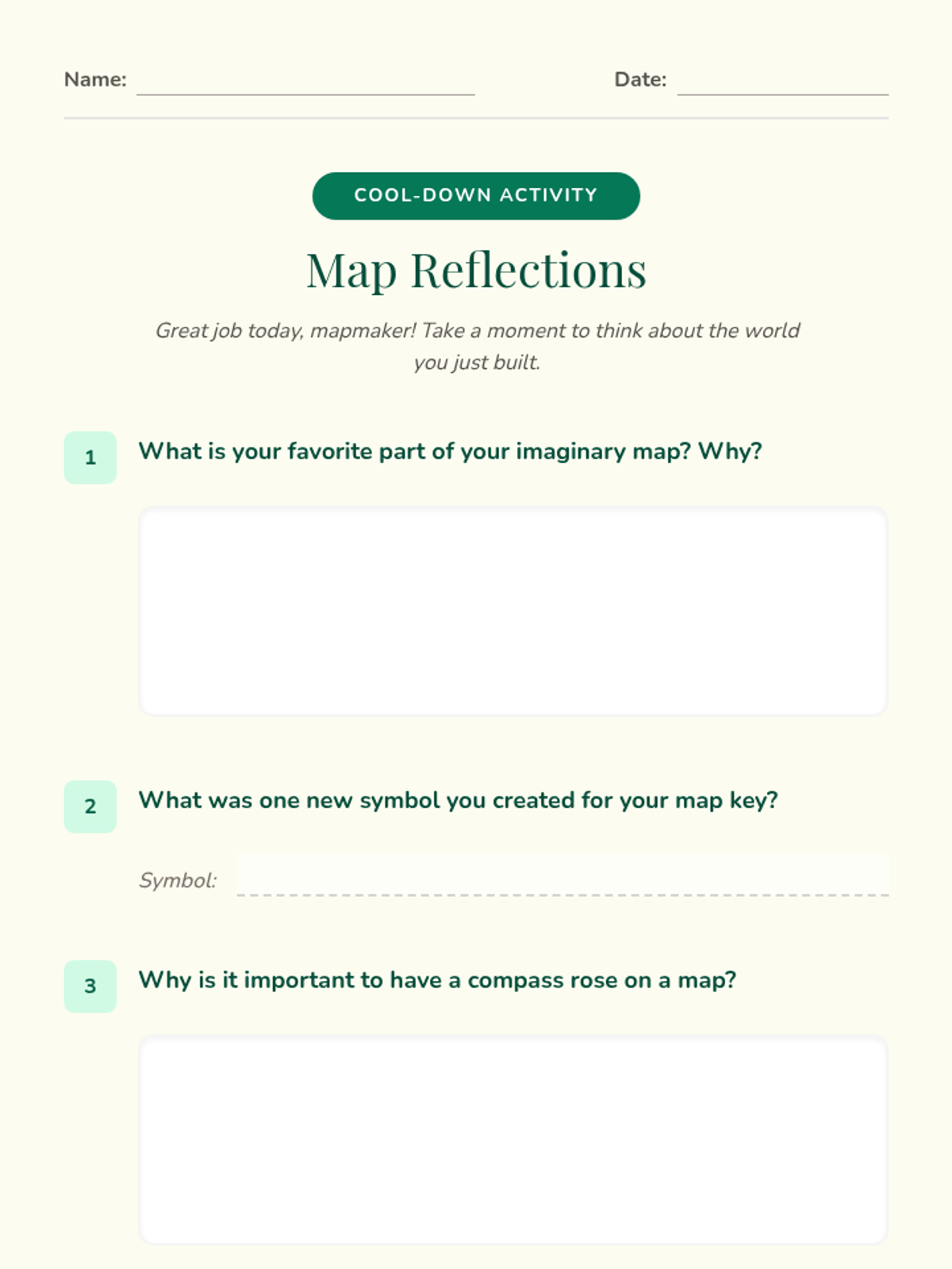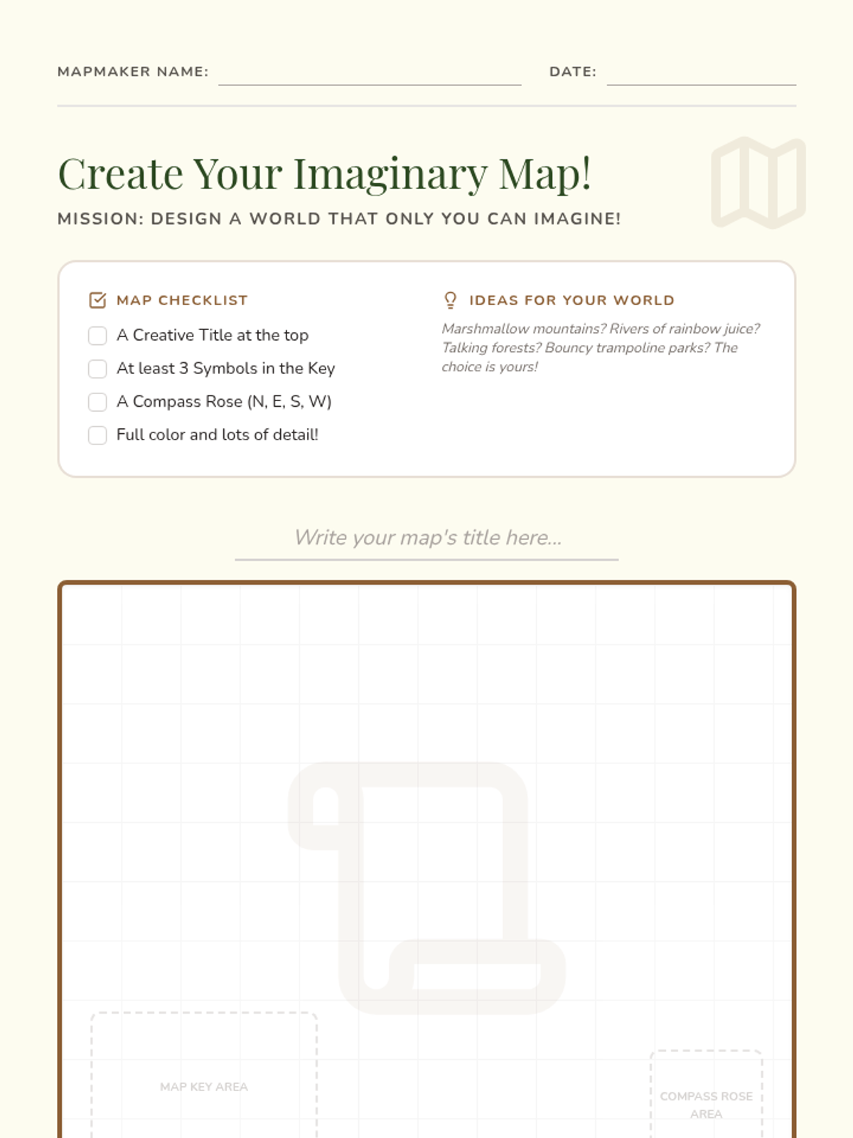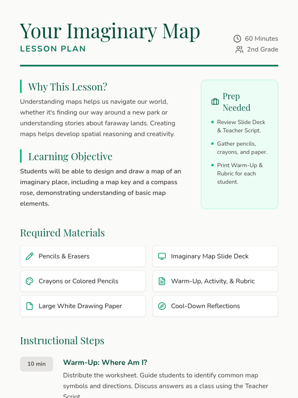 A creative, 60-minute lesson where 2nd-grade students learn basic map elements by designing their own imaginary world, complete with a title, map key, and compass rose.