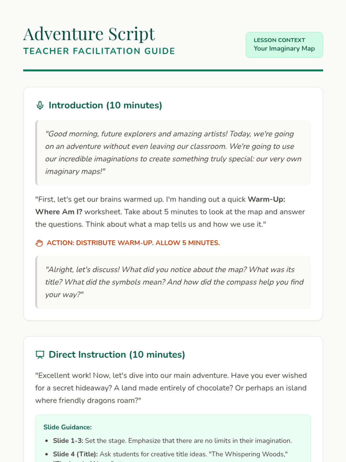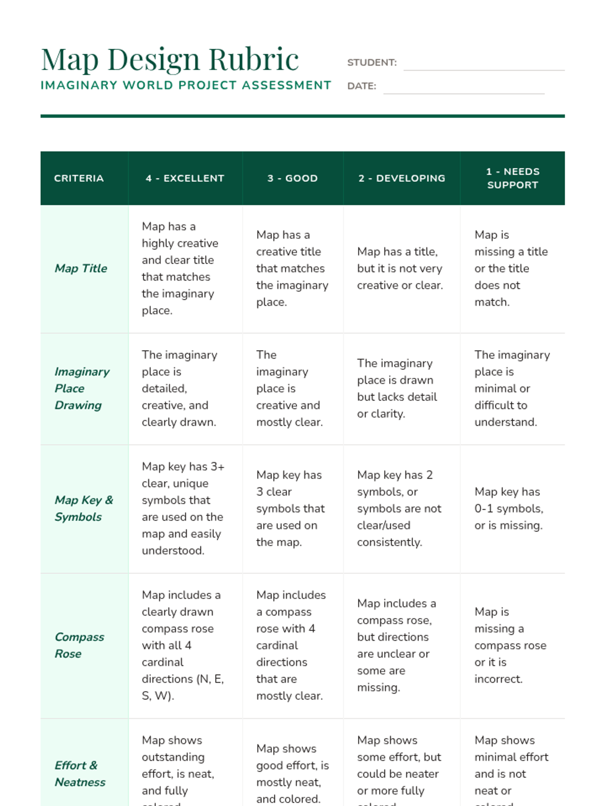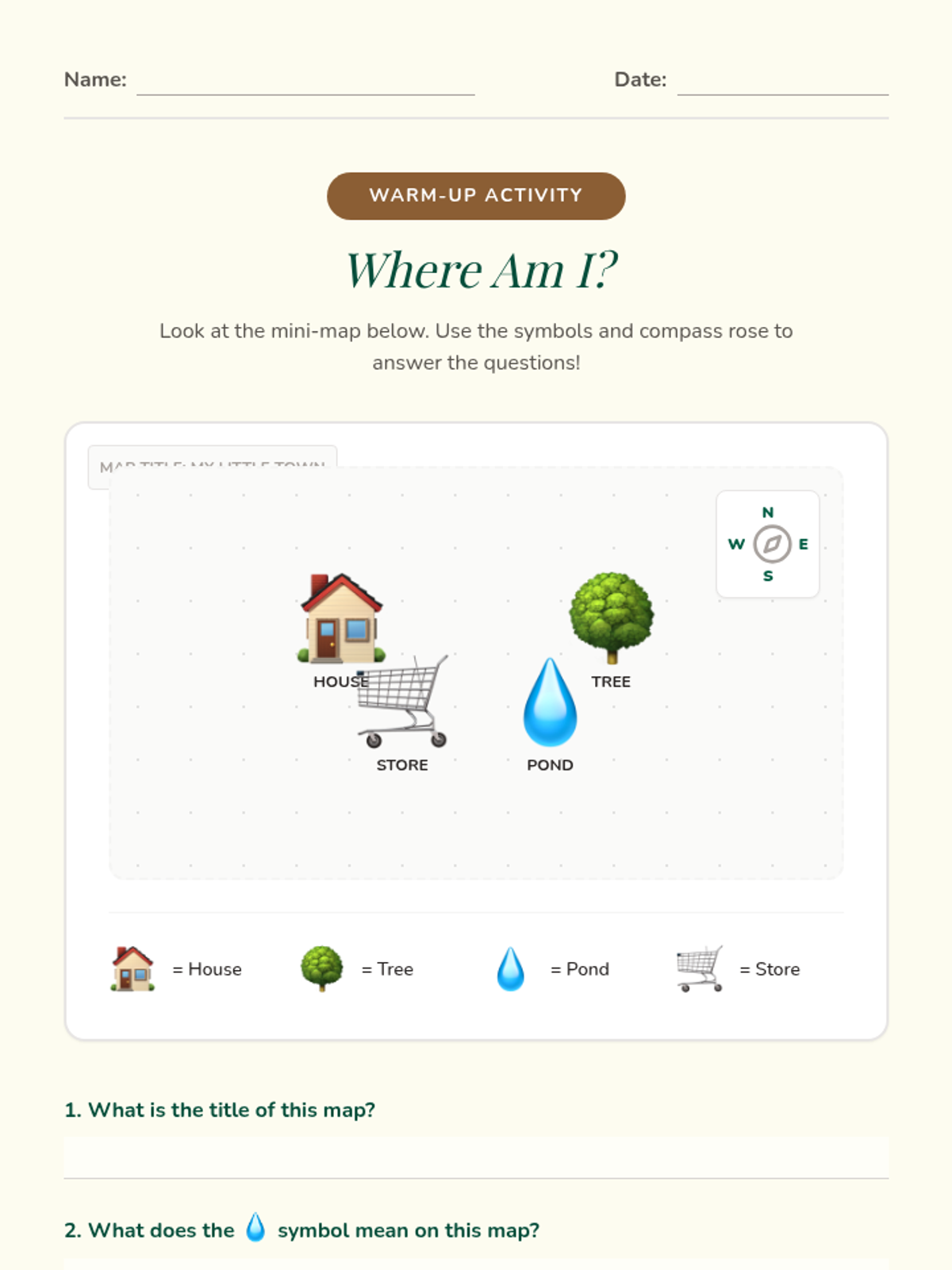 A creative, 60-minute lesson where 2nd-grade students learn basic map elements by designing their own imaginary world, complete with a title, map key, and compass rose.