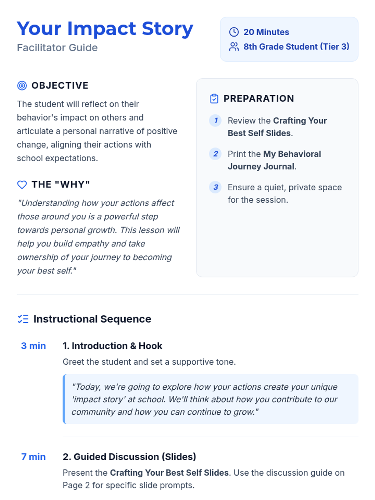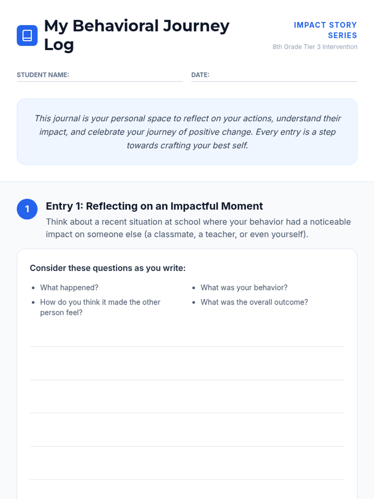 A personalized Tier 3 intervention for 8th-grade students to reflect on behavior impact and narrate their journey of positive change through empathy and accountability.