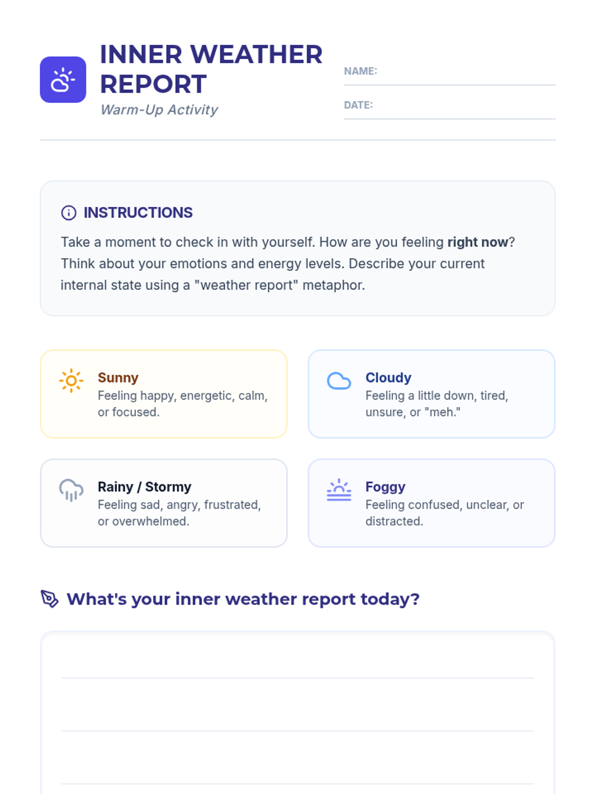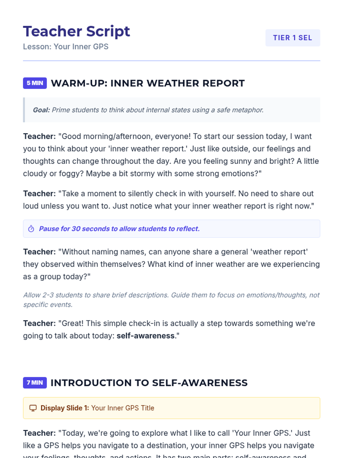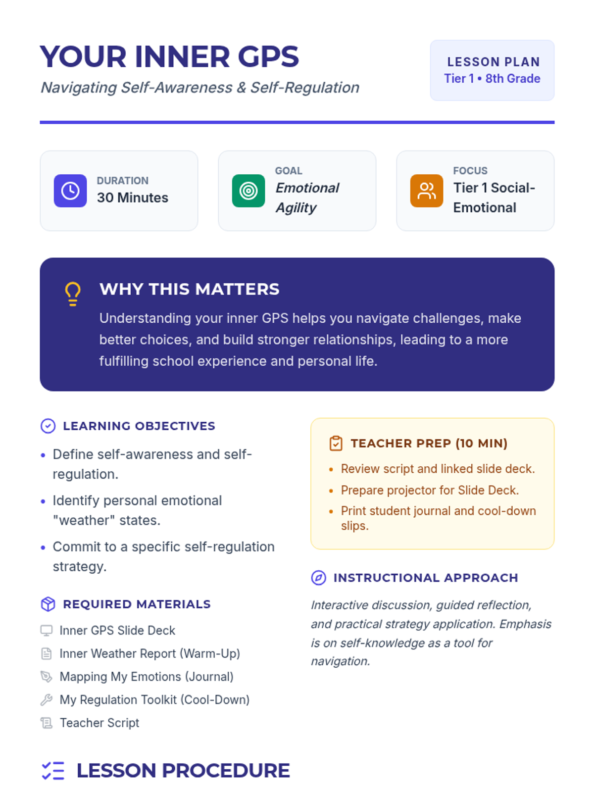 A 30-minute lesson for 8th graders on self-awareness and self-regulation, using the metaphor of an 'Inner GPS' to navigate emotions and actions.