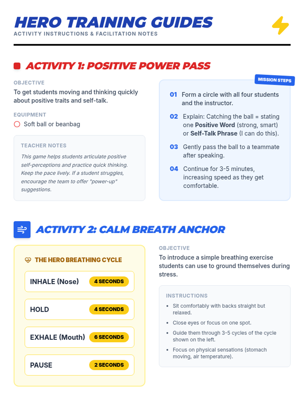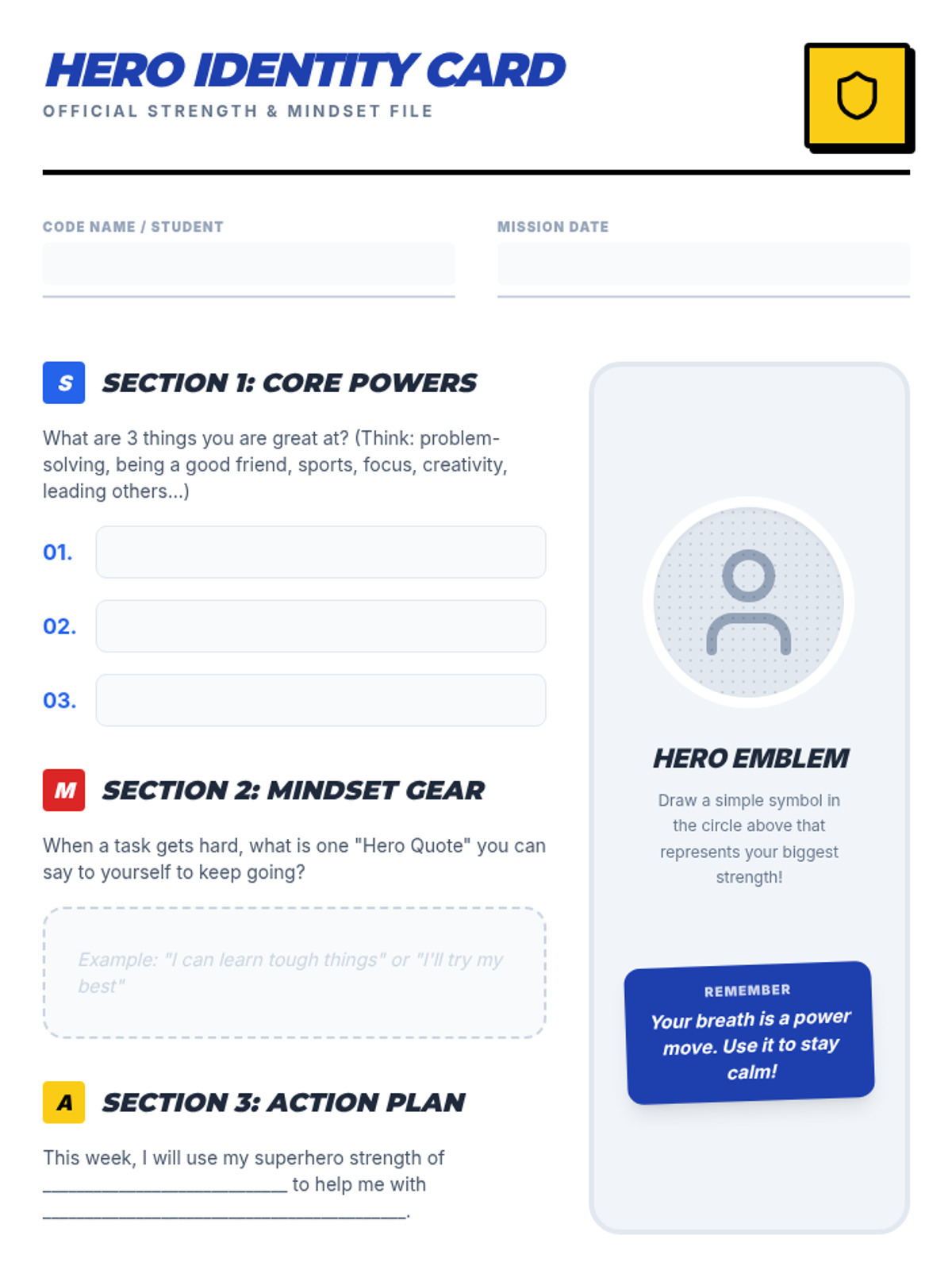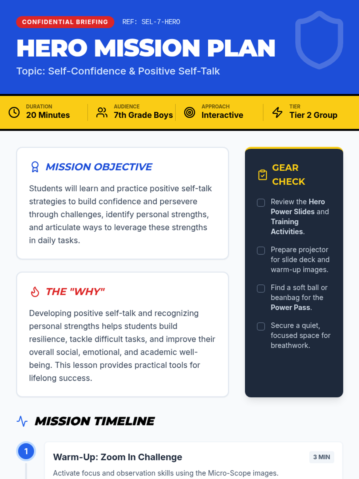 A 20-minute SEL session for 7th-grade boys focused on developing self-confidence through positive self-talk, identifying personal strengths, and practicing calming breathwork. Students explore their 'inner superhero' through interactive games and discussion.