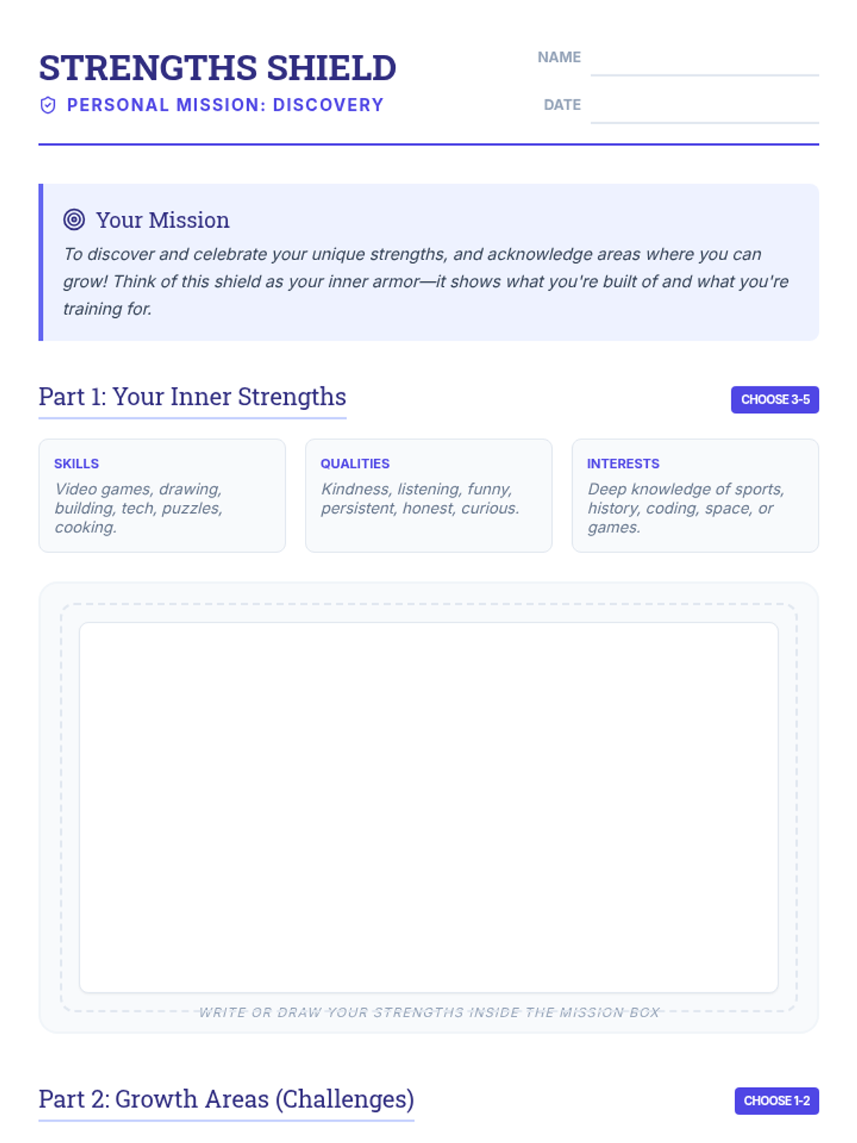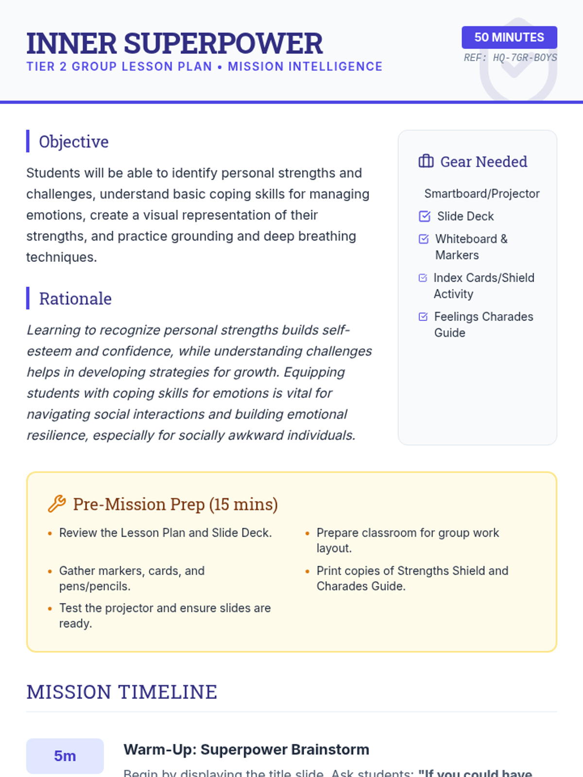 An interactive Tier 2 group lesson for 7th-grade boys focused on identifying personal strengths, understanding emotional challenges, and practicing coping skills like grounding and deep breathing.