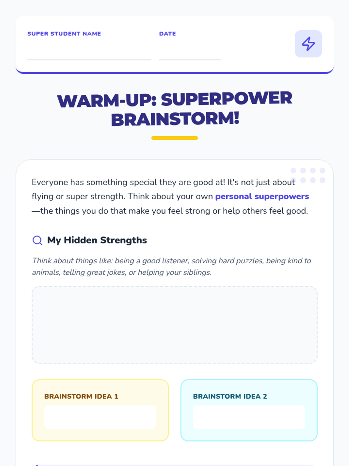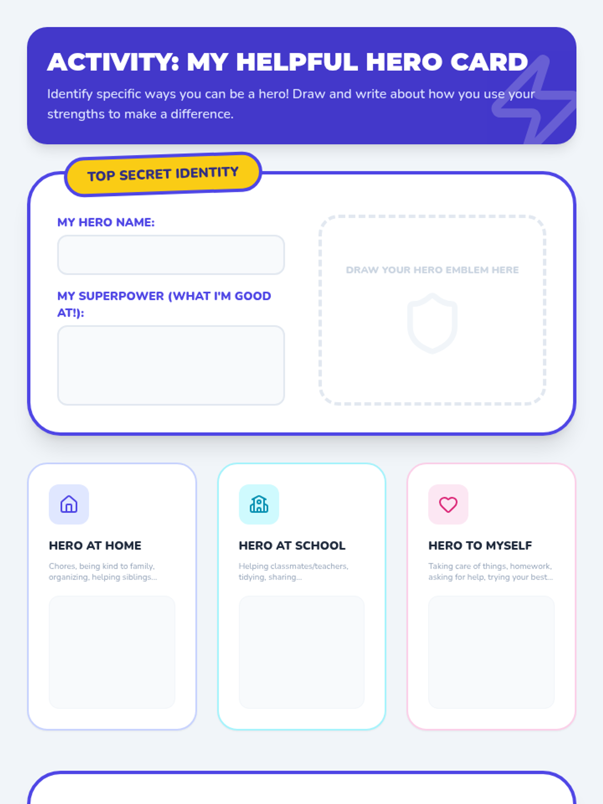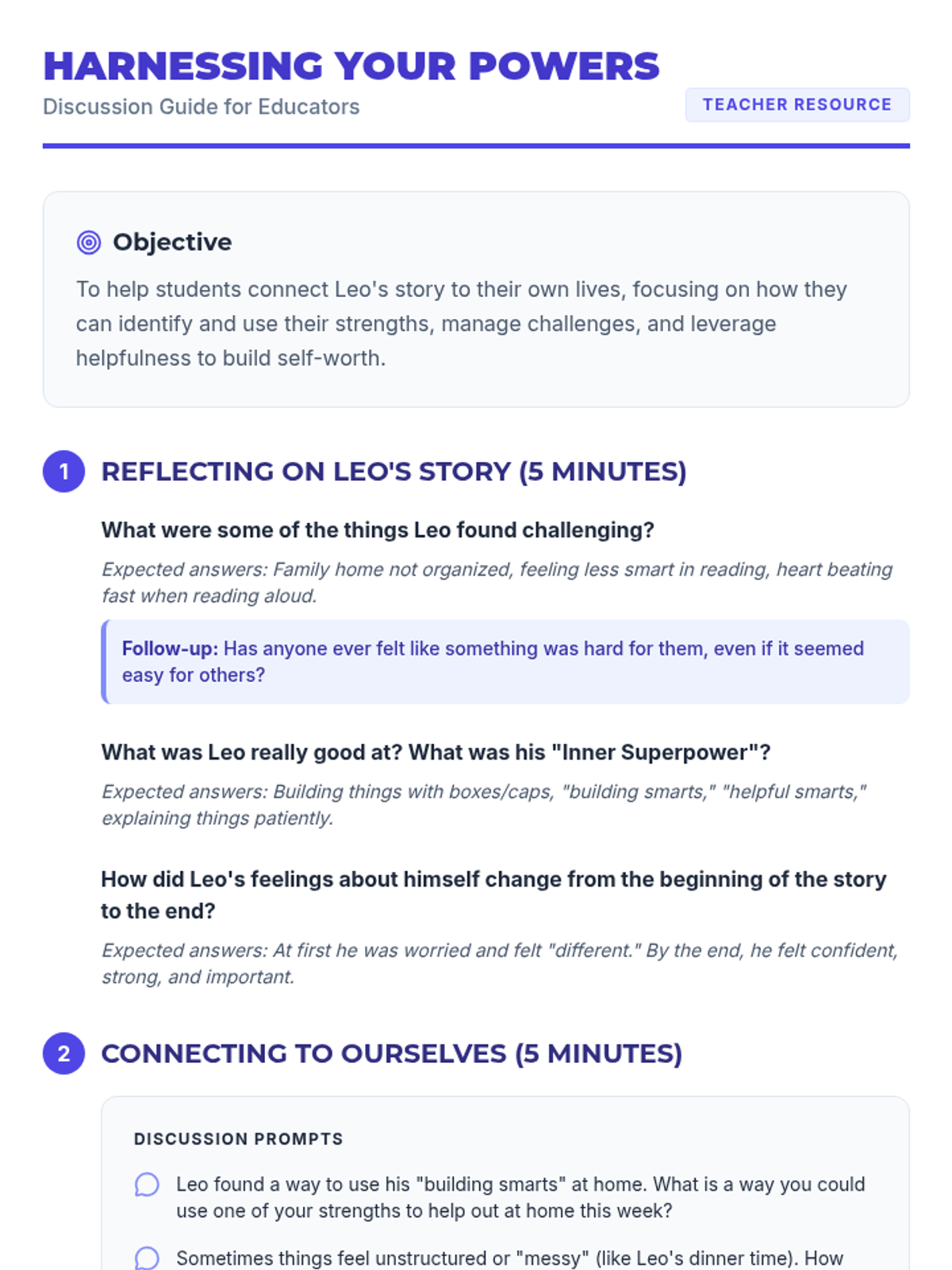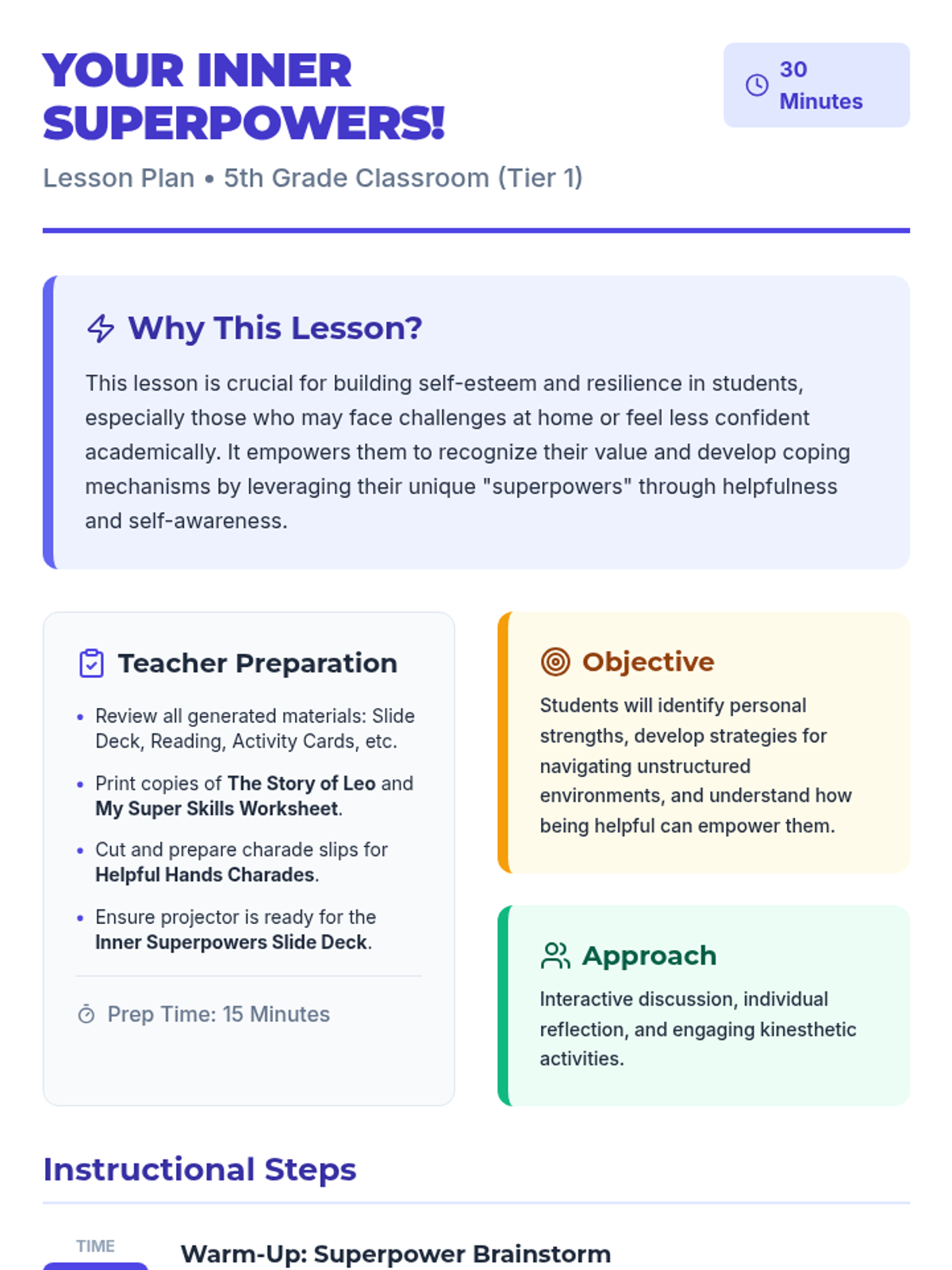 A 30-minute lesson for 5th graders to discover their inner strengths, build self-worth through helpfulness, and develop coping strategies for unstructured environments.