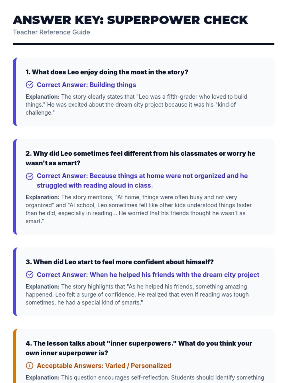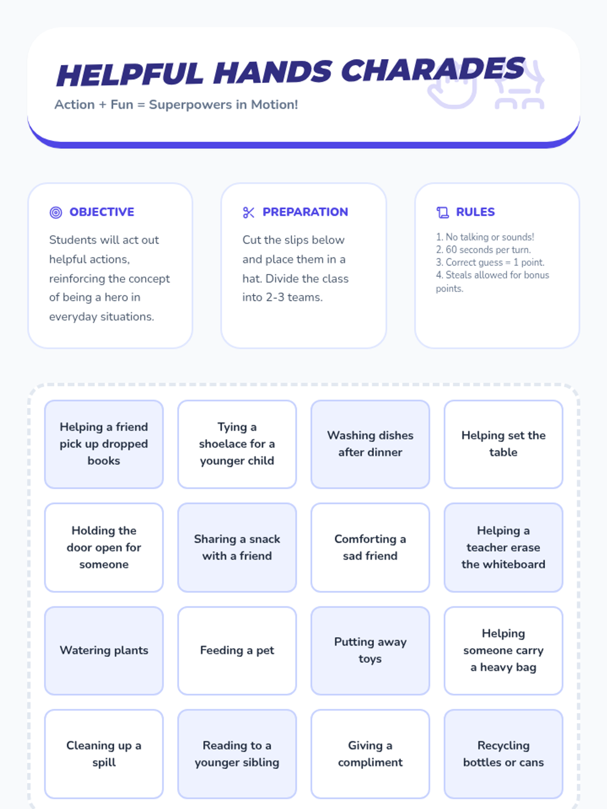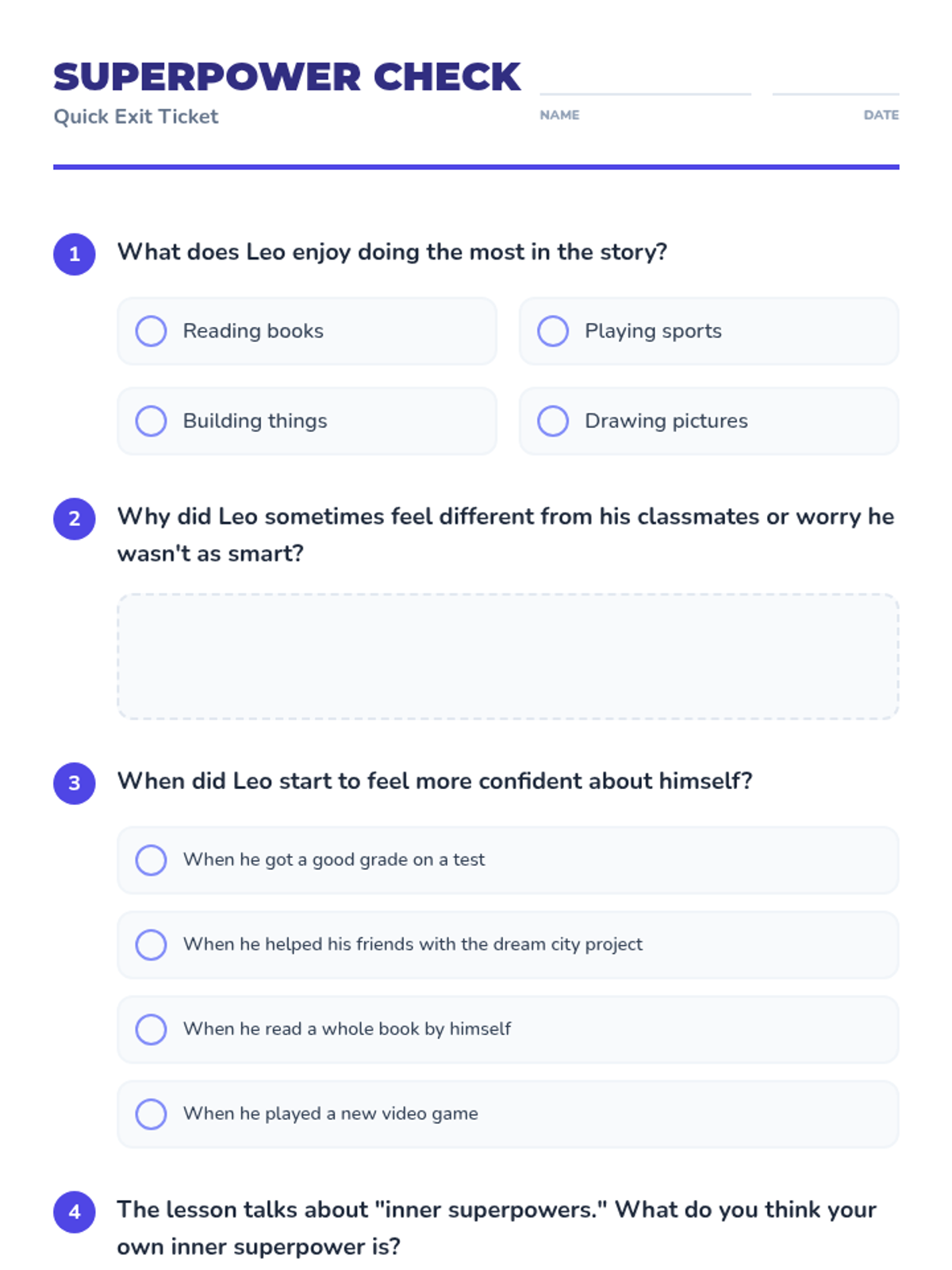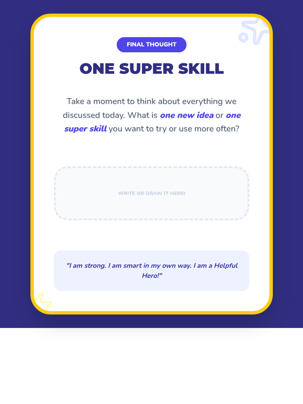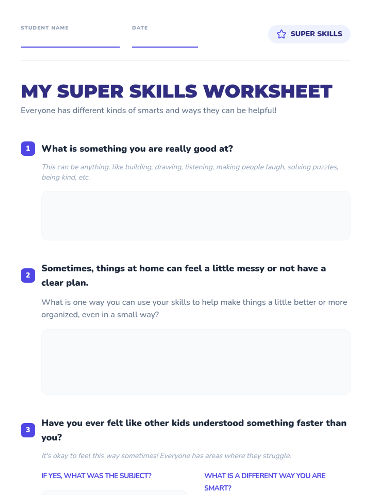A 30-minute lesson for 5th graders to discover their inner strengths, build self-worth through helpfulness, and develop coping strategies for unstructured environments.