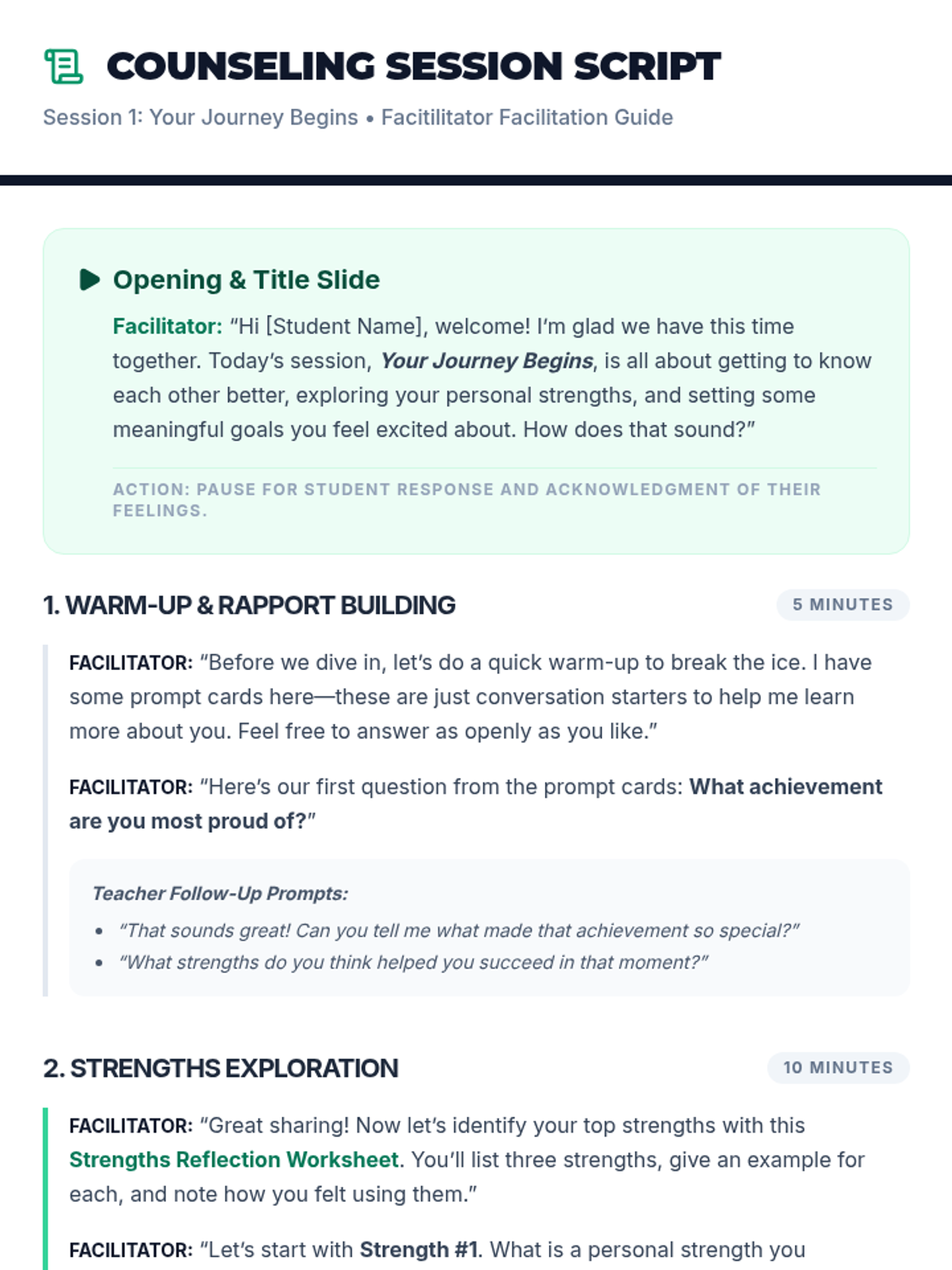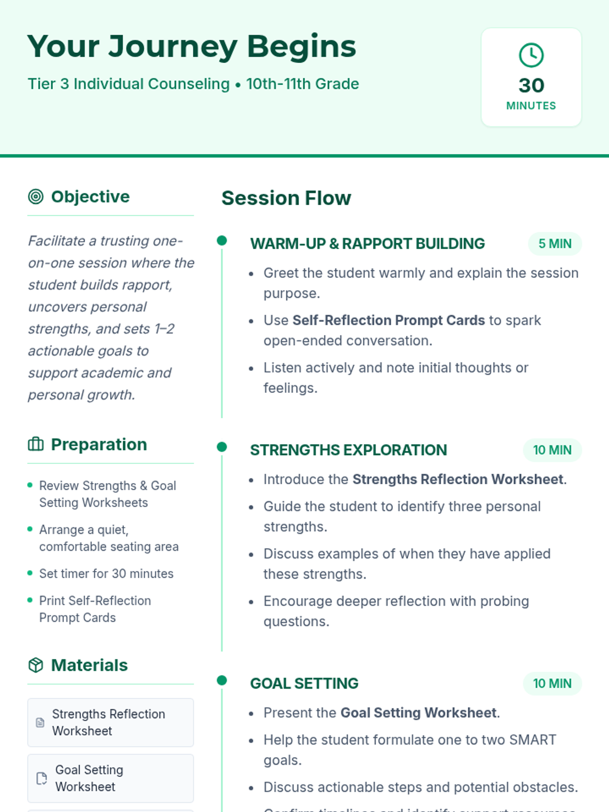 A 30-minute introductory Tier 3 counseling session for 10th and 11th graders focusing on rapport building, strength discovery, and SMART goal setting.