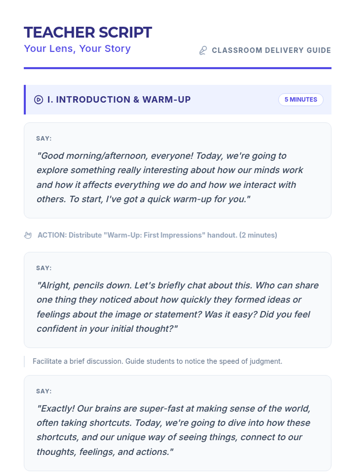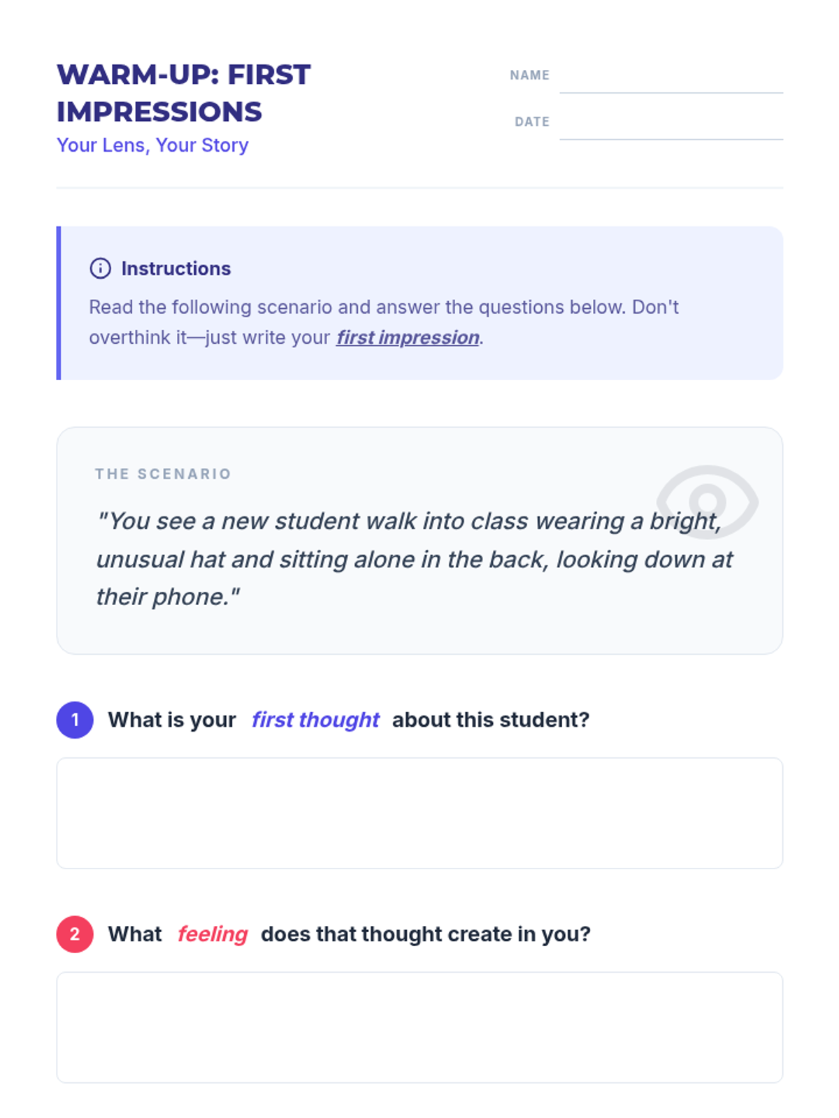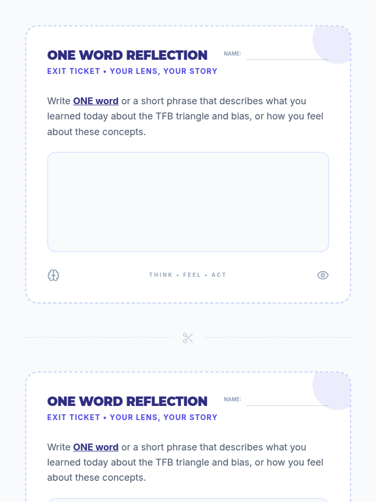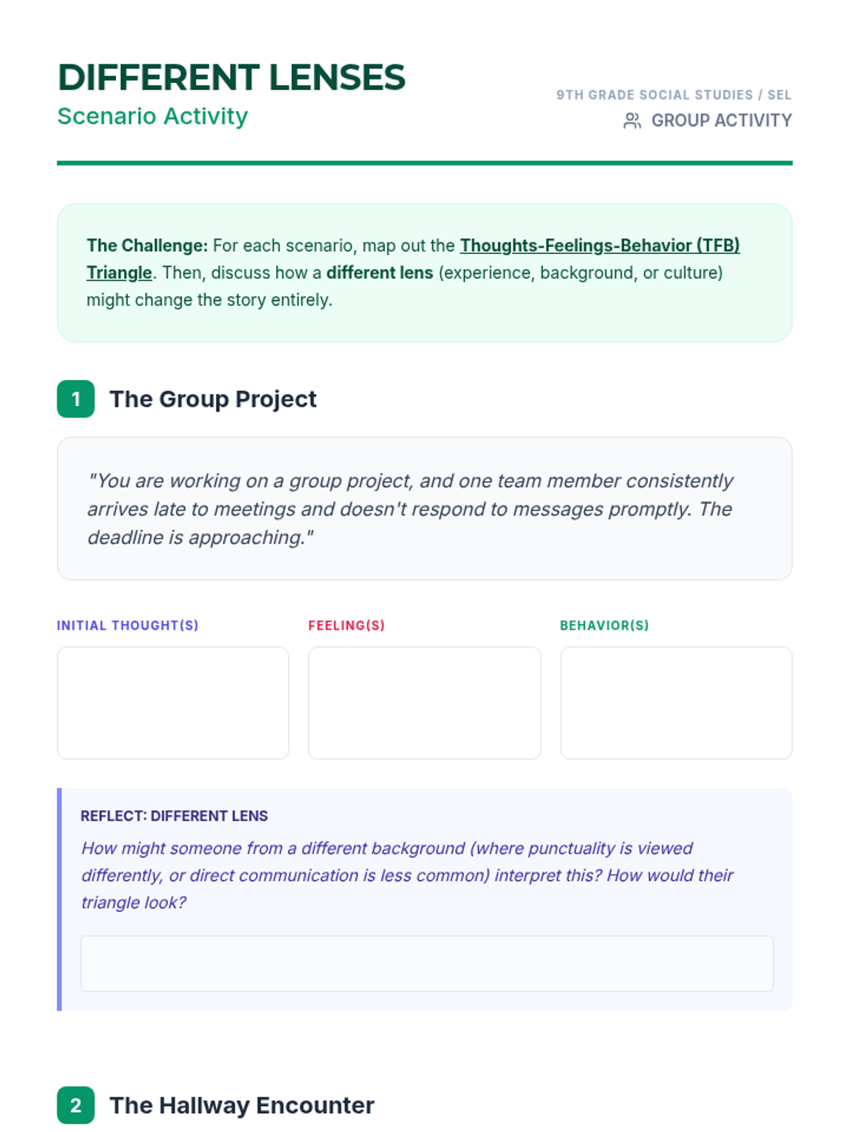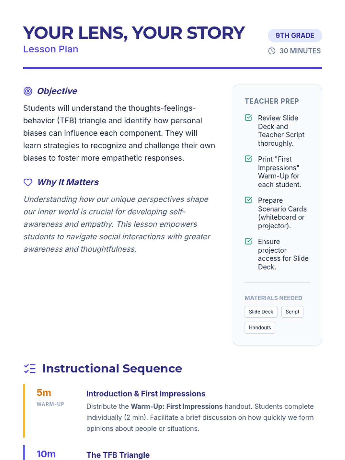 A 30-minute lesson for 9th graders exploring the Thoughts-Feelings-Behavior triangle and how personal lenses/biases influence our reactions and interactions.