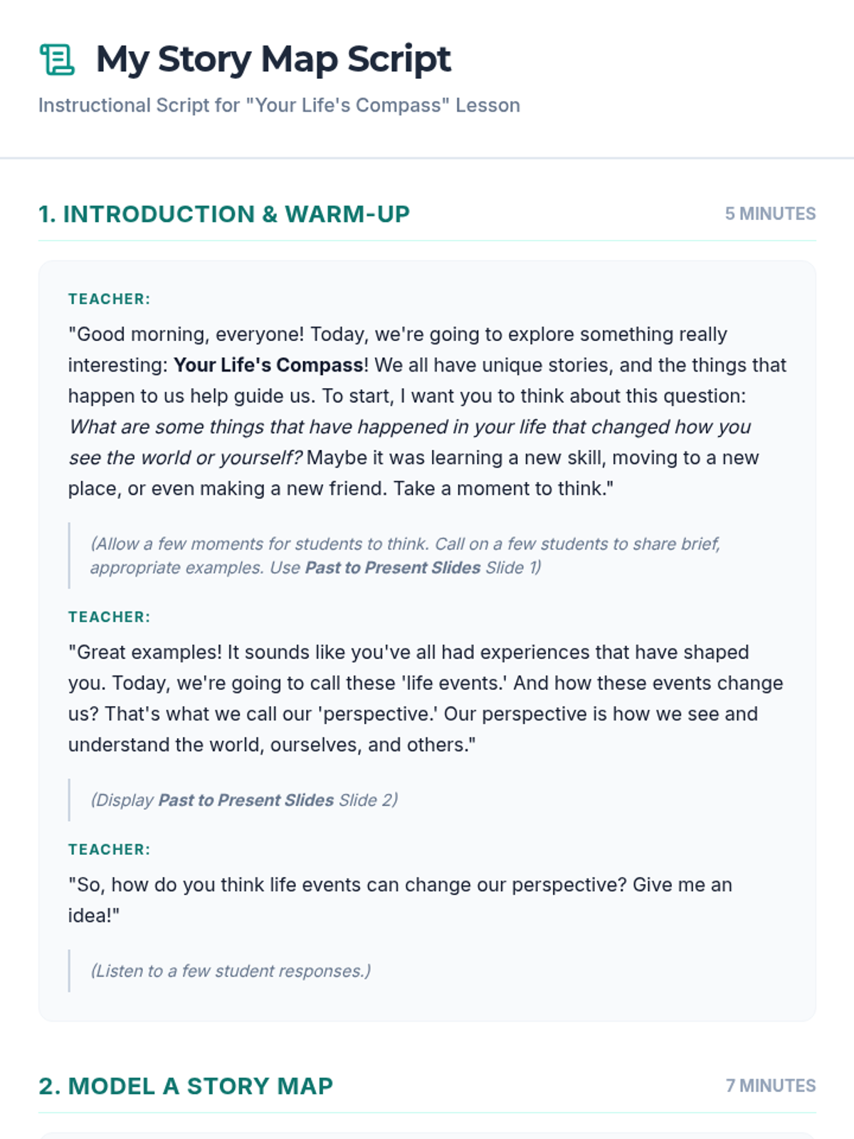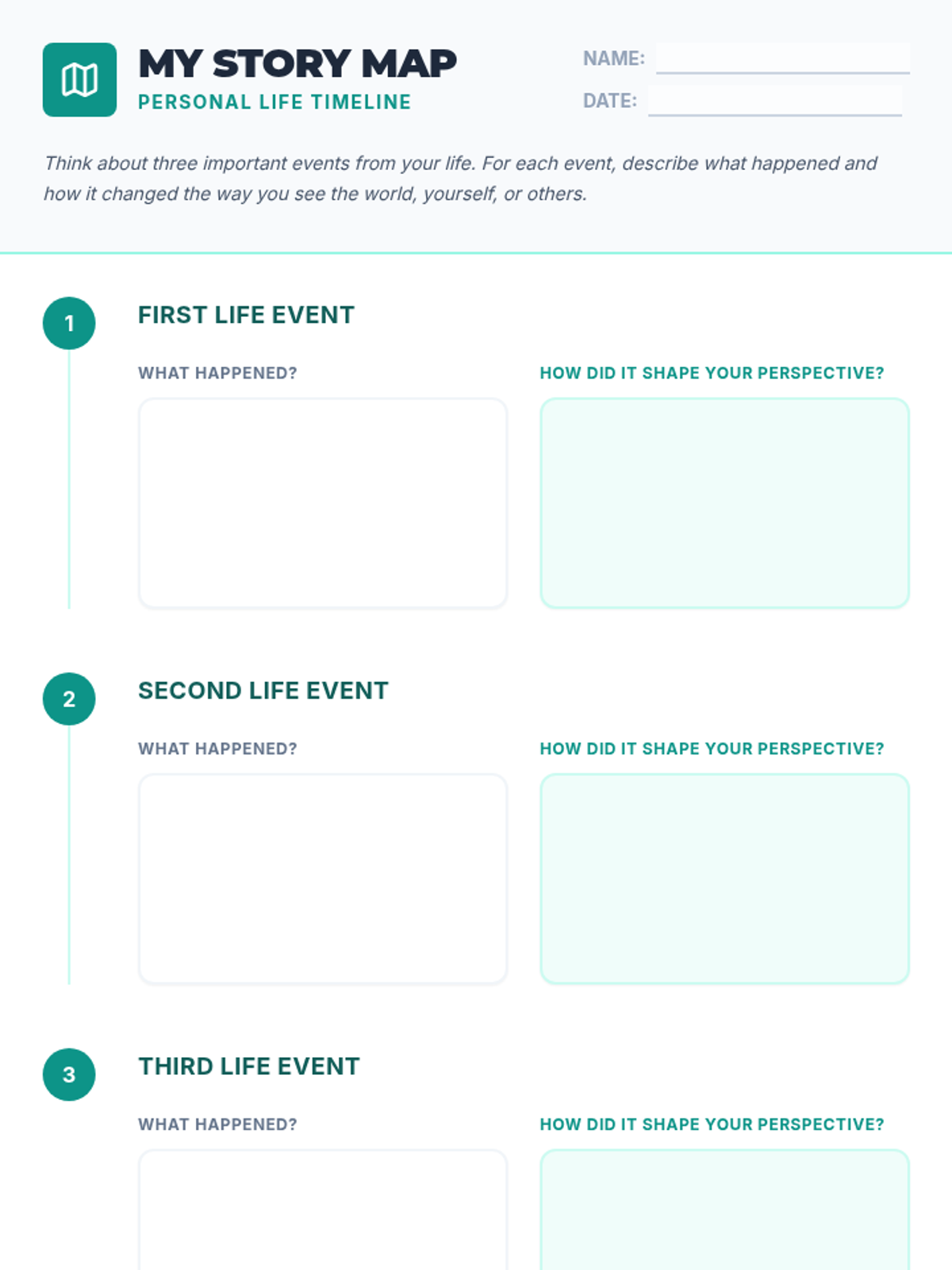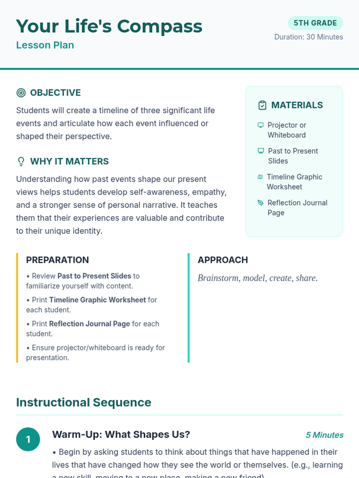 A 30-minute self-awareness lesson for 5th graders that uses a story map metaphor to explore how significant life events shape personal perspective. Students reflect on their past, share with peers, and journal about their unique identity.