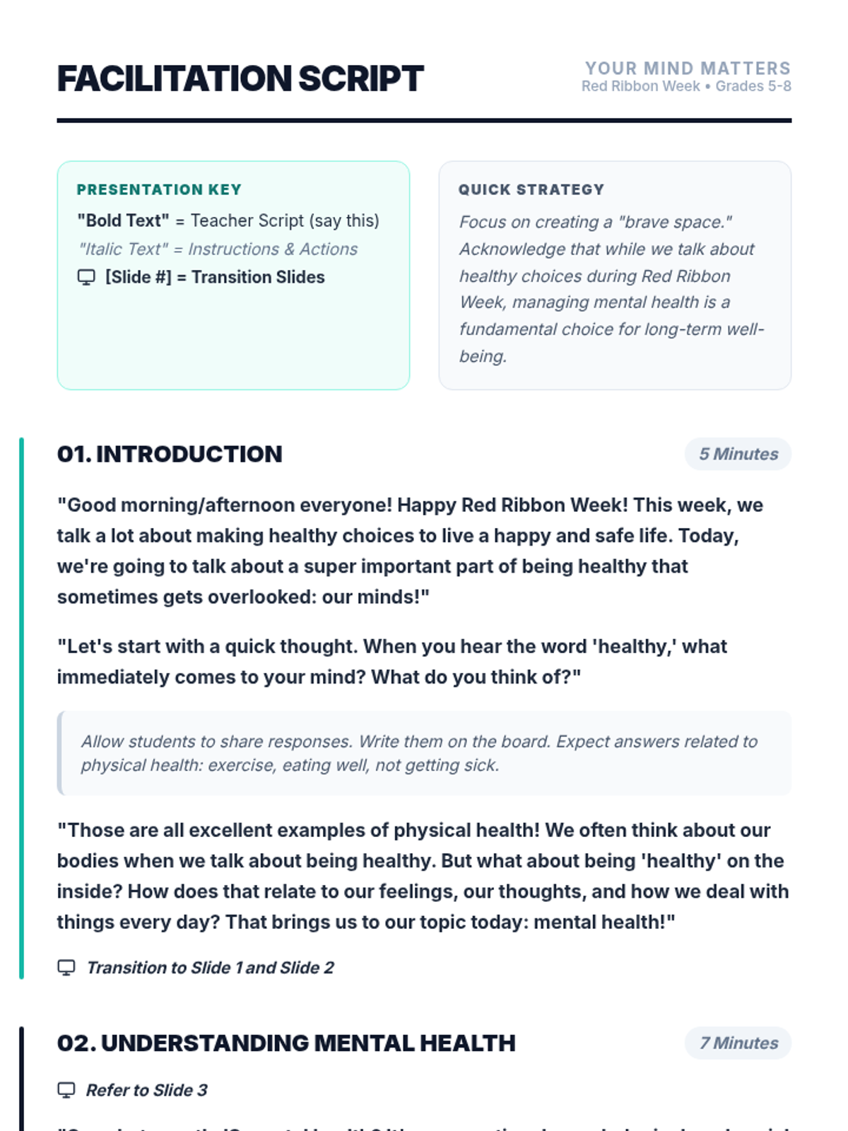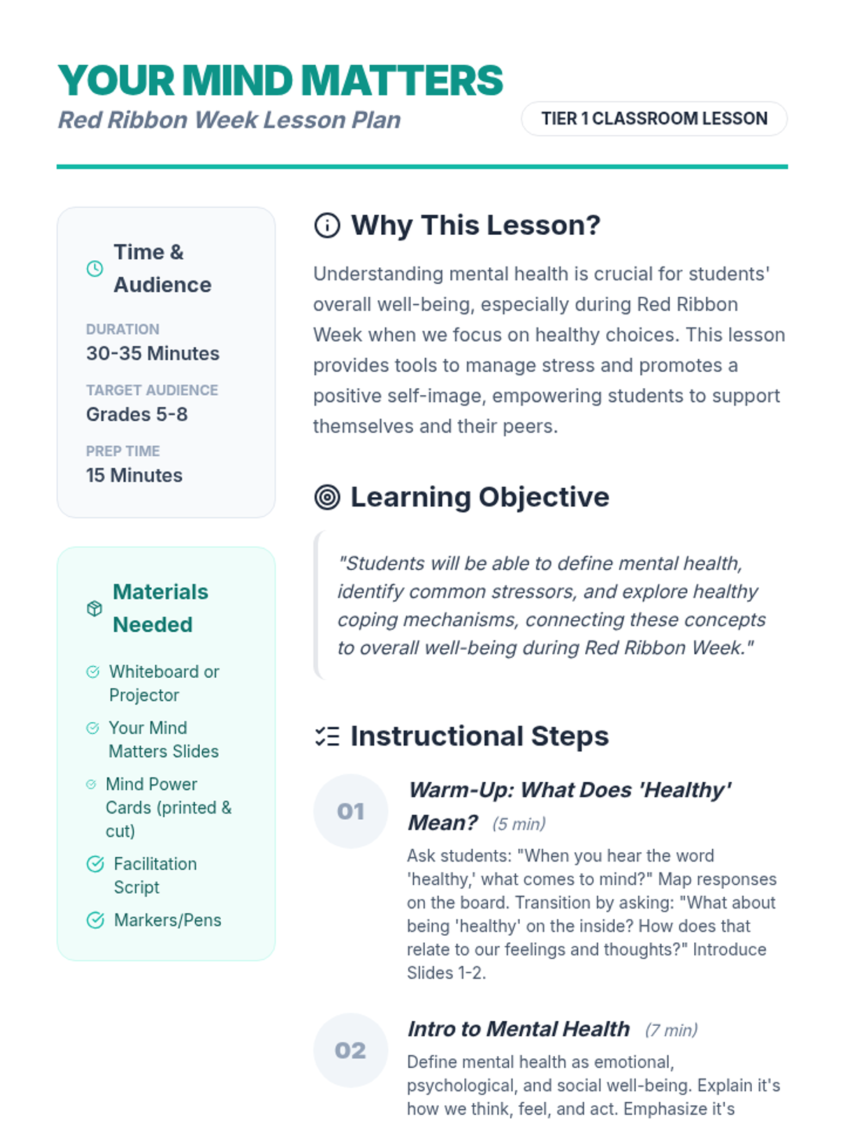 A single-session lesson for 5th-8th grade students focusing on mental health, stressors, and healthy coping strategies during Red Ribbon Week.