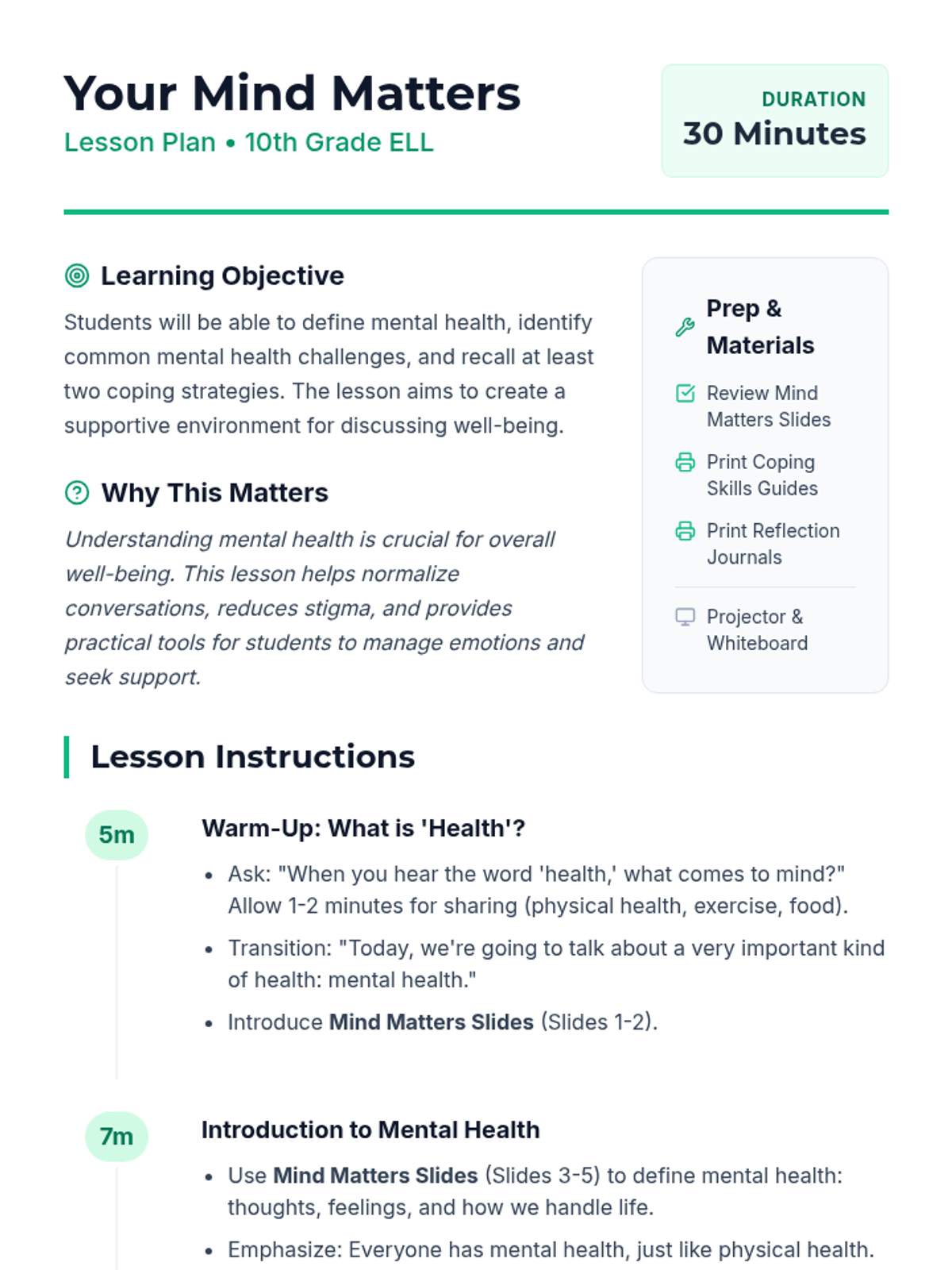 This 30-minute lesson introduces 10th Grade ELL students to key mental health concepts and coping strategies through interactive slides, discussion, and personal reflection.