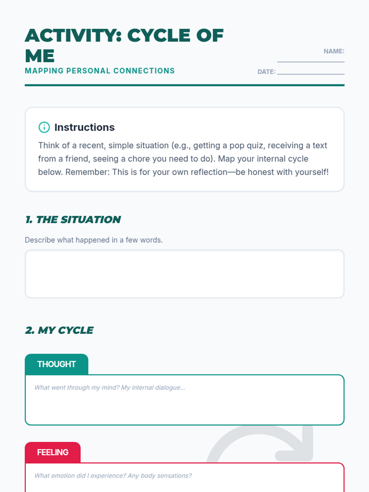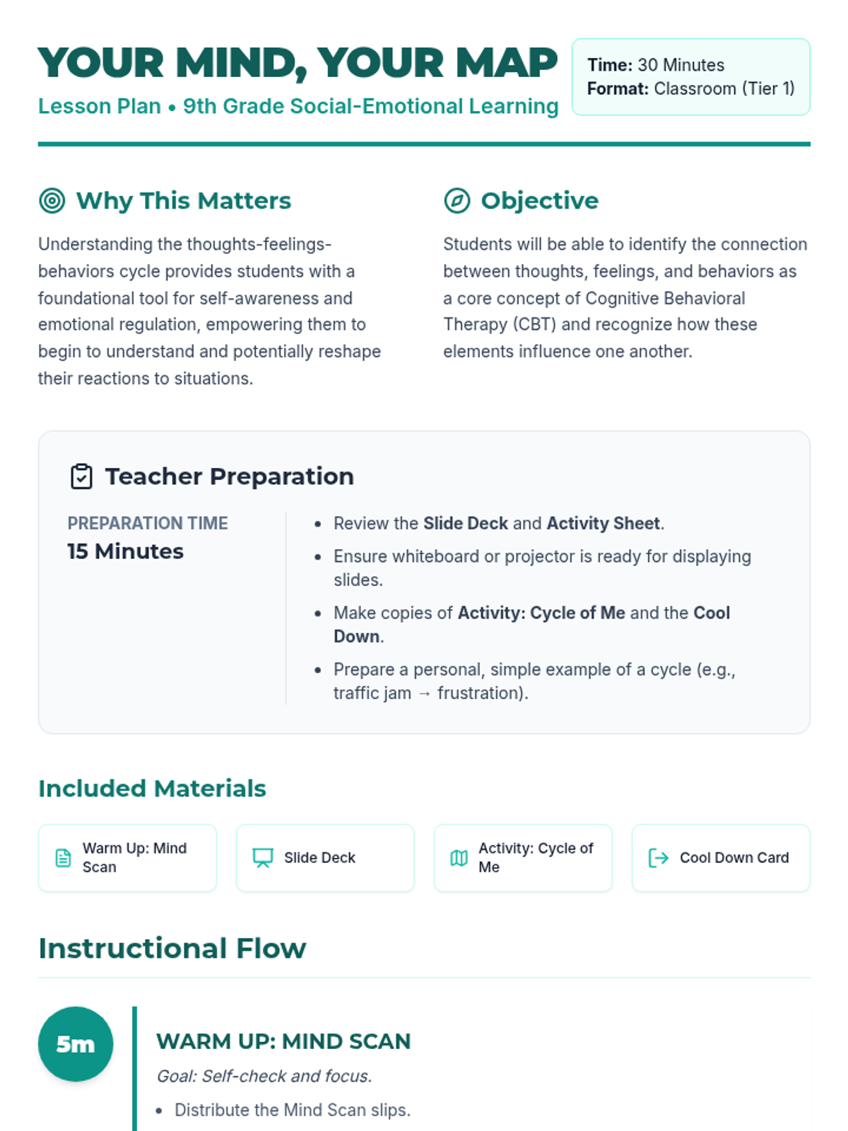 A 30-minute introductory lesson for 9th graders on the CBT cycle of thoughts, feelings, and behaviors, using a mapping metaphor to help students navigate their emotional world.