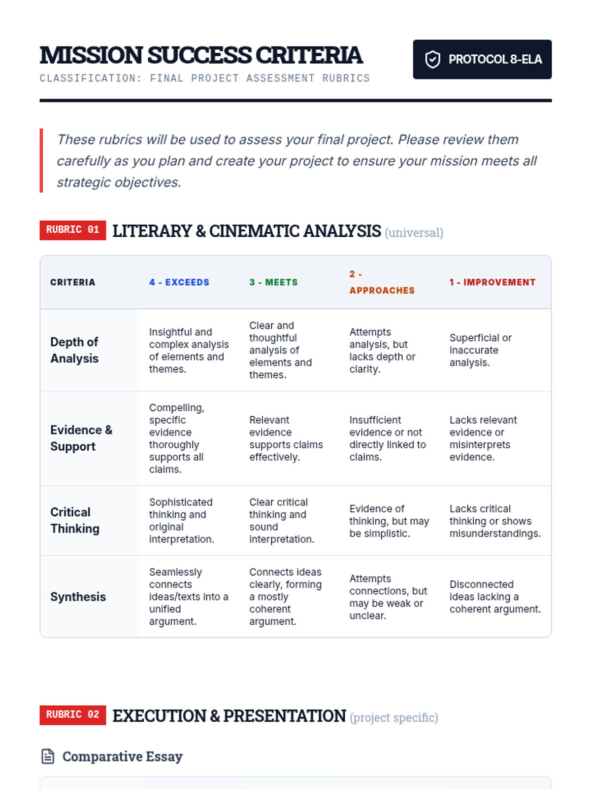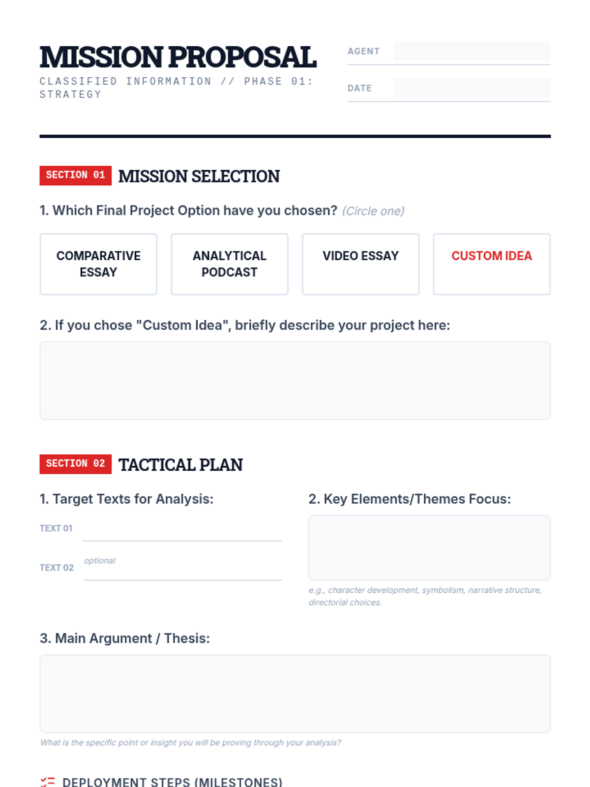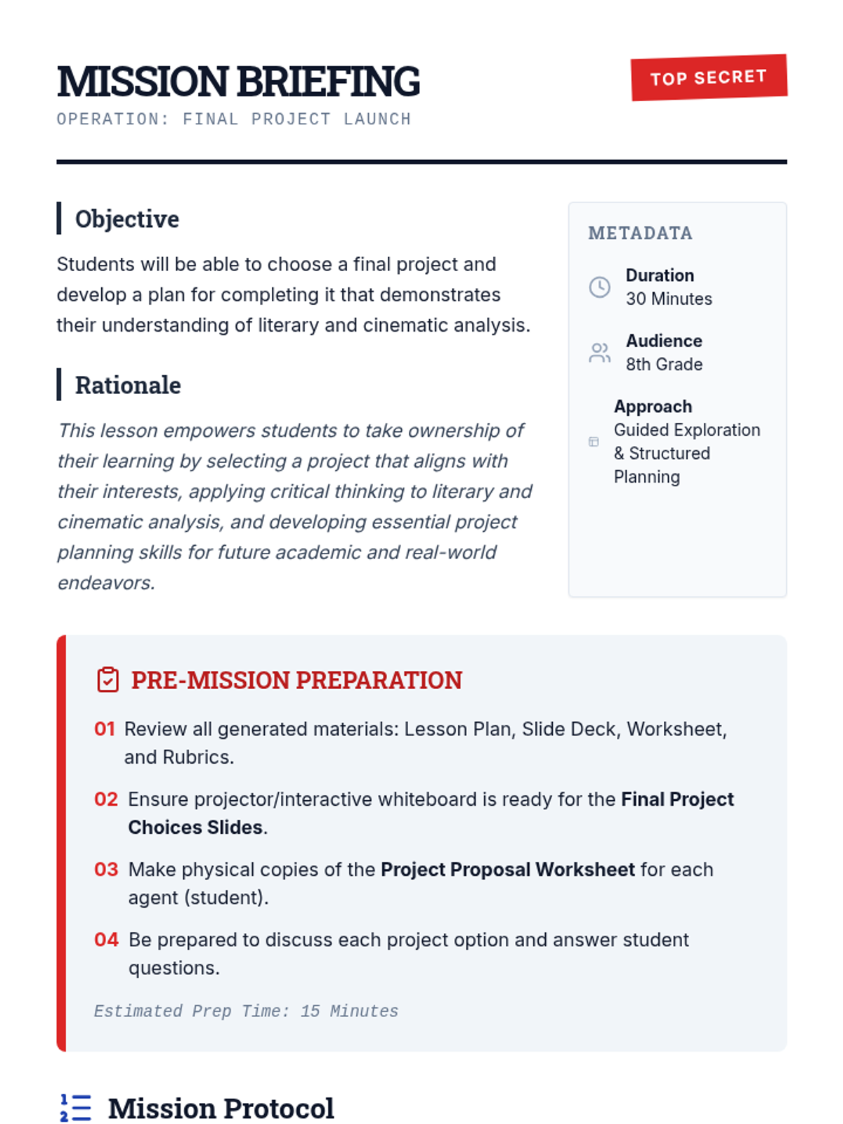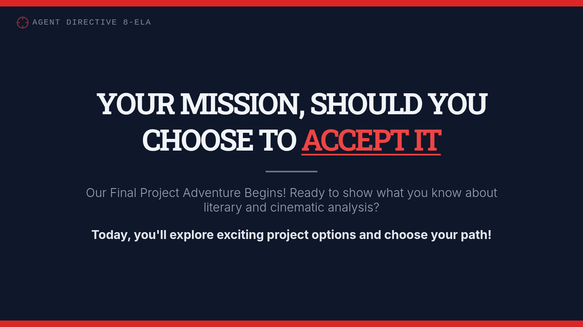 An 8th-grade lesson where students select a final project mission and develop a project plan for literary and cinematic analysis. Students explore diverse creative options like podcasts, video essays, and comparative analysis.