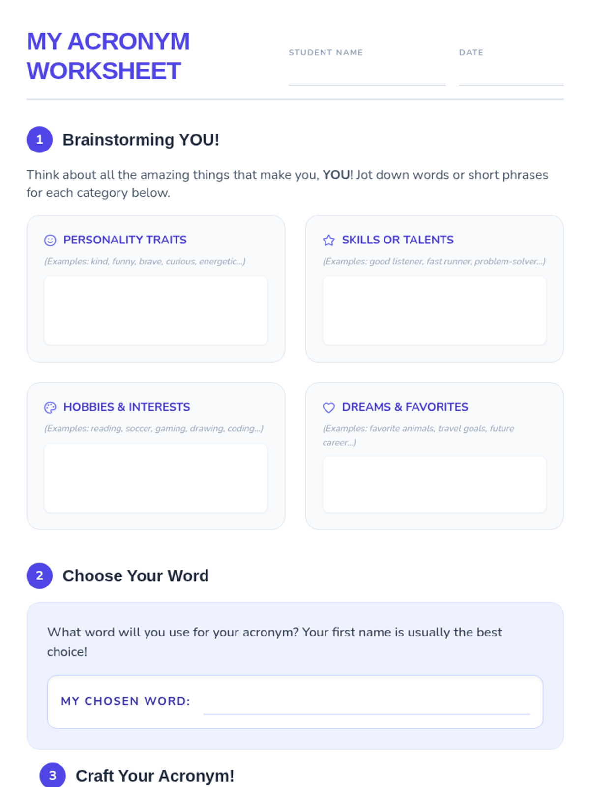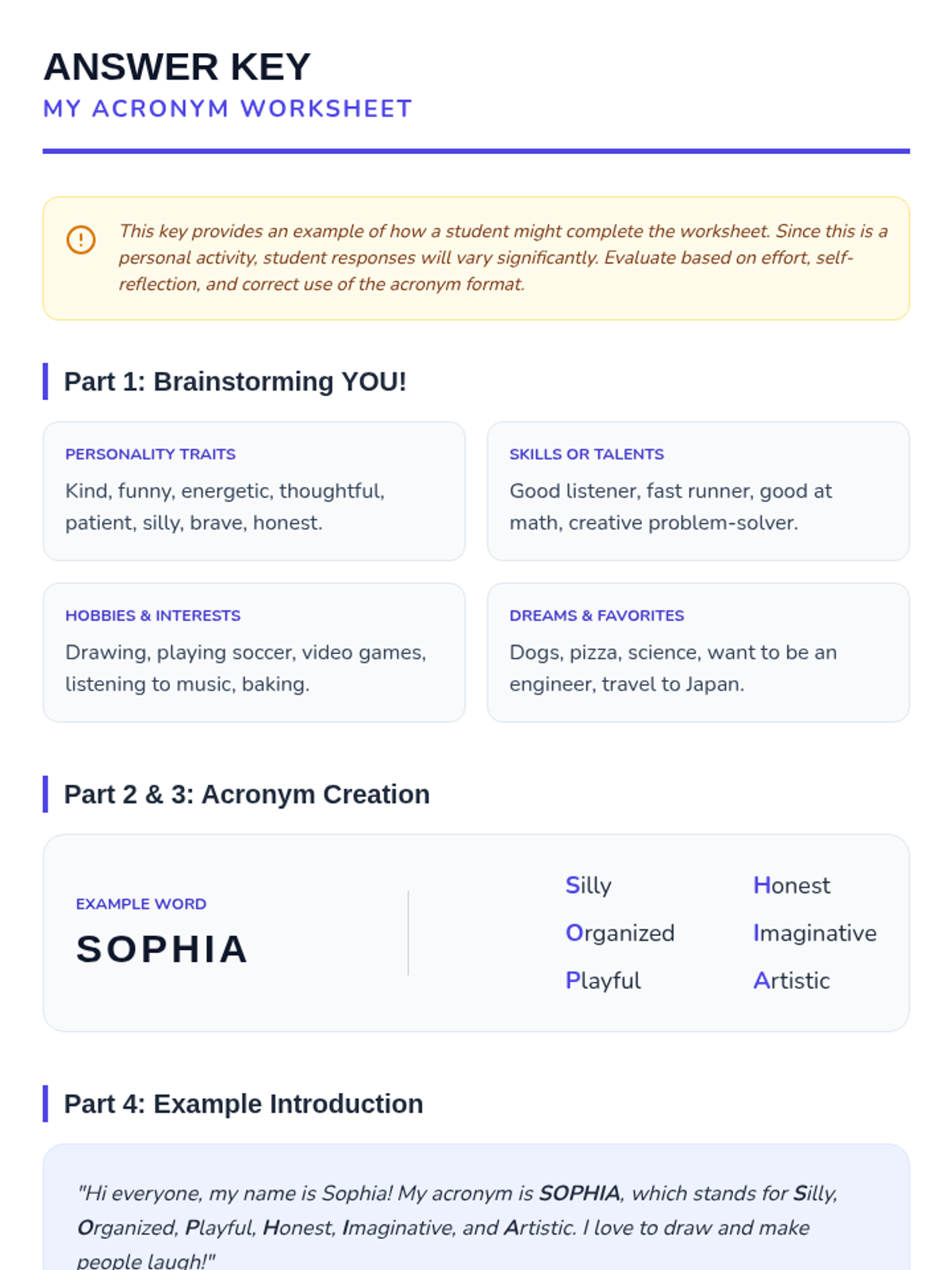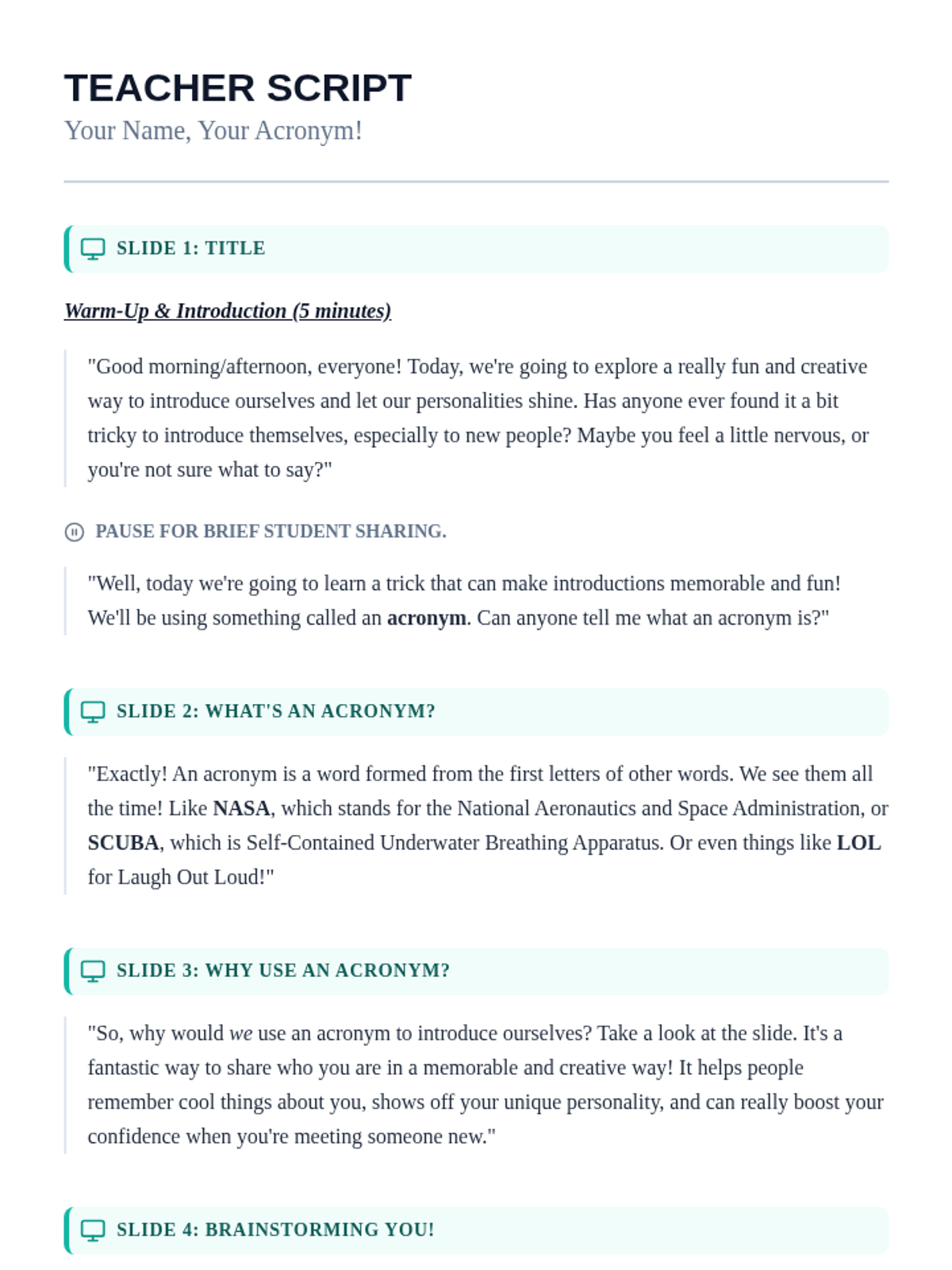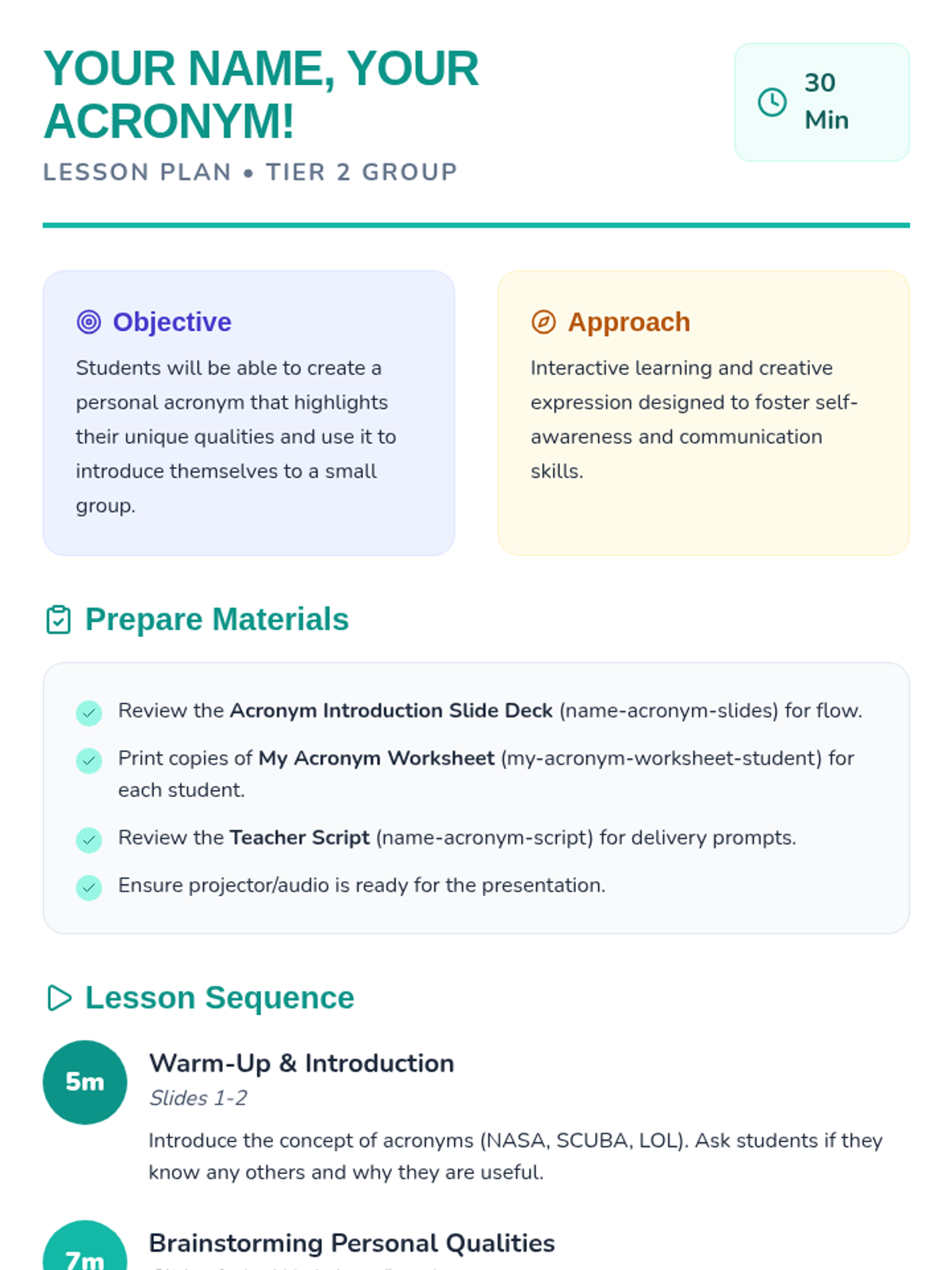 A fun, 30-minute introductory lesson where 6th-grade students create personal acronyms from their names to build self-awareness and public speaking confidence.