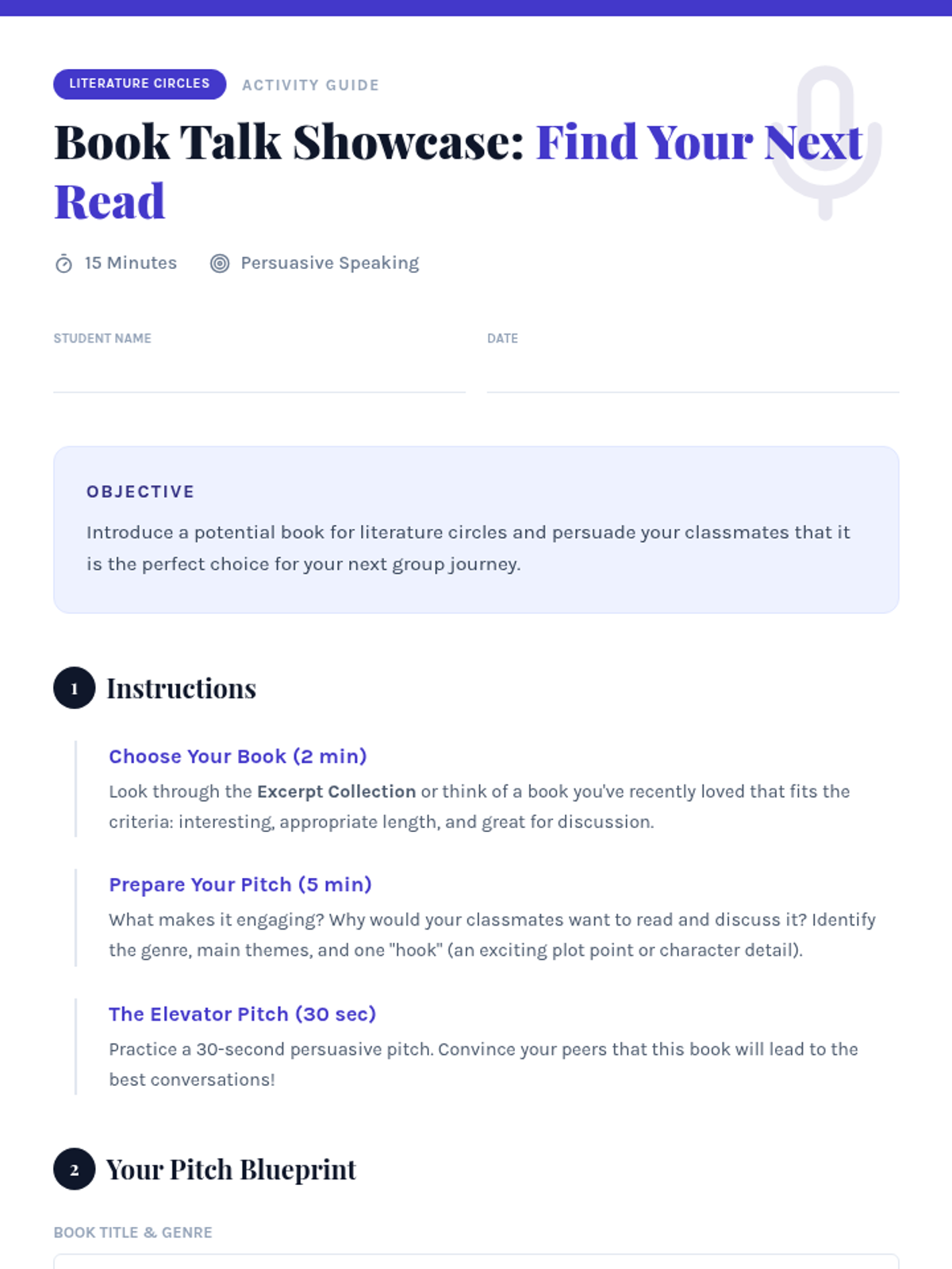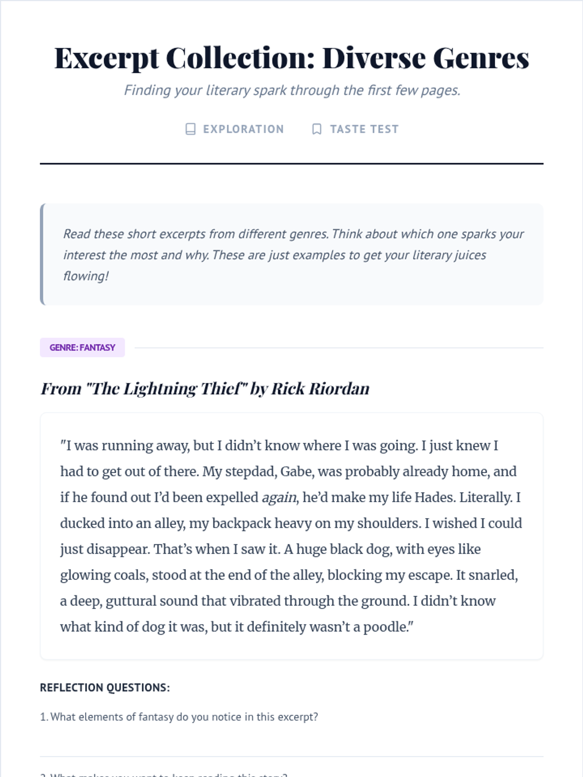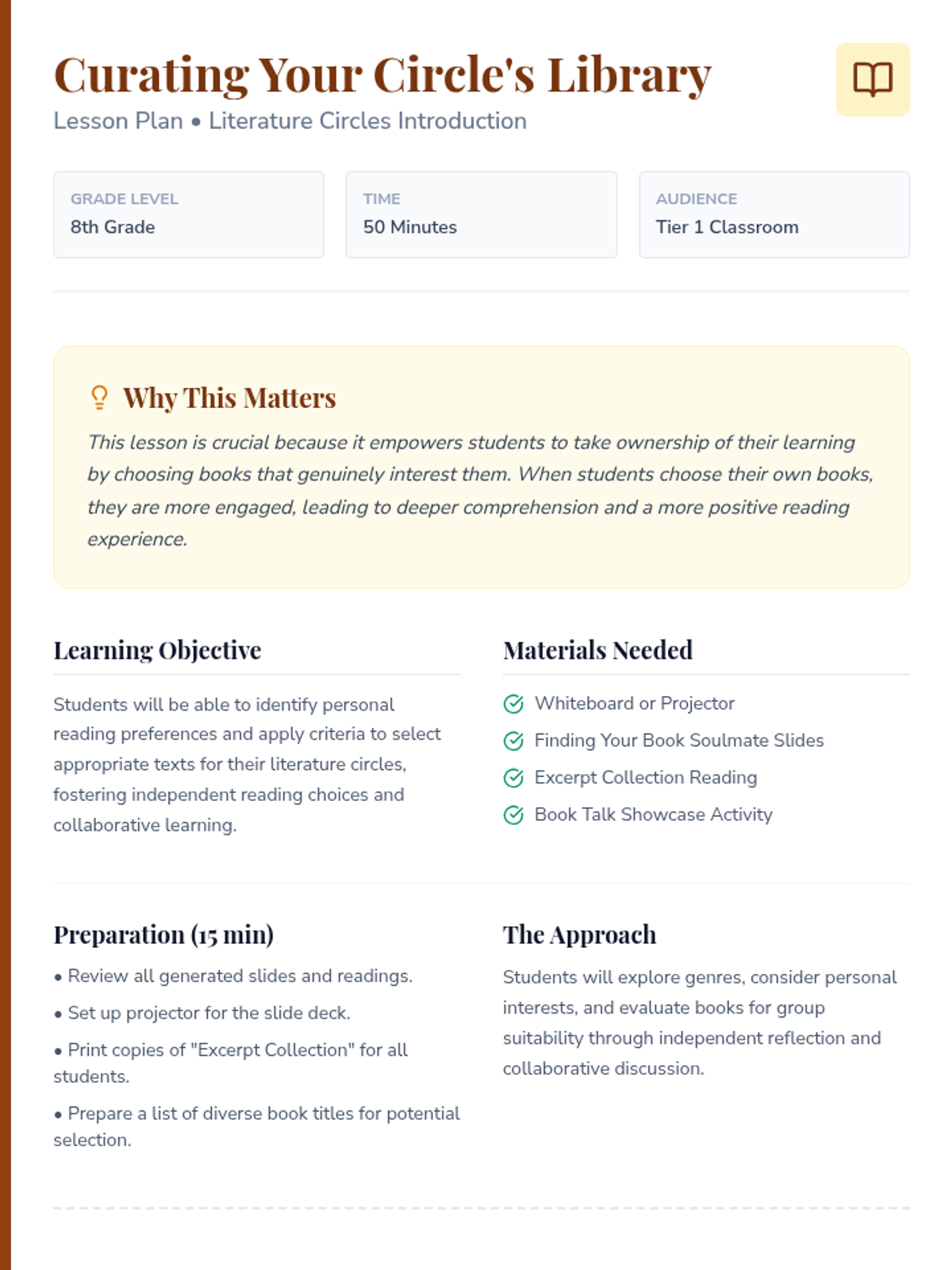 An 8th-grade lesson that empowers students to select engaging and appropriate texts for literature circles through genre exploration and personal interest assessment.