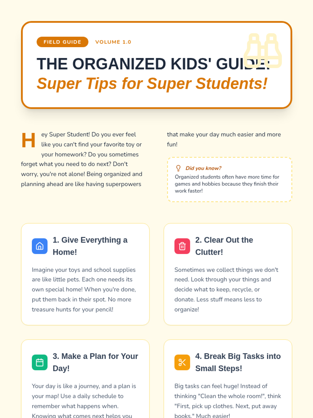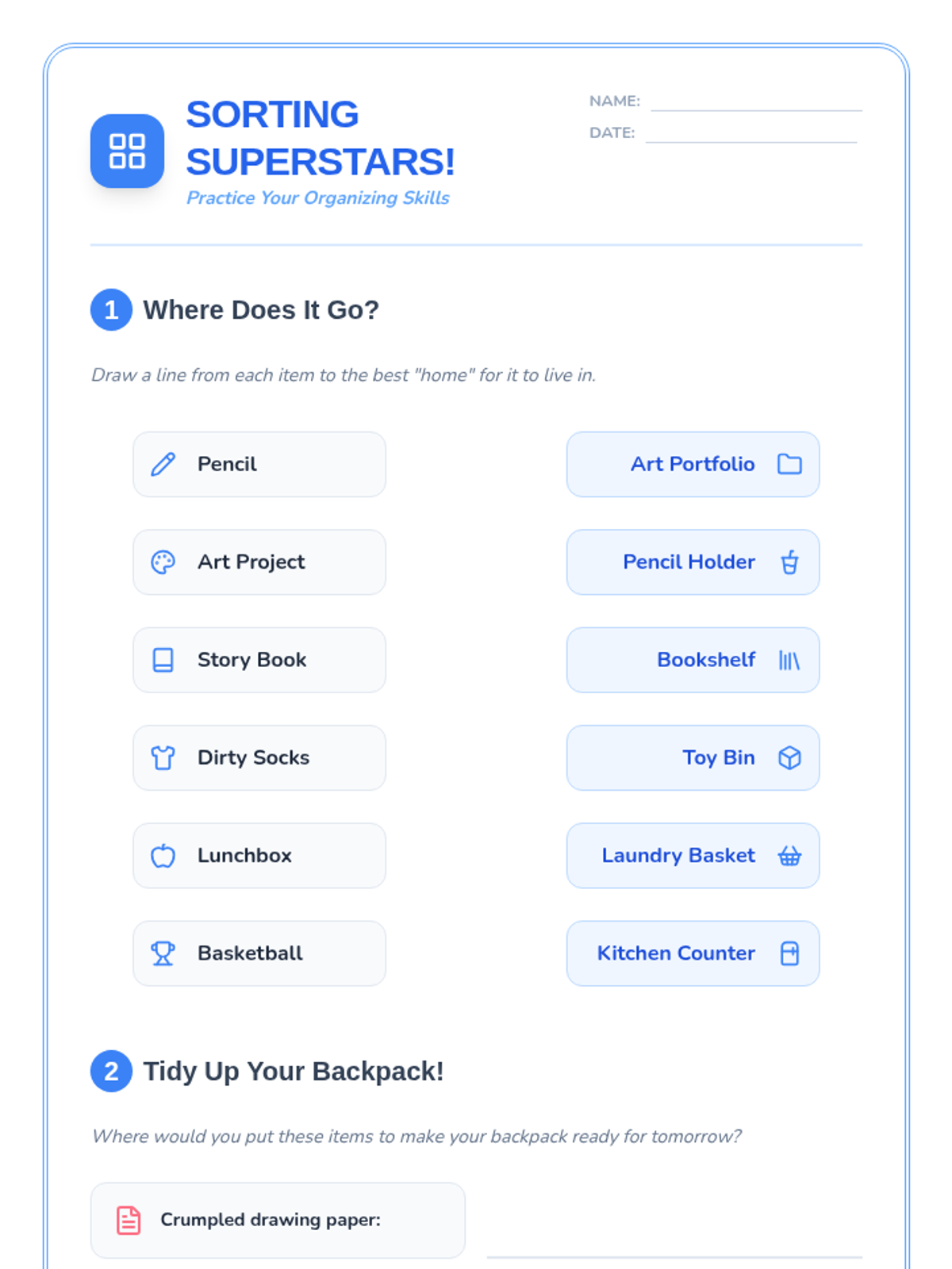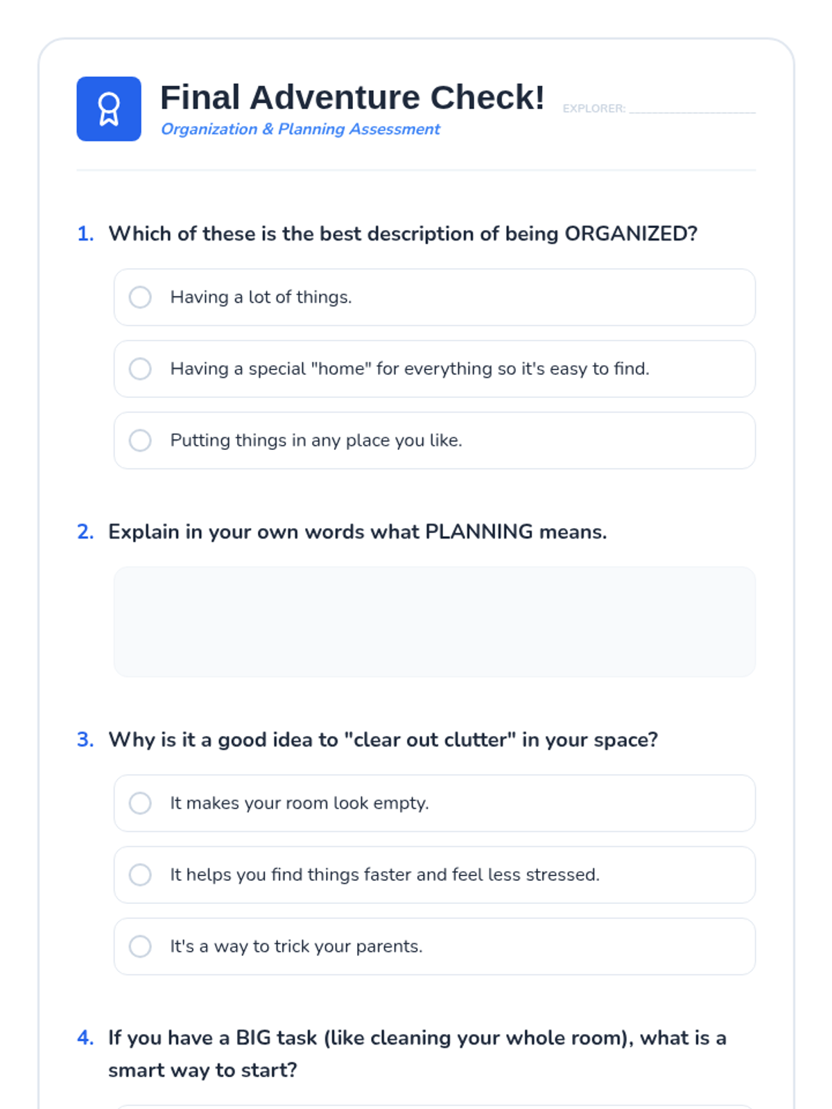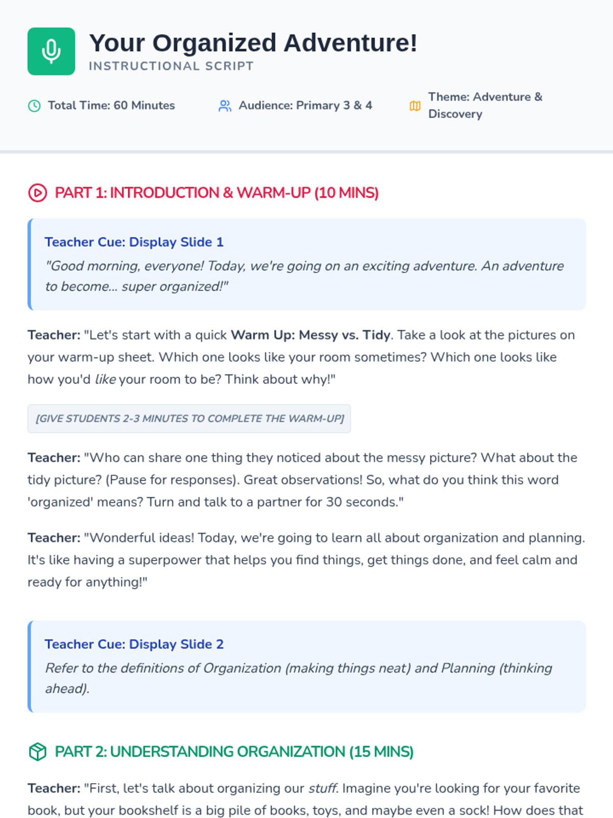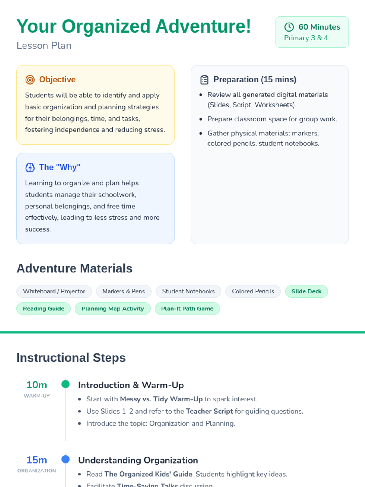 An engaging lesson for Primary 3 & 4 students to learn practical organization and planning strategies for their belongings, time, and tasks.