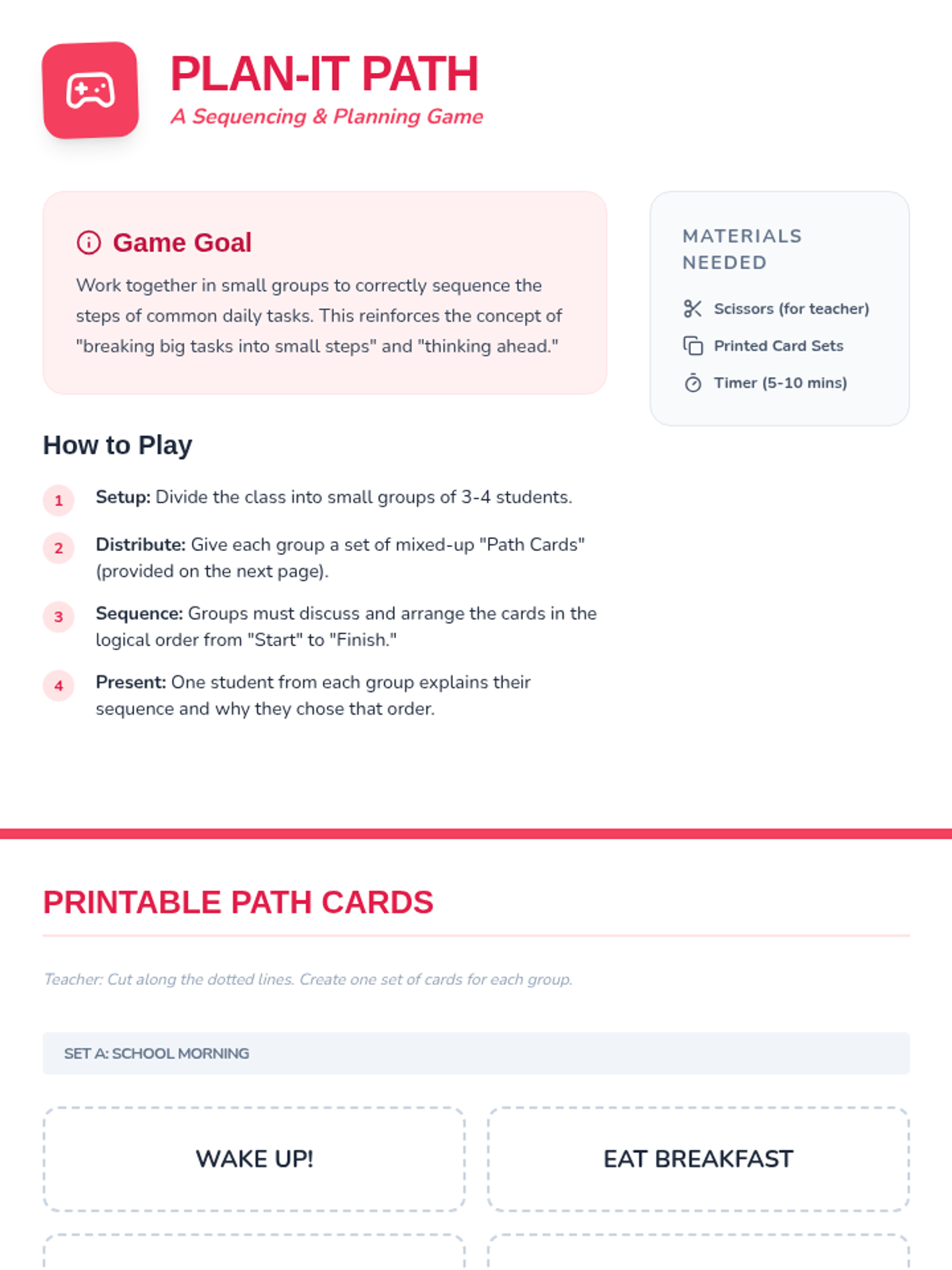 A fun, interactive lesson where 3rd graders practice identifying and applying self-regulation strategies through a board game and BINGO. Students will learn to recognize emotional triggers and choose appropriate 'calm-down' tools.
