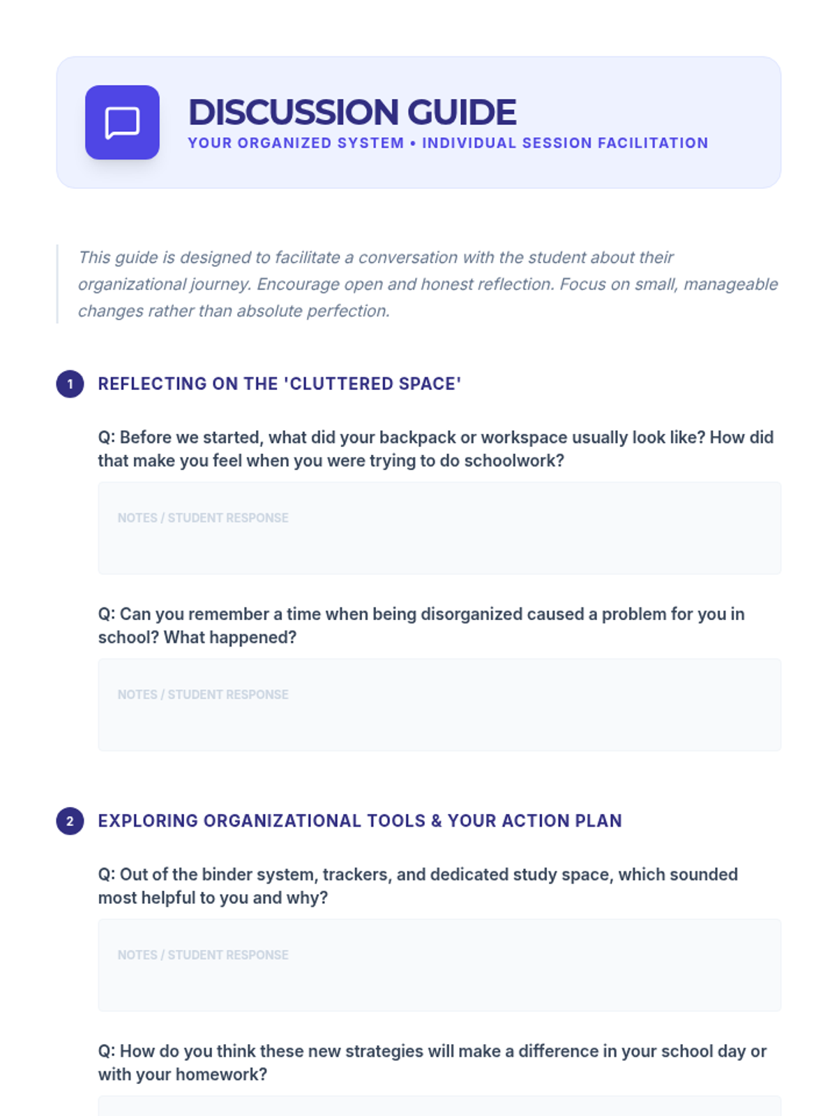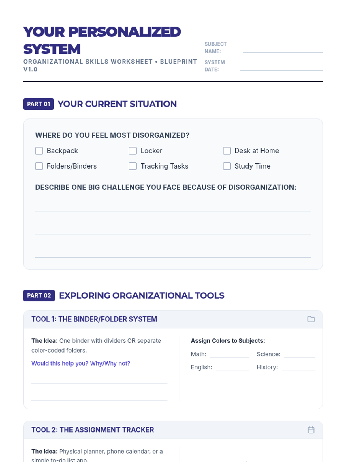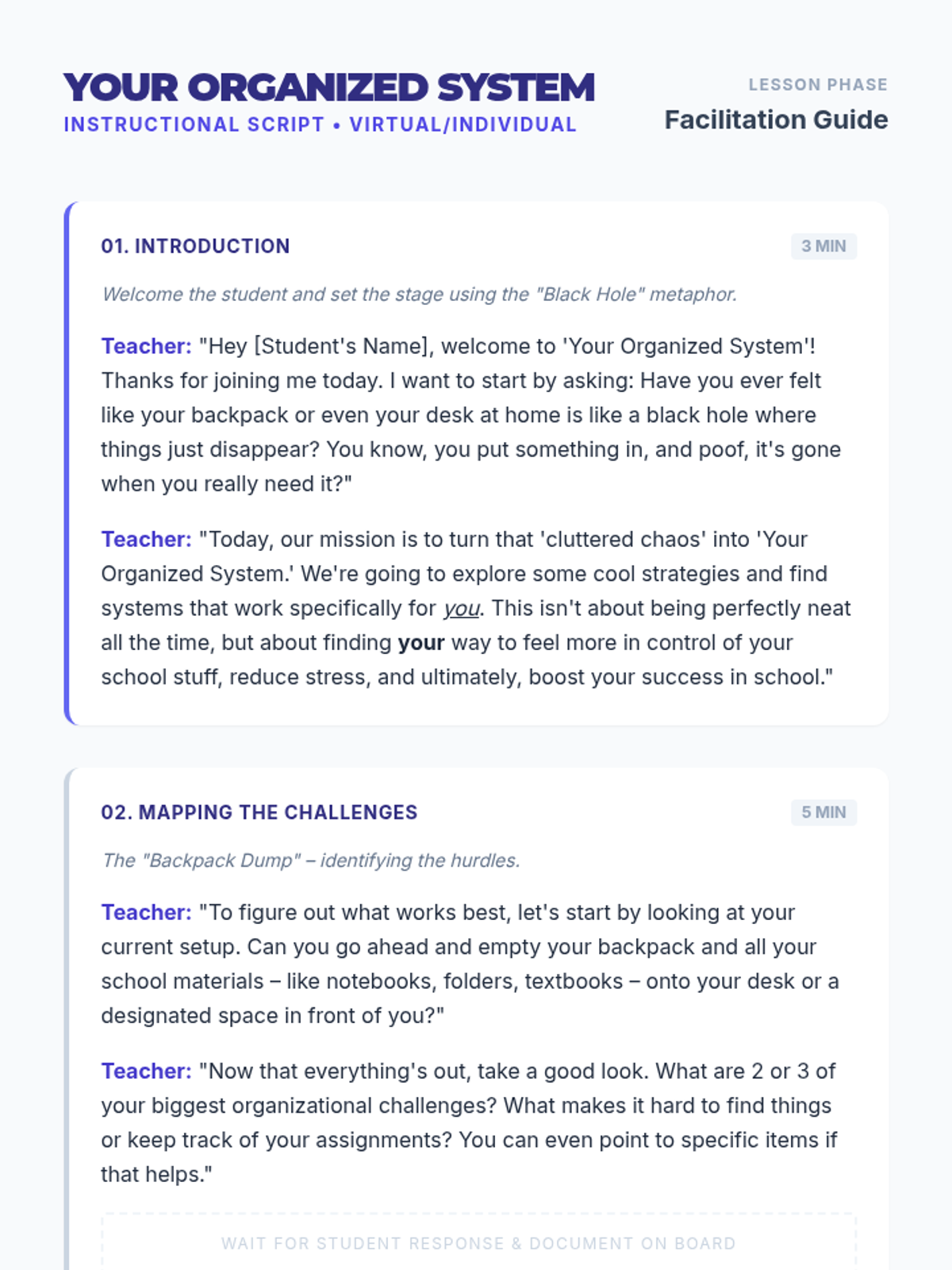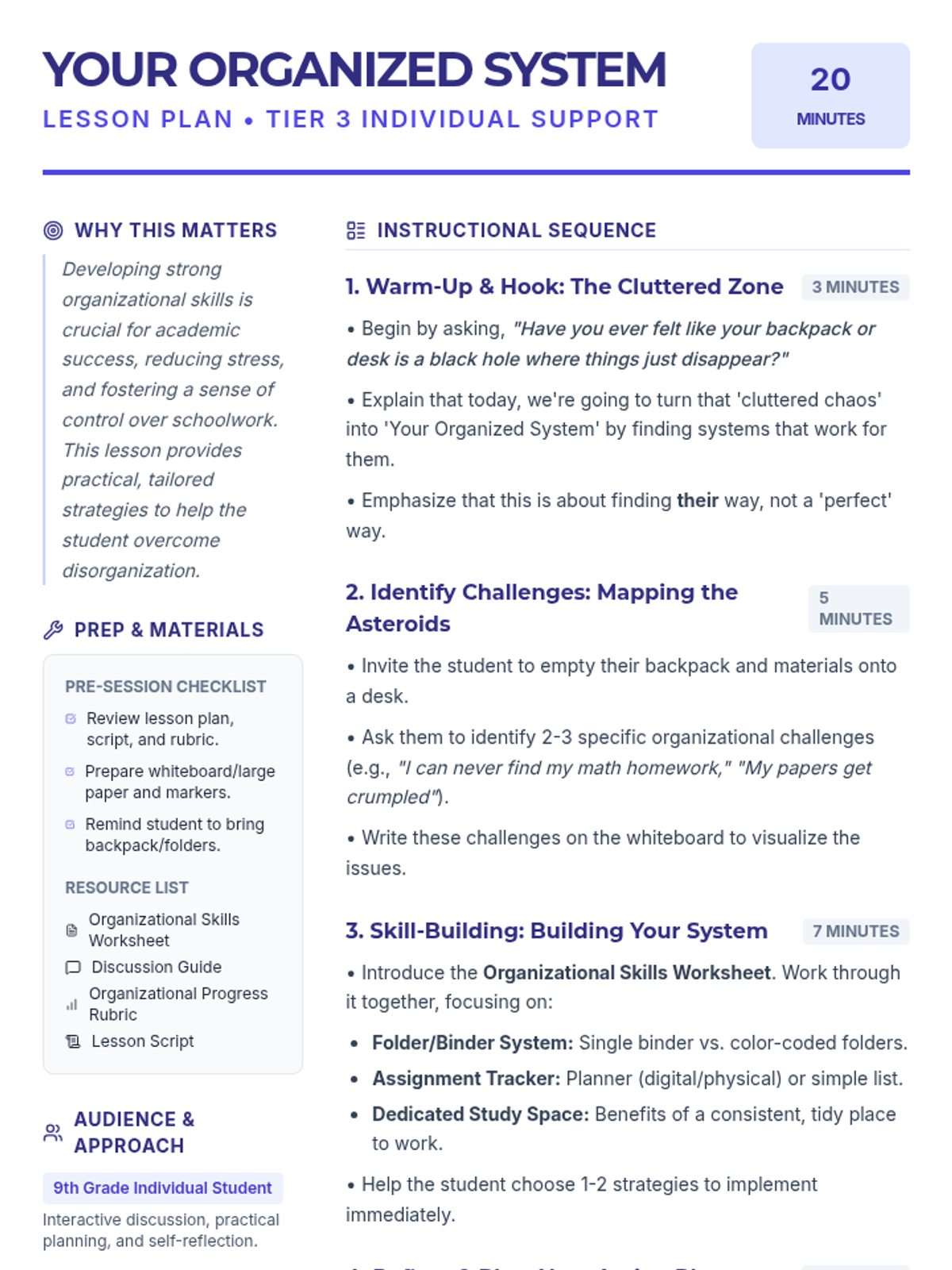A 20-minute Tier 3 individual lesson for 9th graders focusing on developing personalized organizational systems to manage school materials and assignments effectively.
