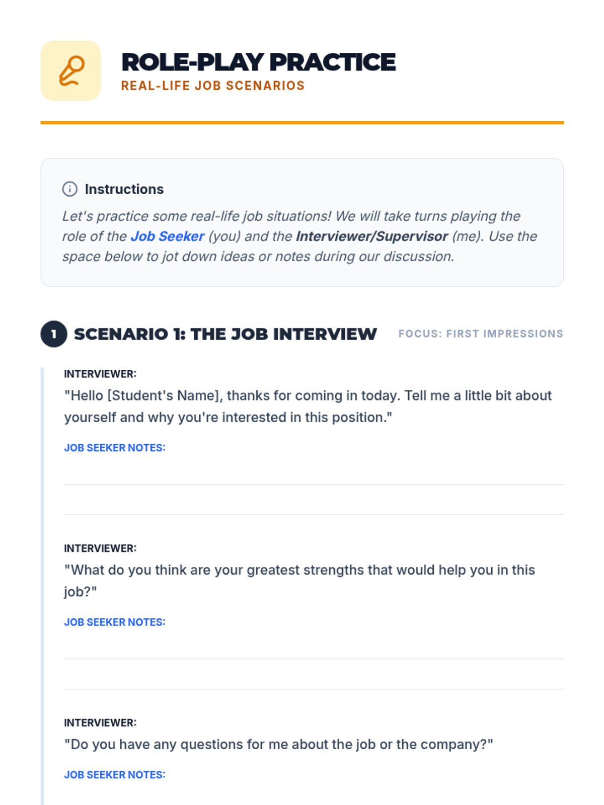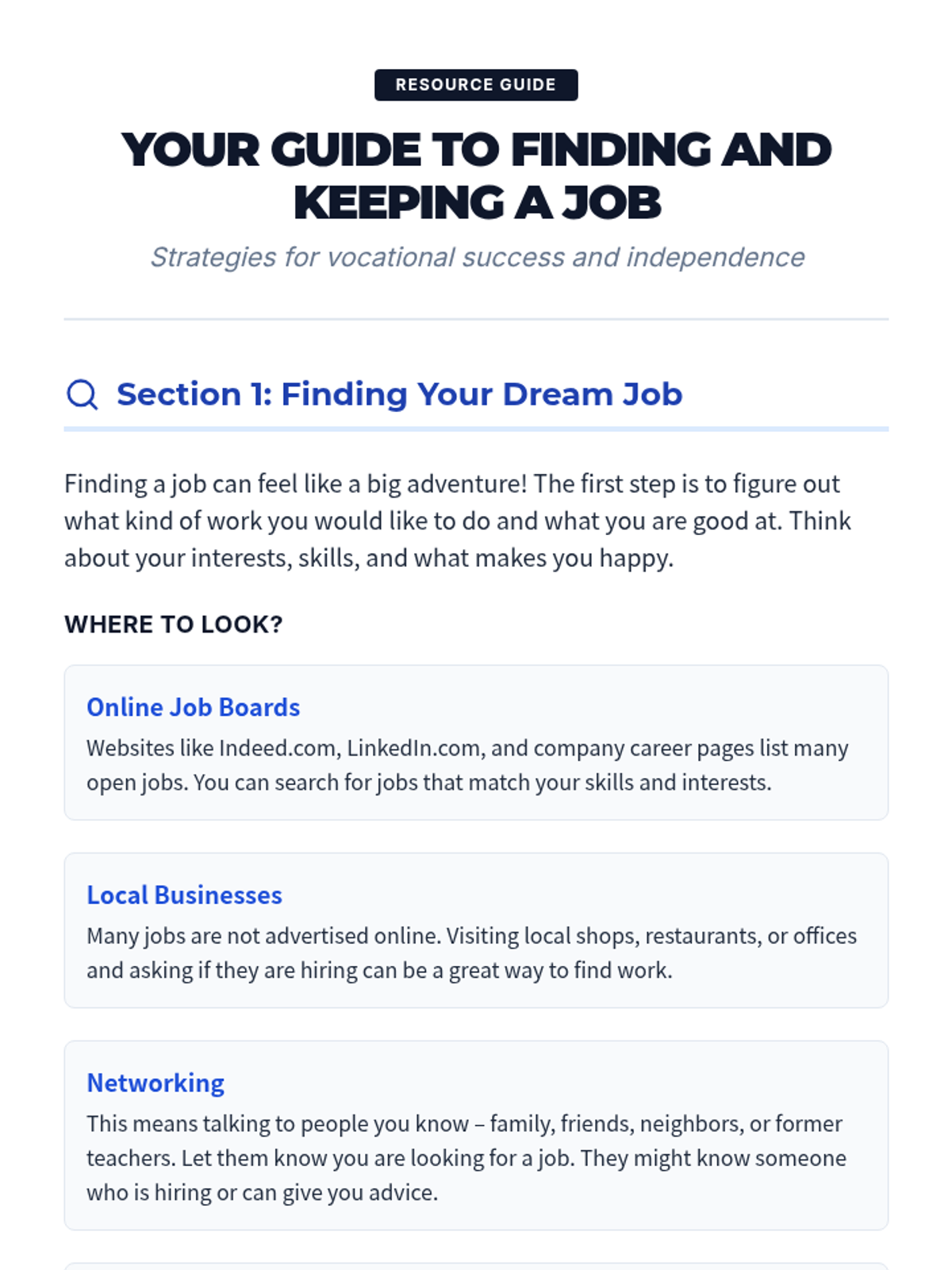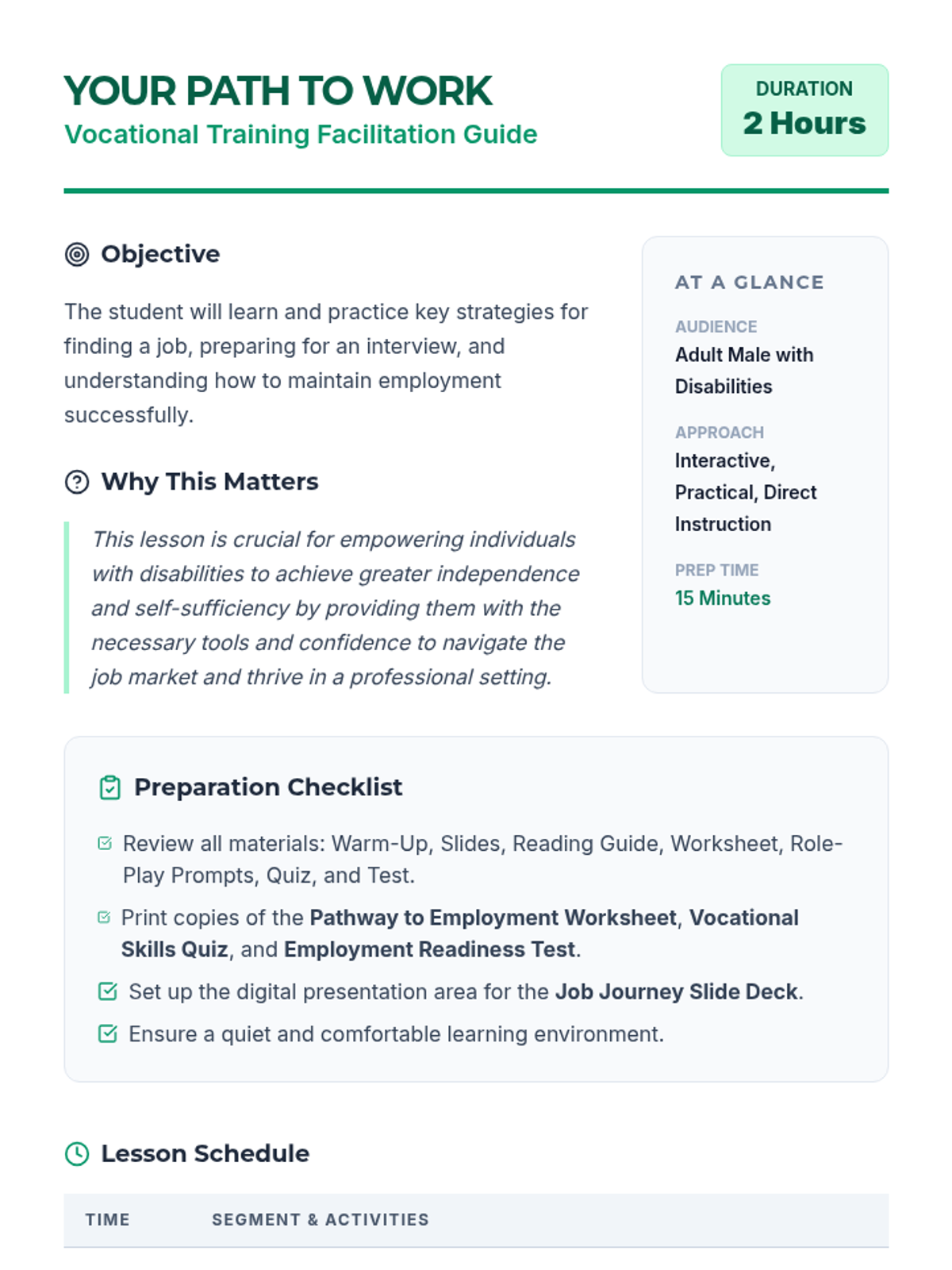 This 2-hour vocational training lesson guides students through job search strategies, interview preparation, and workplace retention skills, specifically designed for individuals with disabilities.
