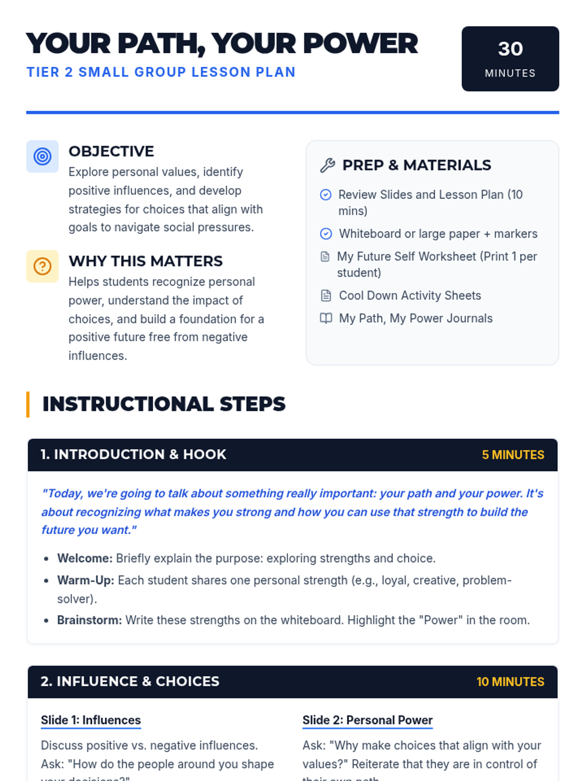 A 30-minute Tier 2 small group lesson for middle and high school students to explore personal values, navigate social pressures, and build a positive future identity.
