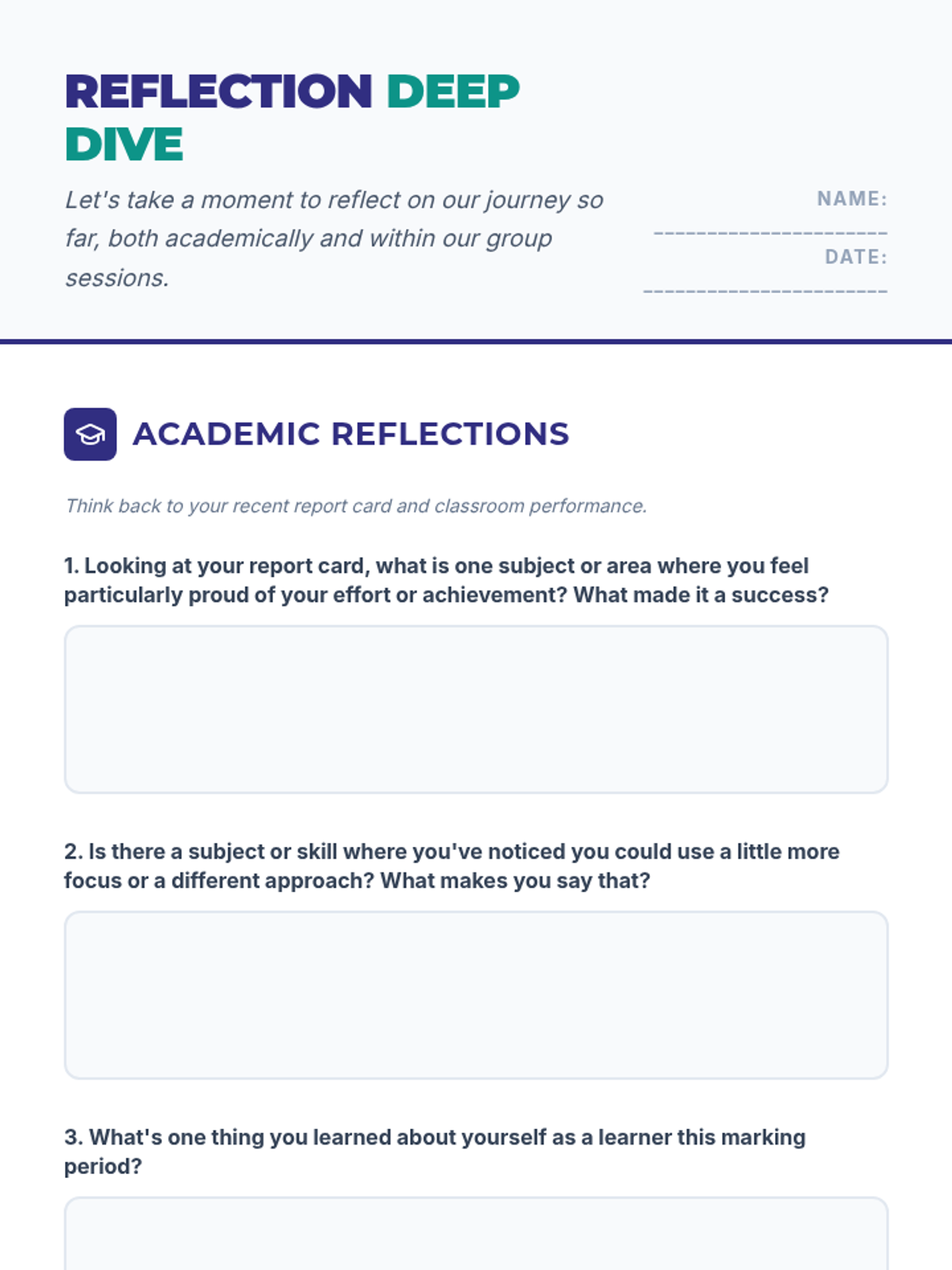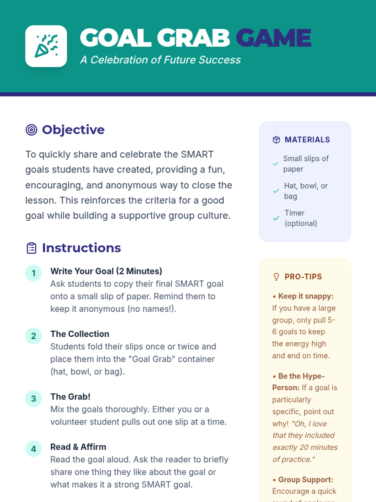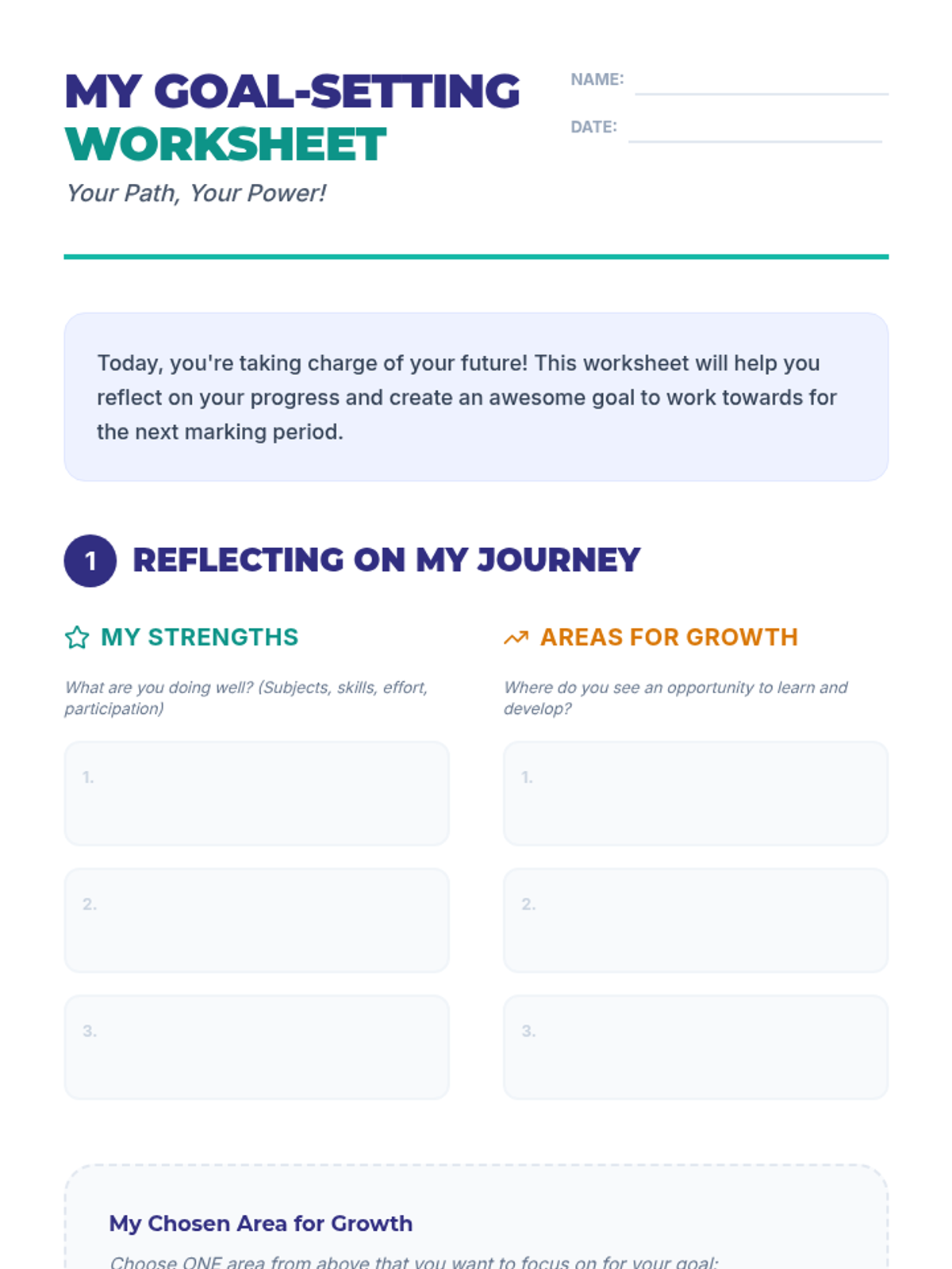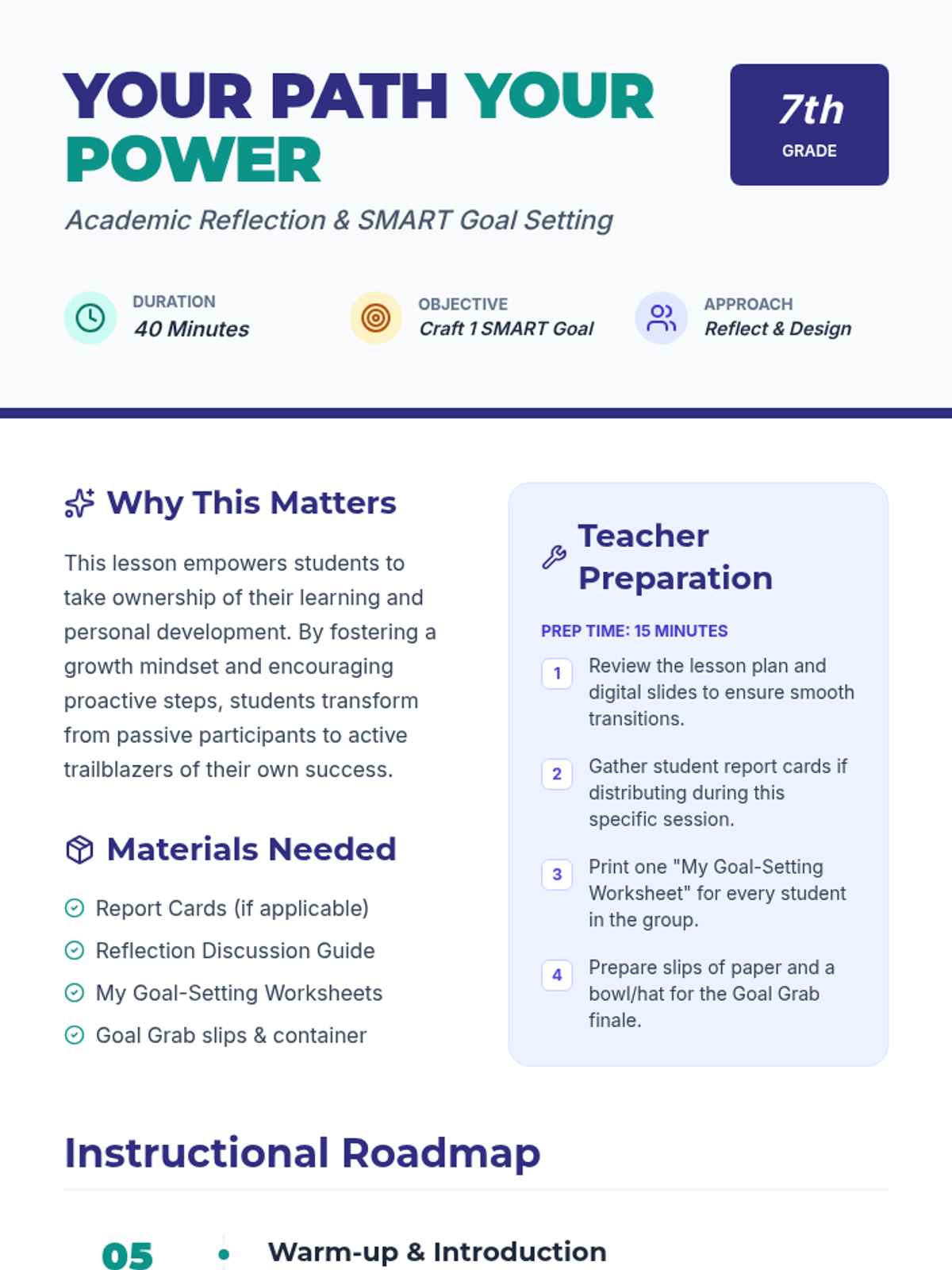 A 40-minute reflective lesson for 7th graders to review academic progress and set actionable SMART goals for the upcoming marking period.