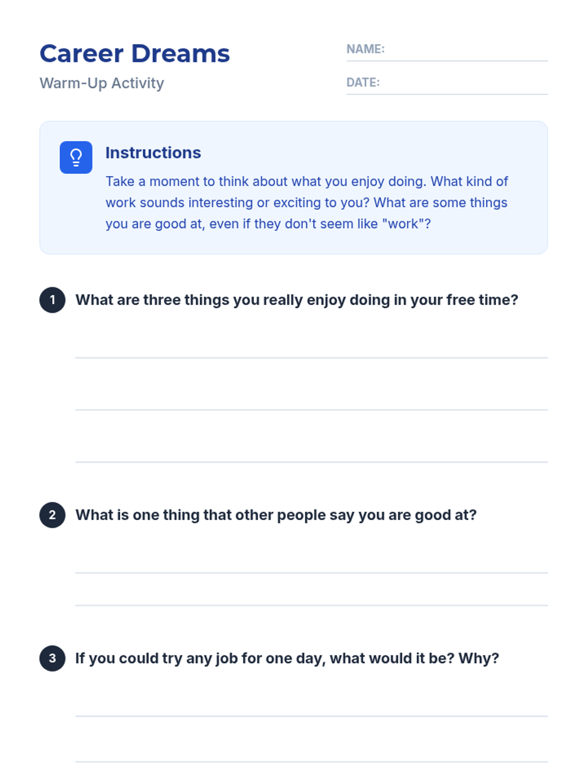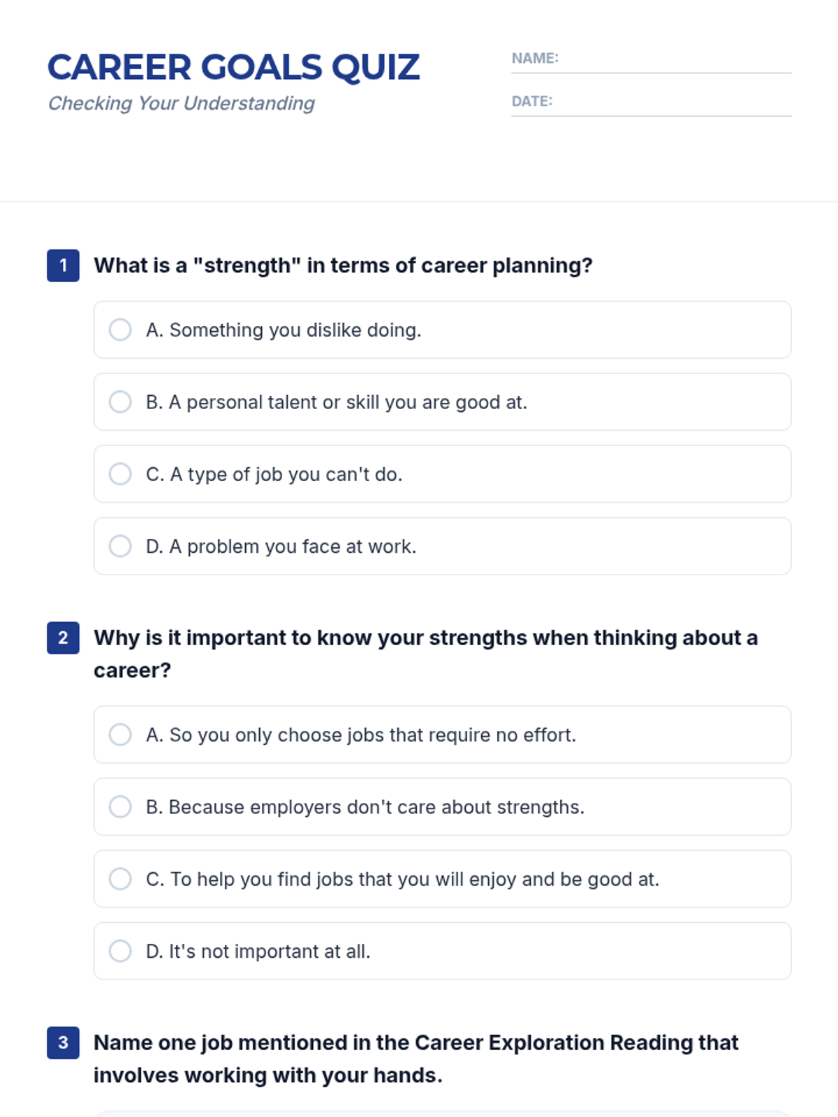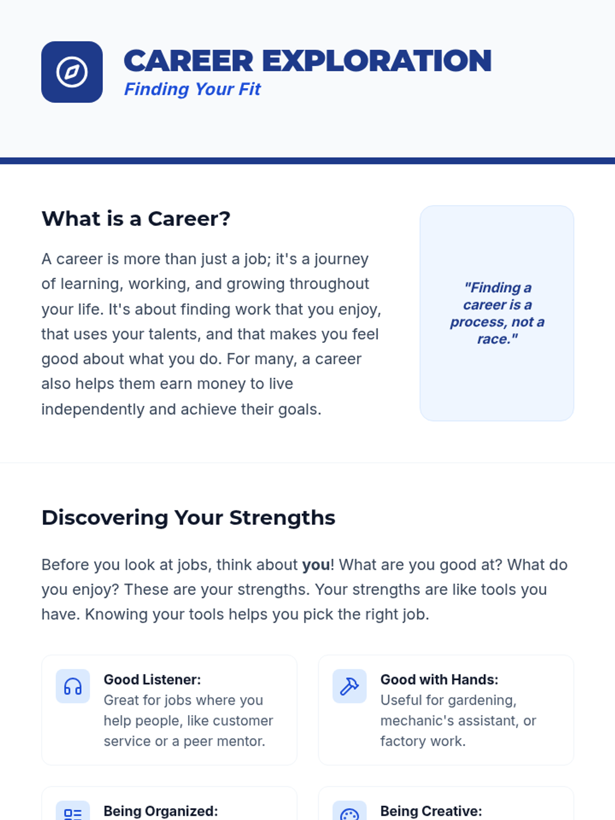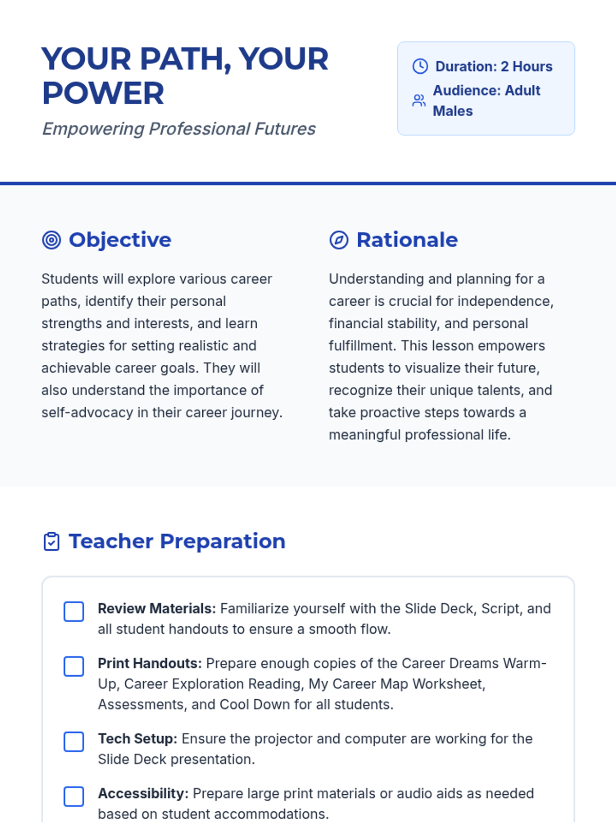 A 2-hour lesson designed for adult males with disabilities to explore career paths, identify personal strengths, and set achievable professional goals through interactive activities and self-advocacy.
