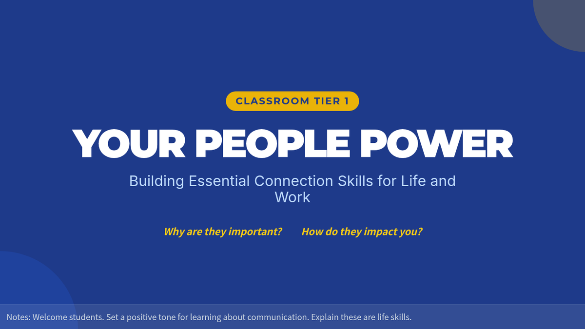 Focuses on social intelligence and 'code-switching' as tools for success. Students practice navigating conflict with peers and authority figures to protect their progress and 'own the room' professionally.