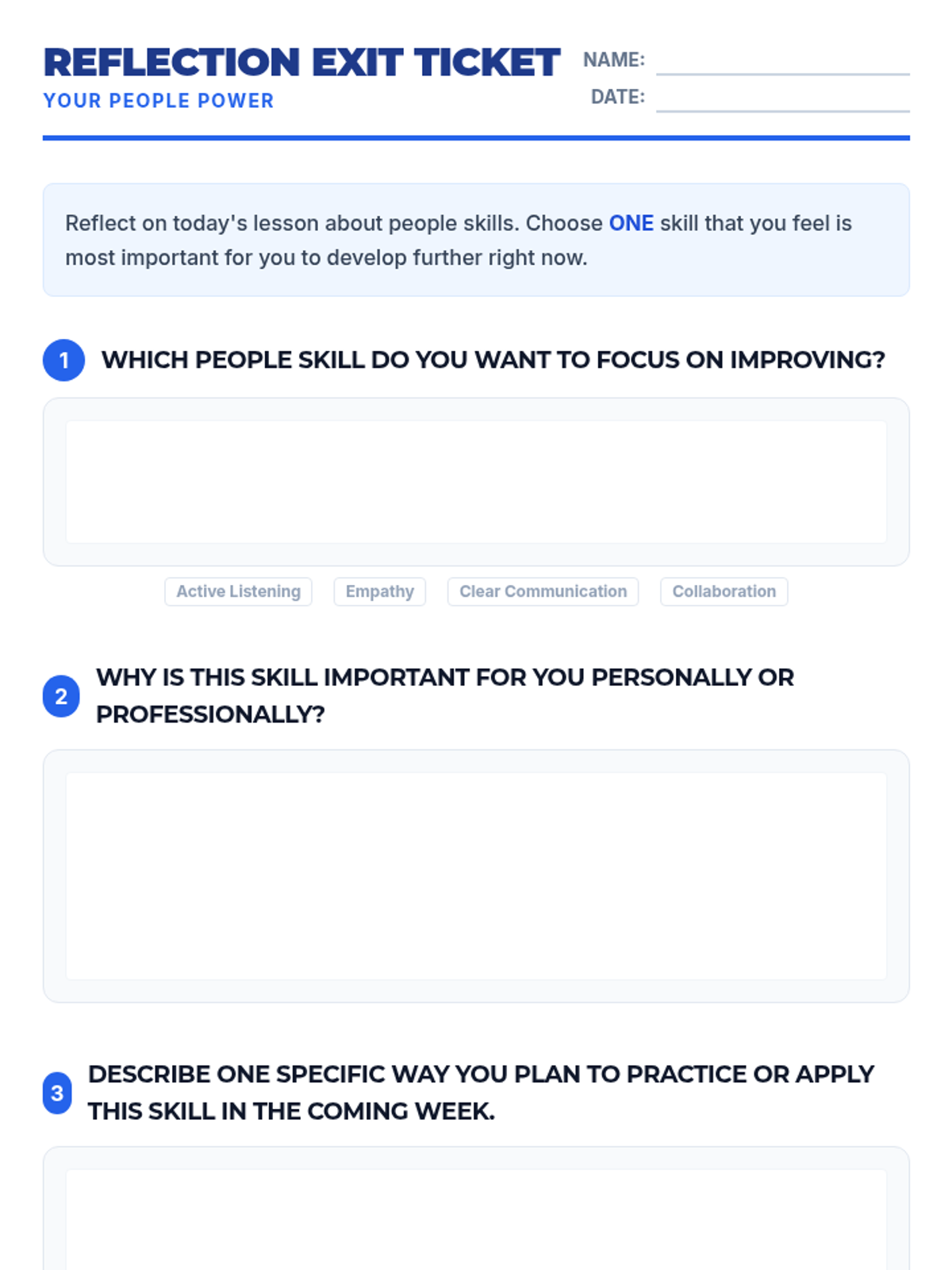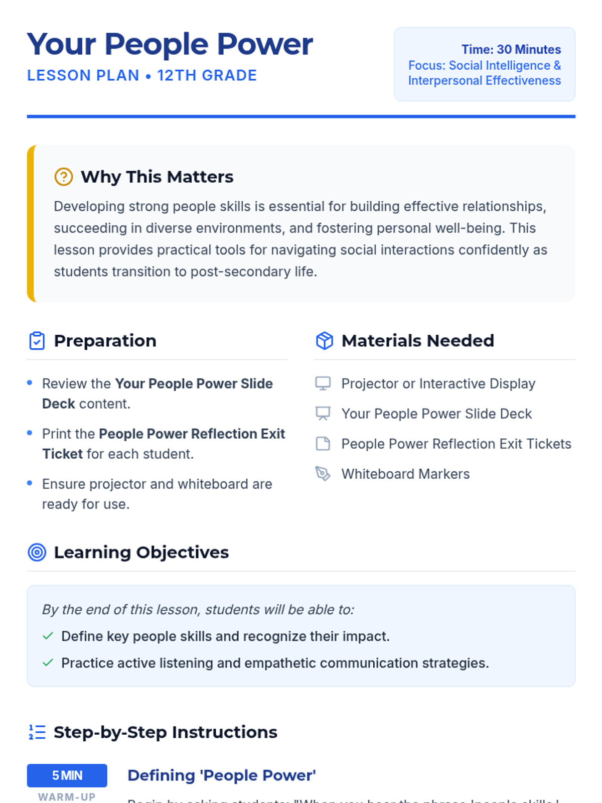 A 30-minute lesson for 12th-grade students focused on developing essential interpersonal skills like active listening, empathy, and collaboration for success in academic and professional settings.