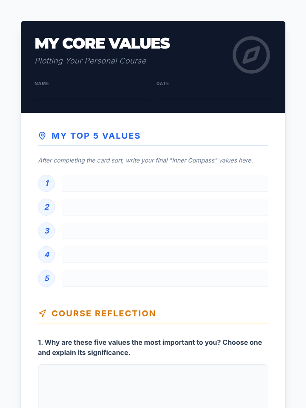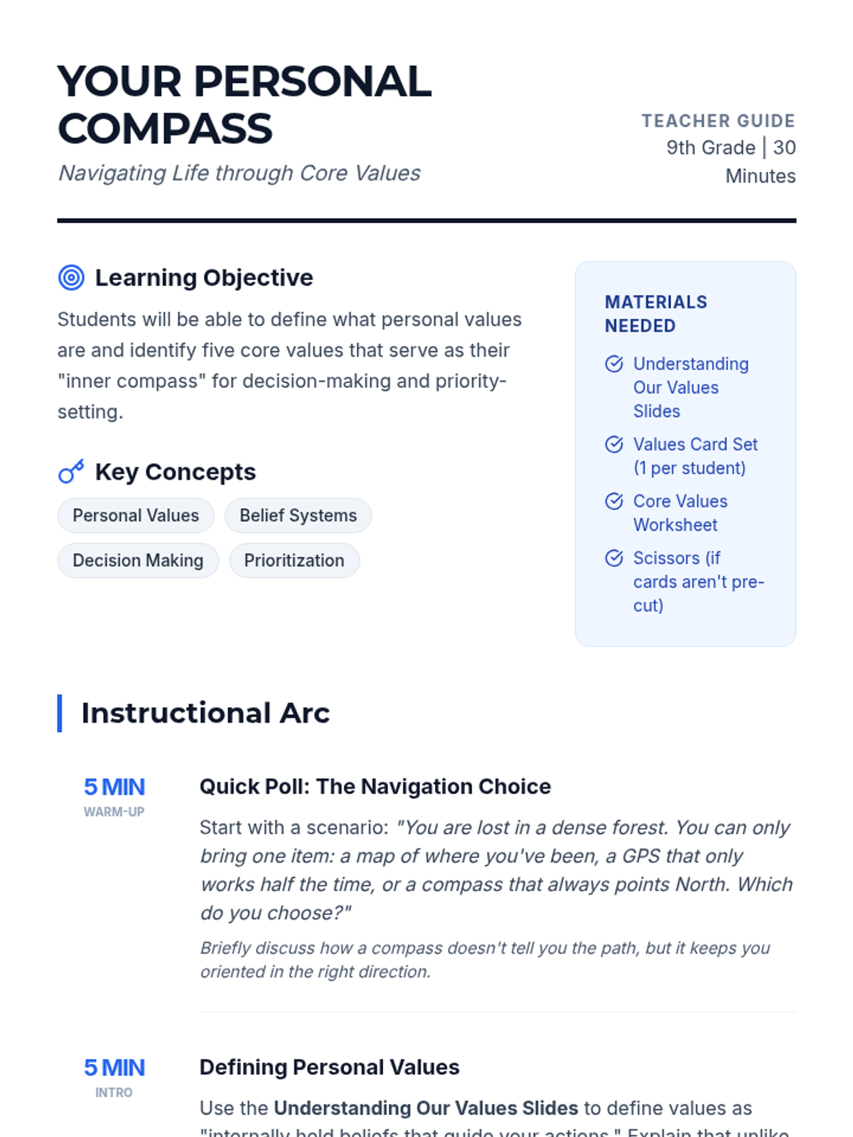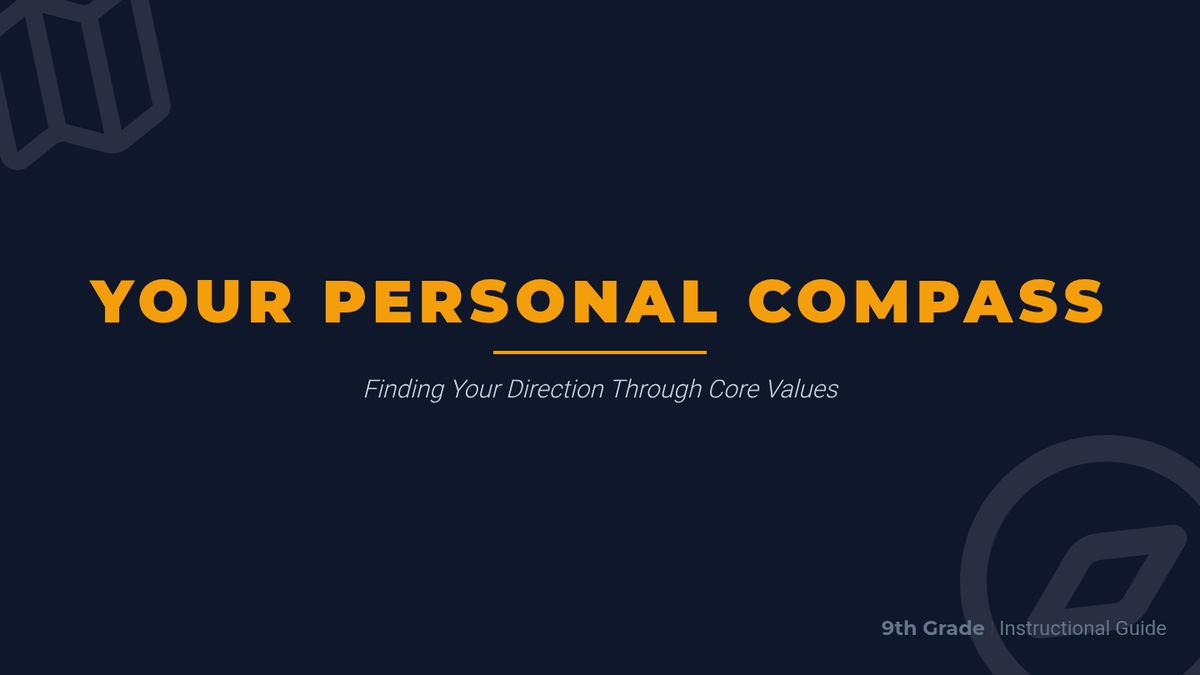 A 30-minute introductory lesson for 9th graders to identify and prioritize their core personal values using a compass-themed navigation metaphor.