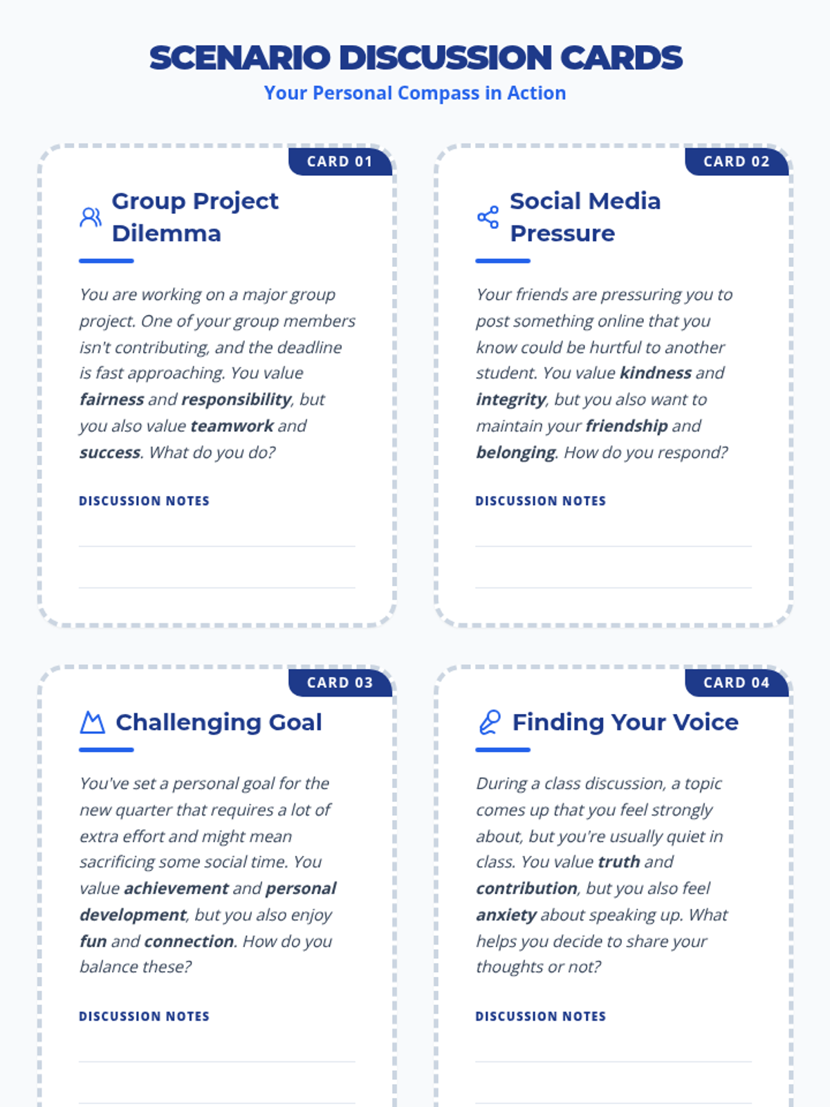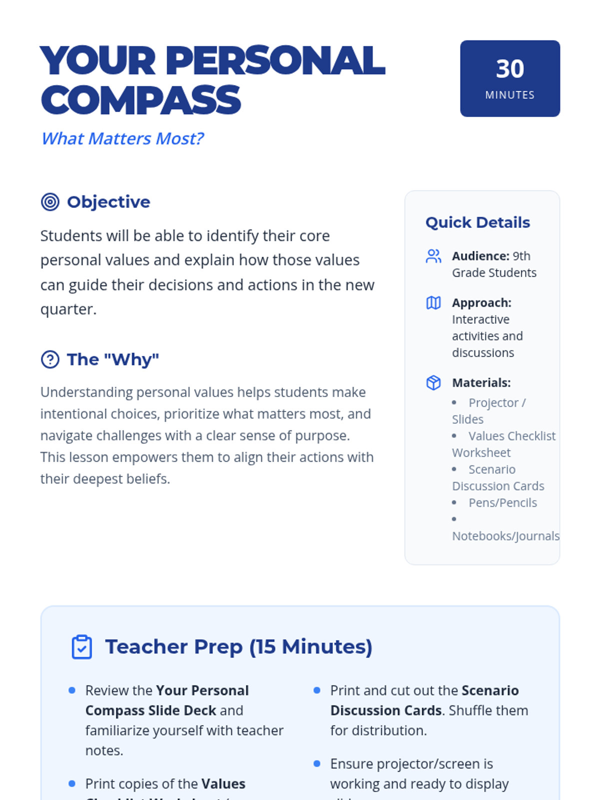 A 30-minute lesson for 9th-grade students to identify core personal values and understand how they guide decision-making for the new quarter.
