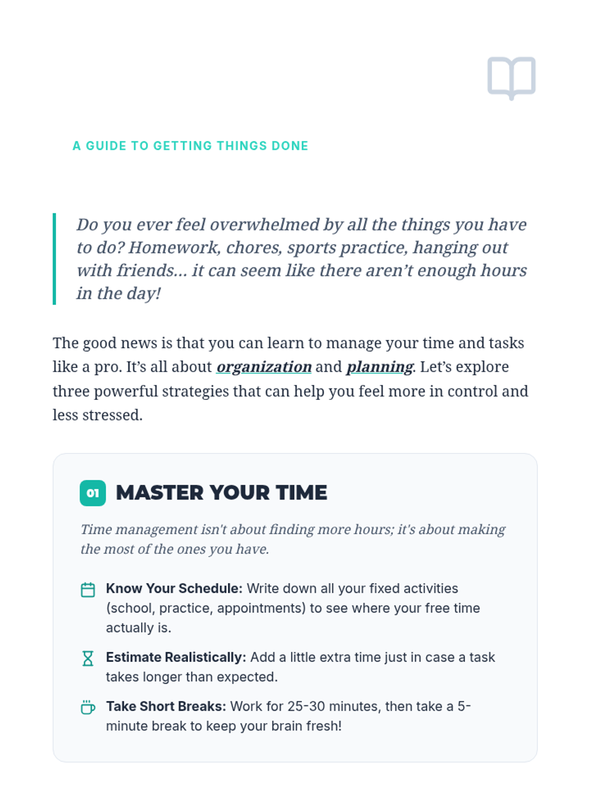 Teaches practical strategies for time management, prioritization, and effective study habits.