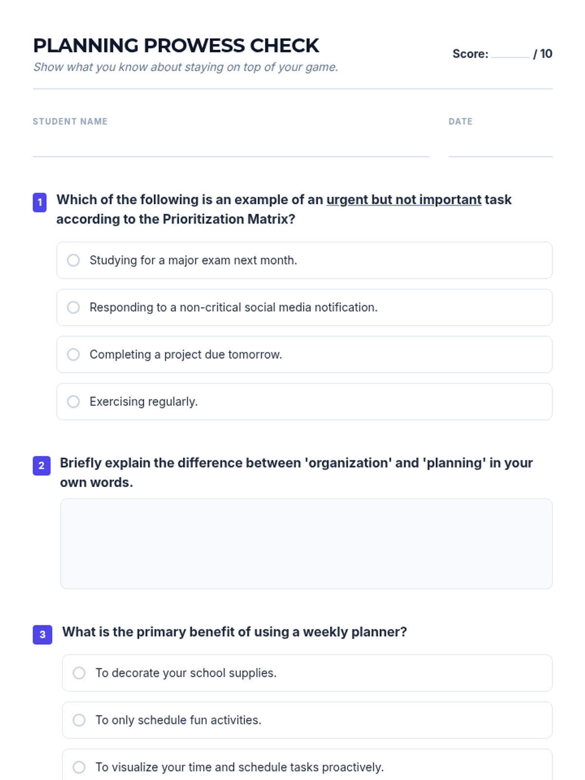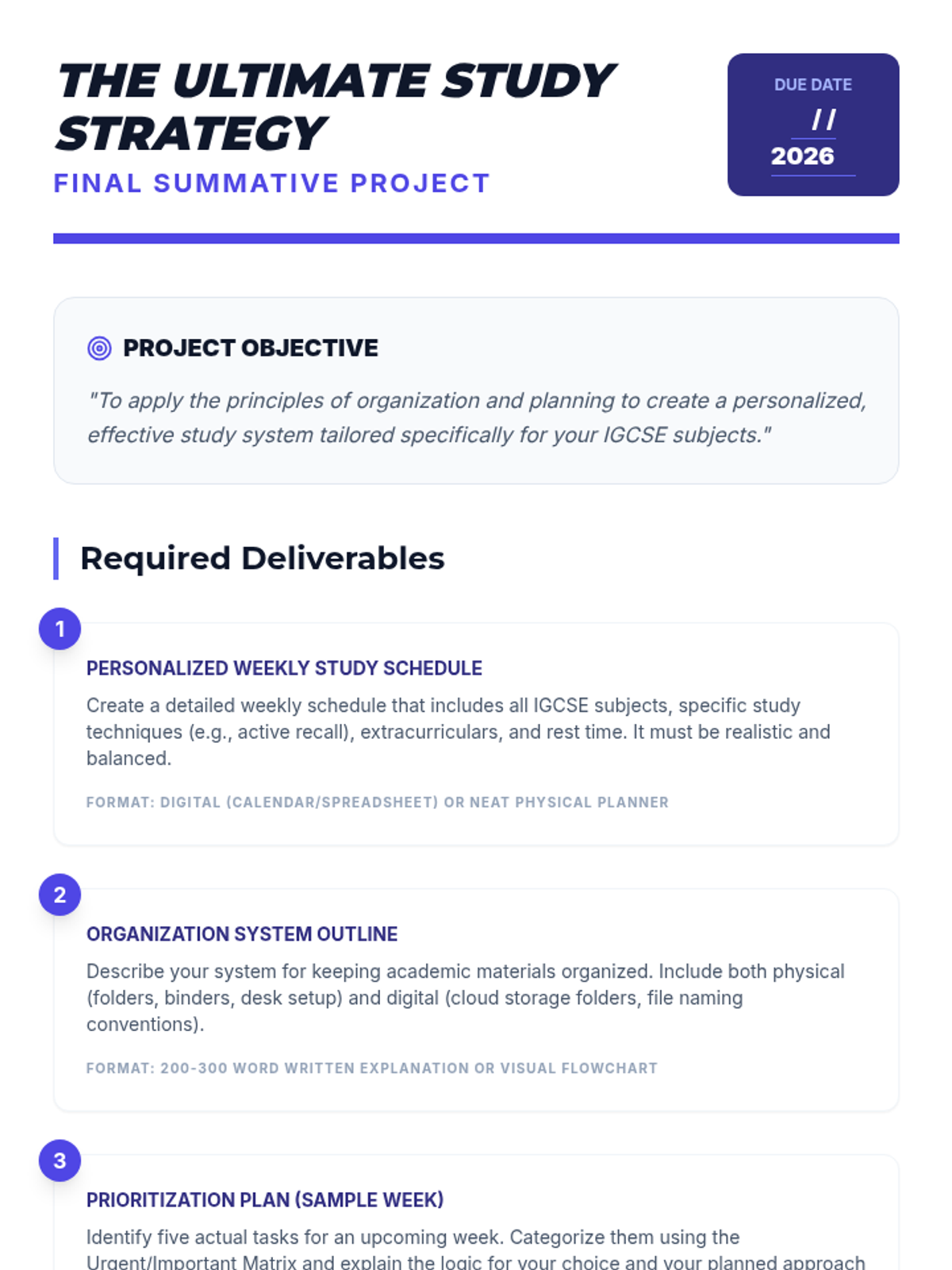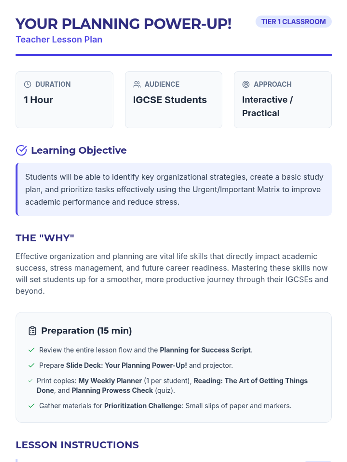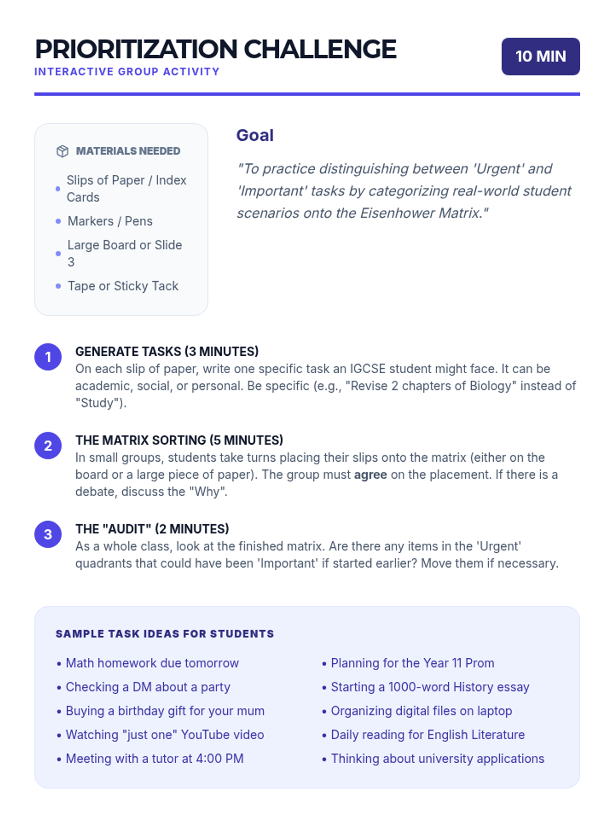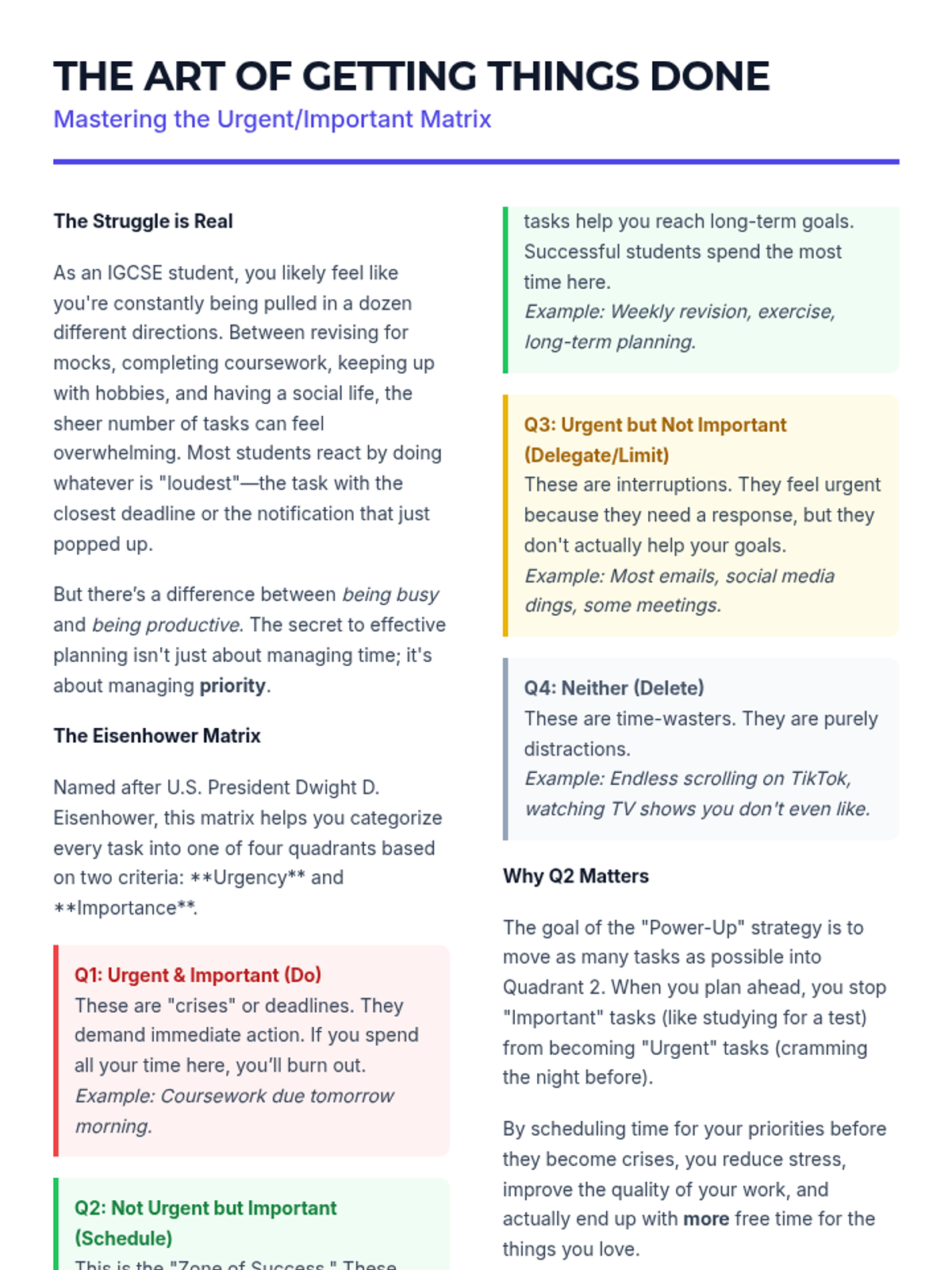 A comprehensive 1-hour workshop for IGCSE students to master time management, prioritization using the Eisenhower Matrix, and effective weekly planning to reduce academic stress and boost performance.