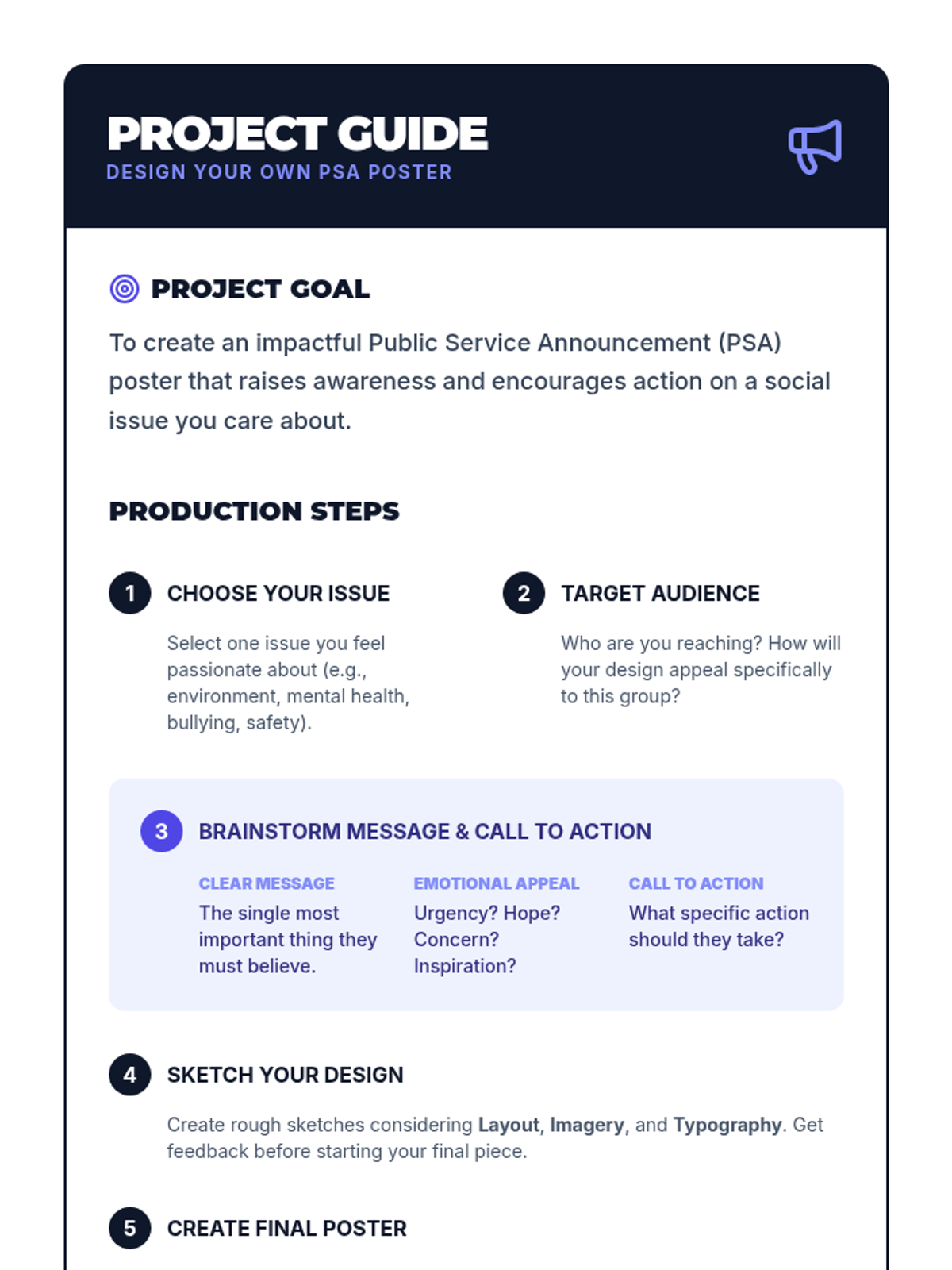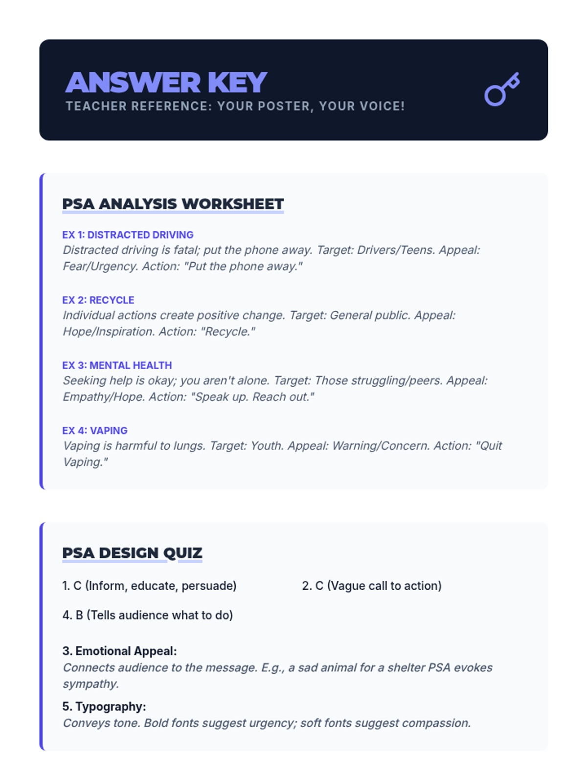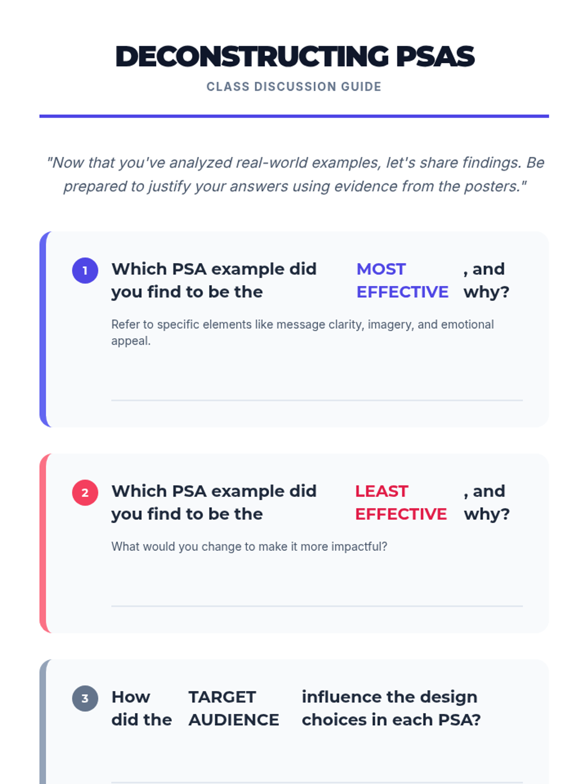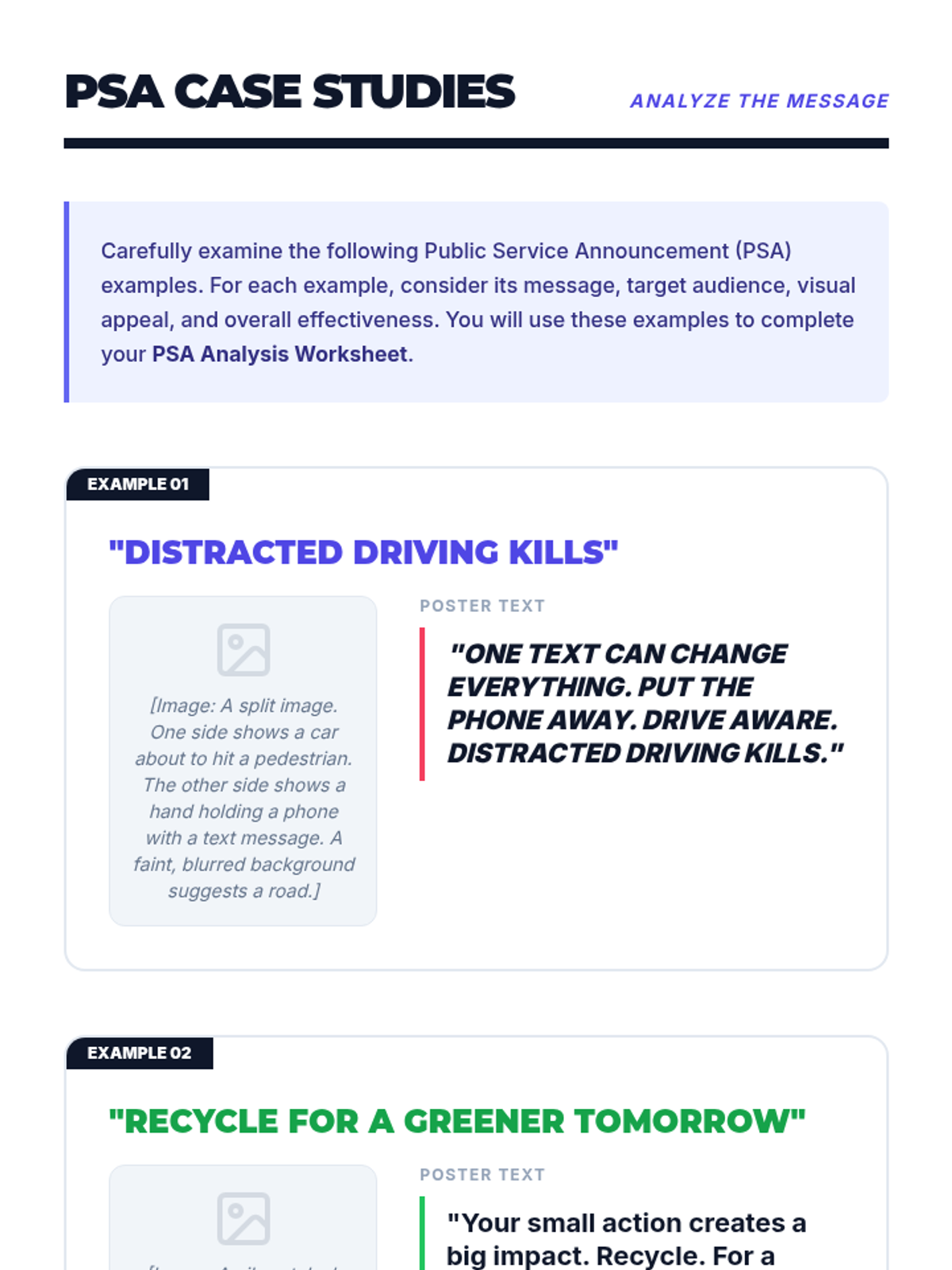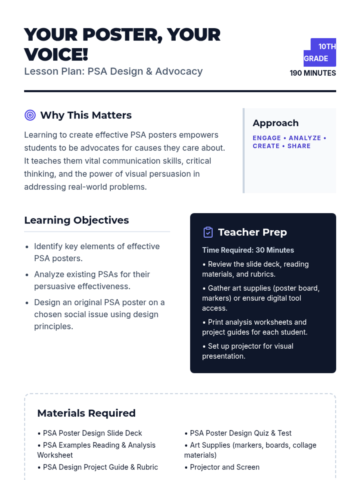 This lesson empowers 10th-grade students to create impactful Public Service Announcement (PSA) posters. Students will learn the key elements of effective visual communication and persuasive messaging to raise awareness about important social issues.