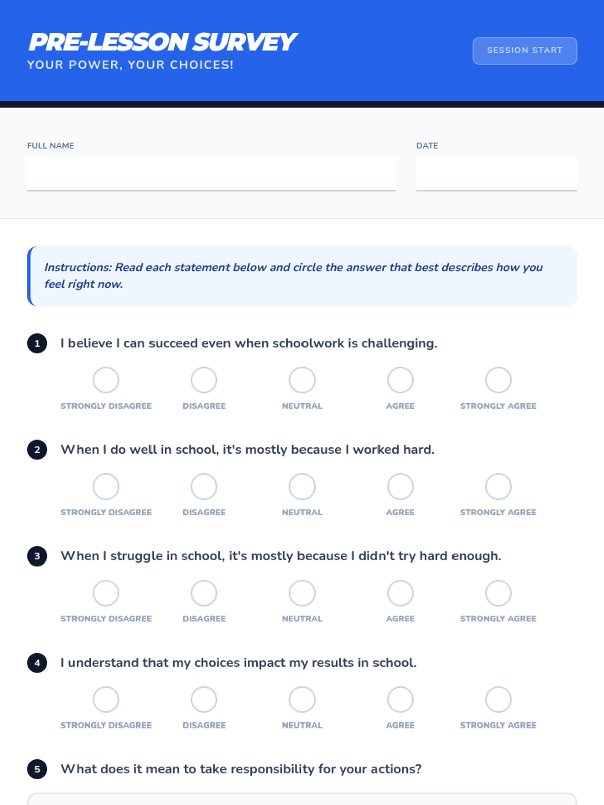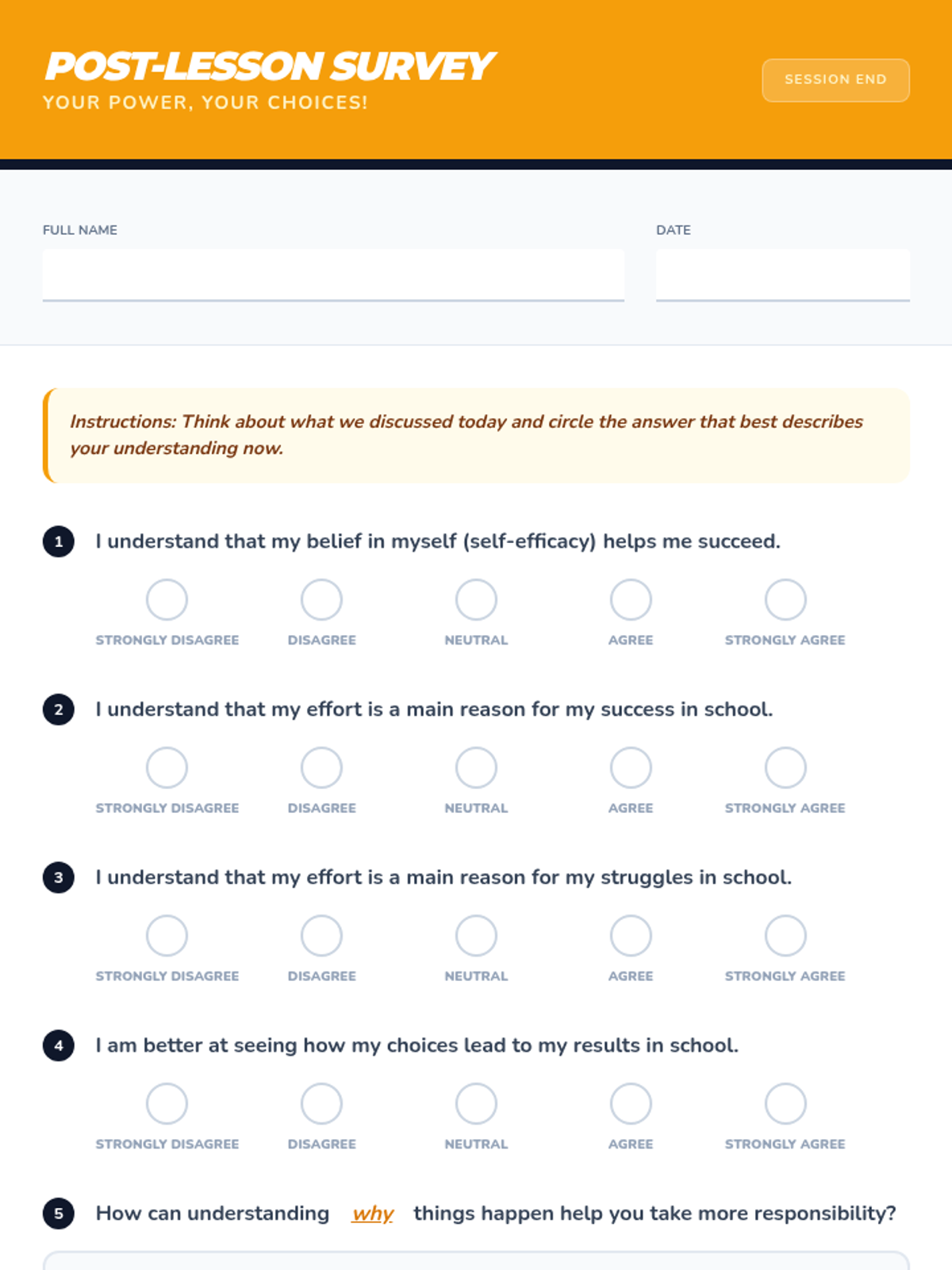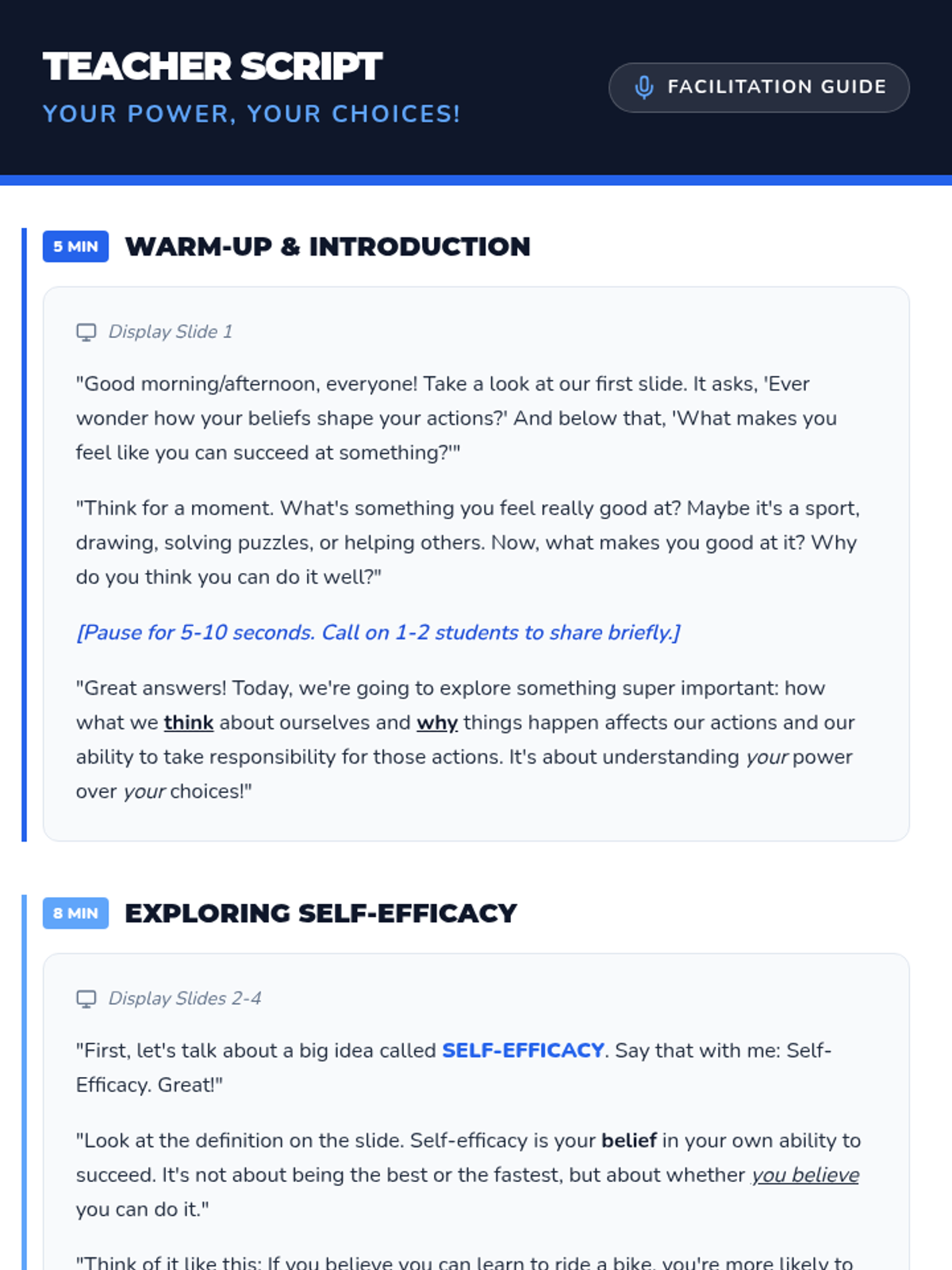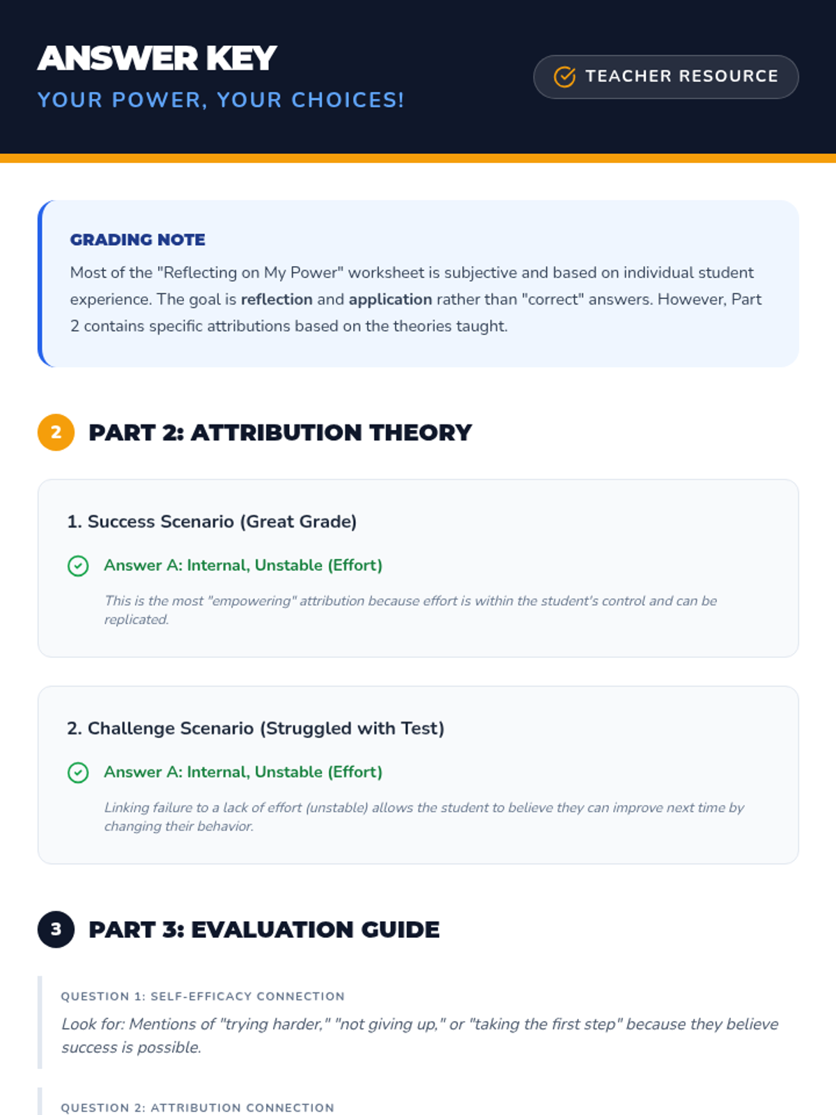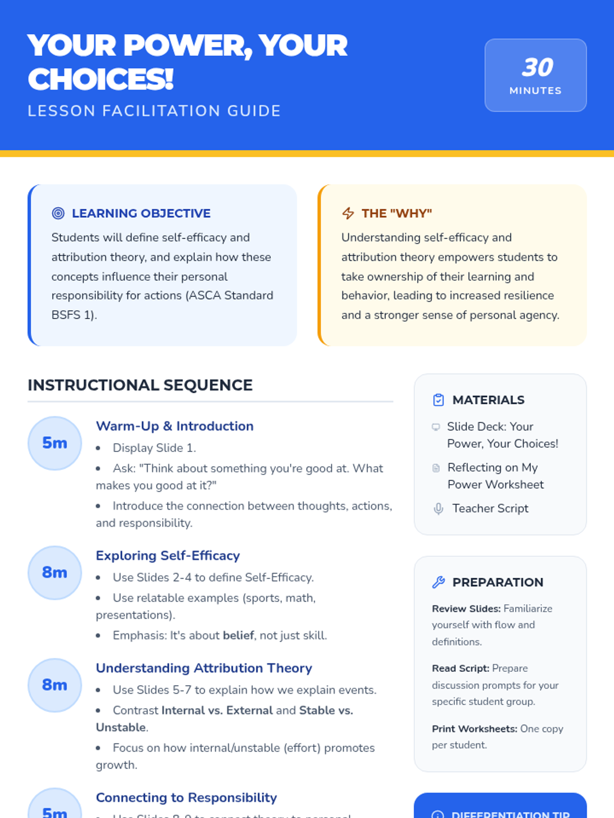 This lesson helps 6th-8th grade students understand how their beliefs about their abilities (self-efficacy) and reasons for success/failure (attribution theory) impact their responsibility for their actions. It's crucial for fostering a growth mindset and personal accountability. Designed for a single 30-minute classroom session.