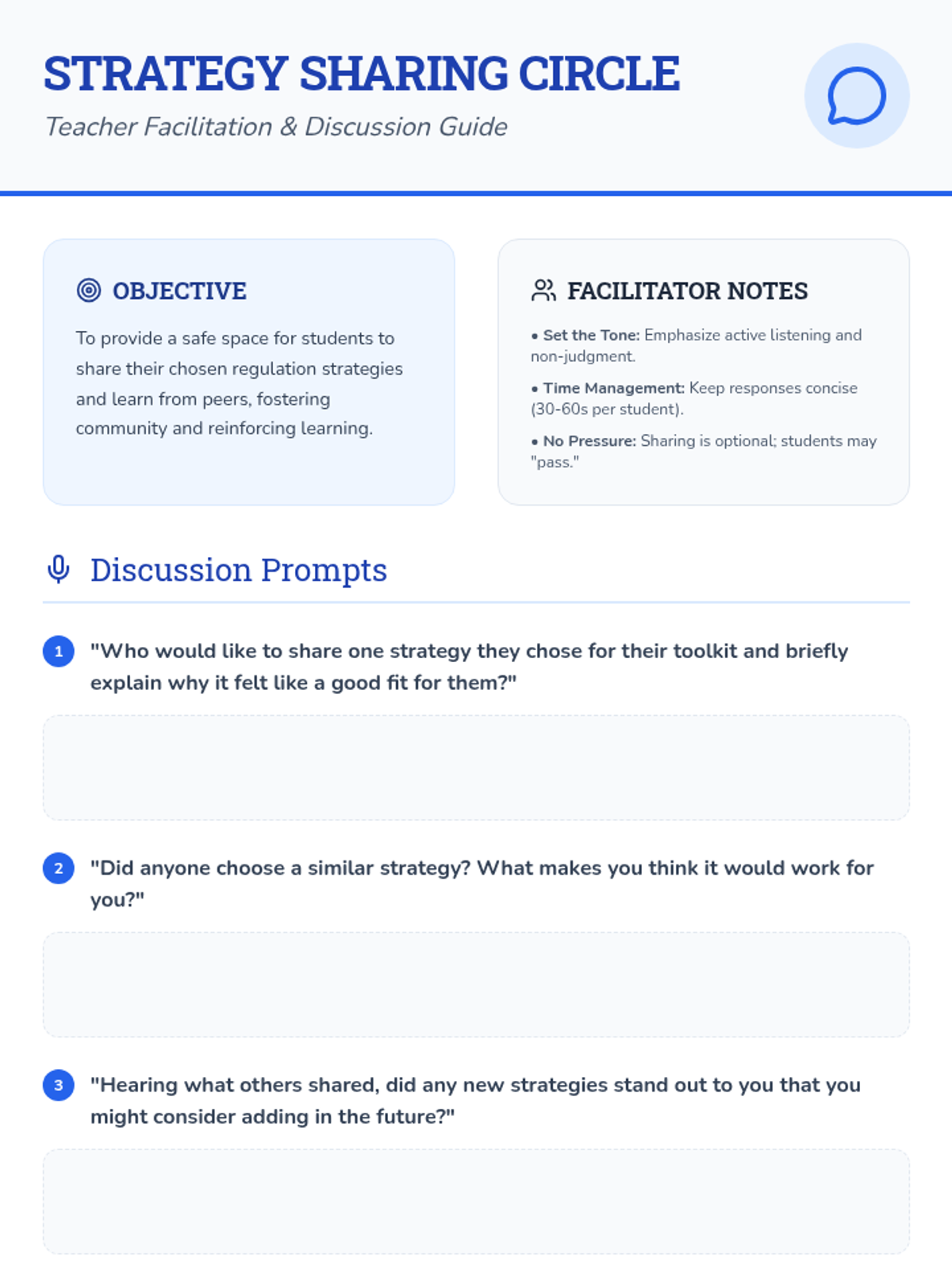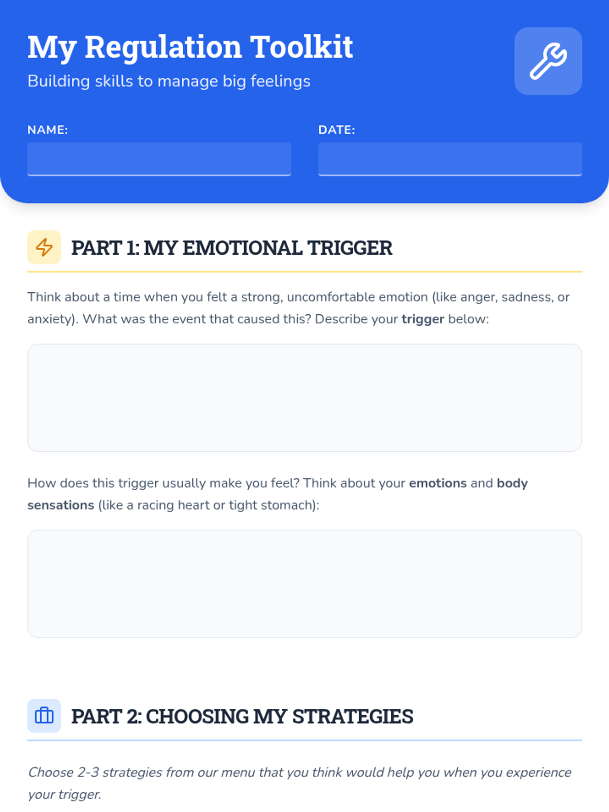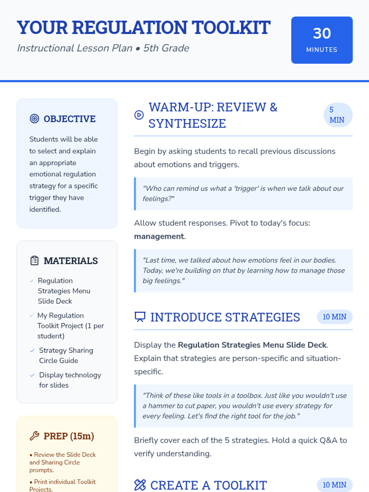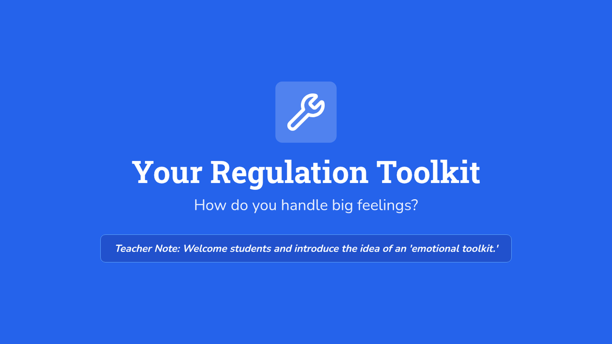 A 30-minute lesson for 5th graders to identify emotional triggers and build a personalized toolkit of regulation strategies. Students explore movement, breathing, and creative expression to manage big feelings.