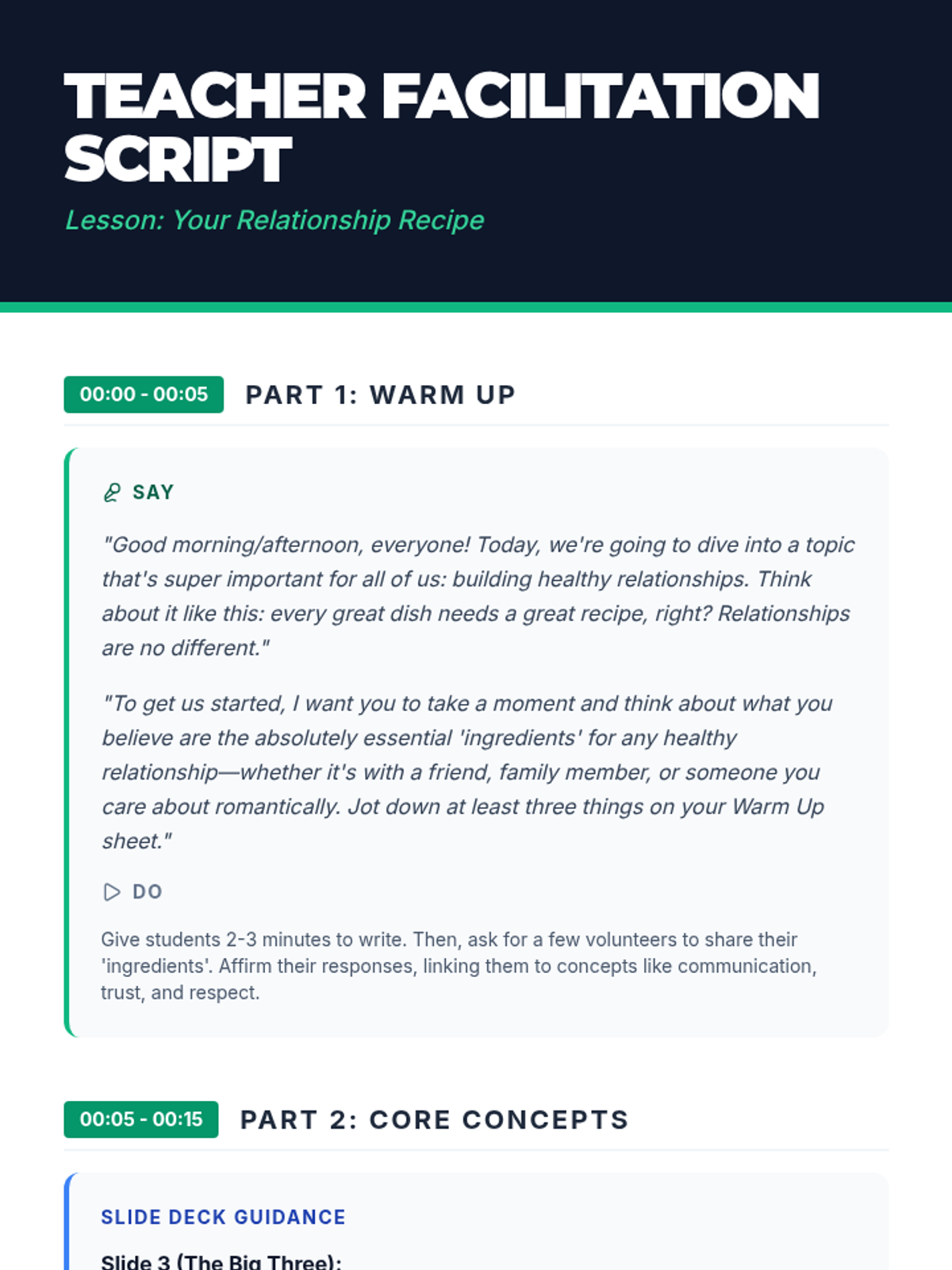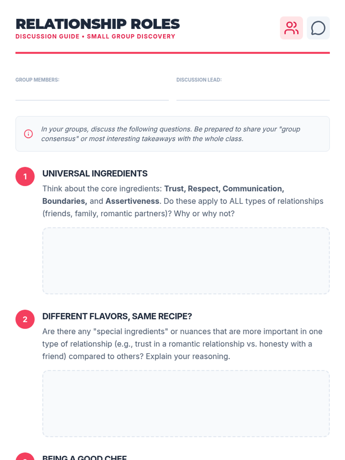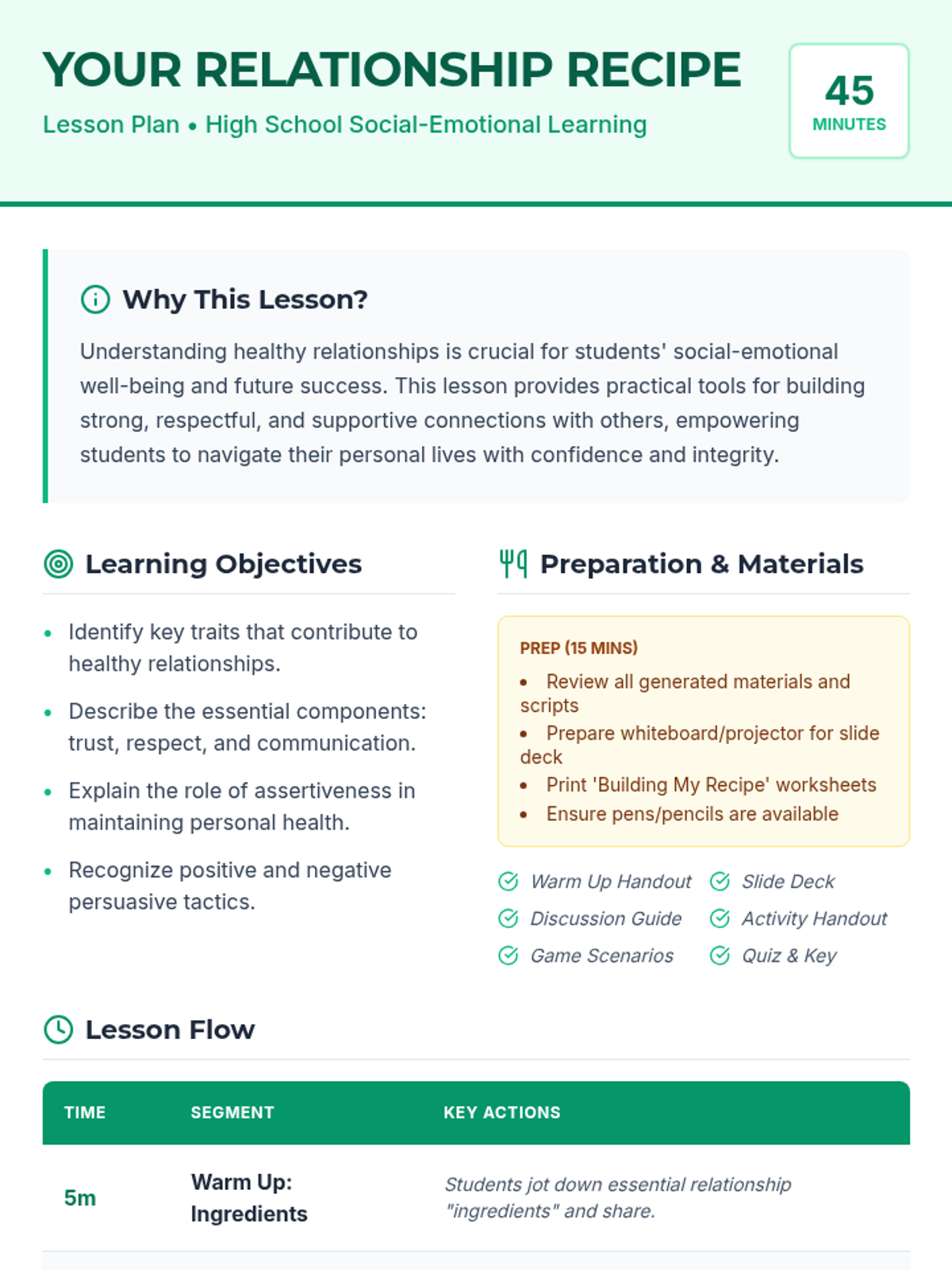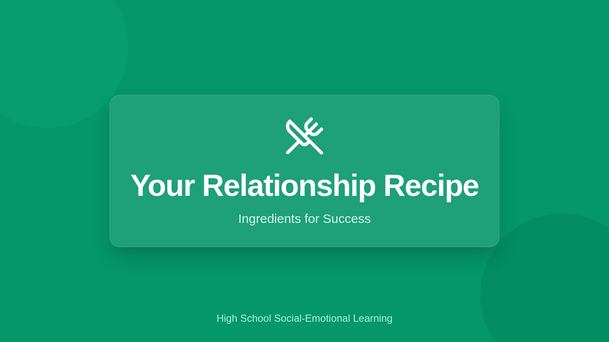 A comprehensive 45-minute lesson for high school students exploring the 'ingredients' of healthy relationships, including trust, respect, communication, boundaries, and assertiveness.