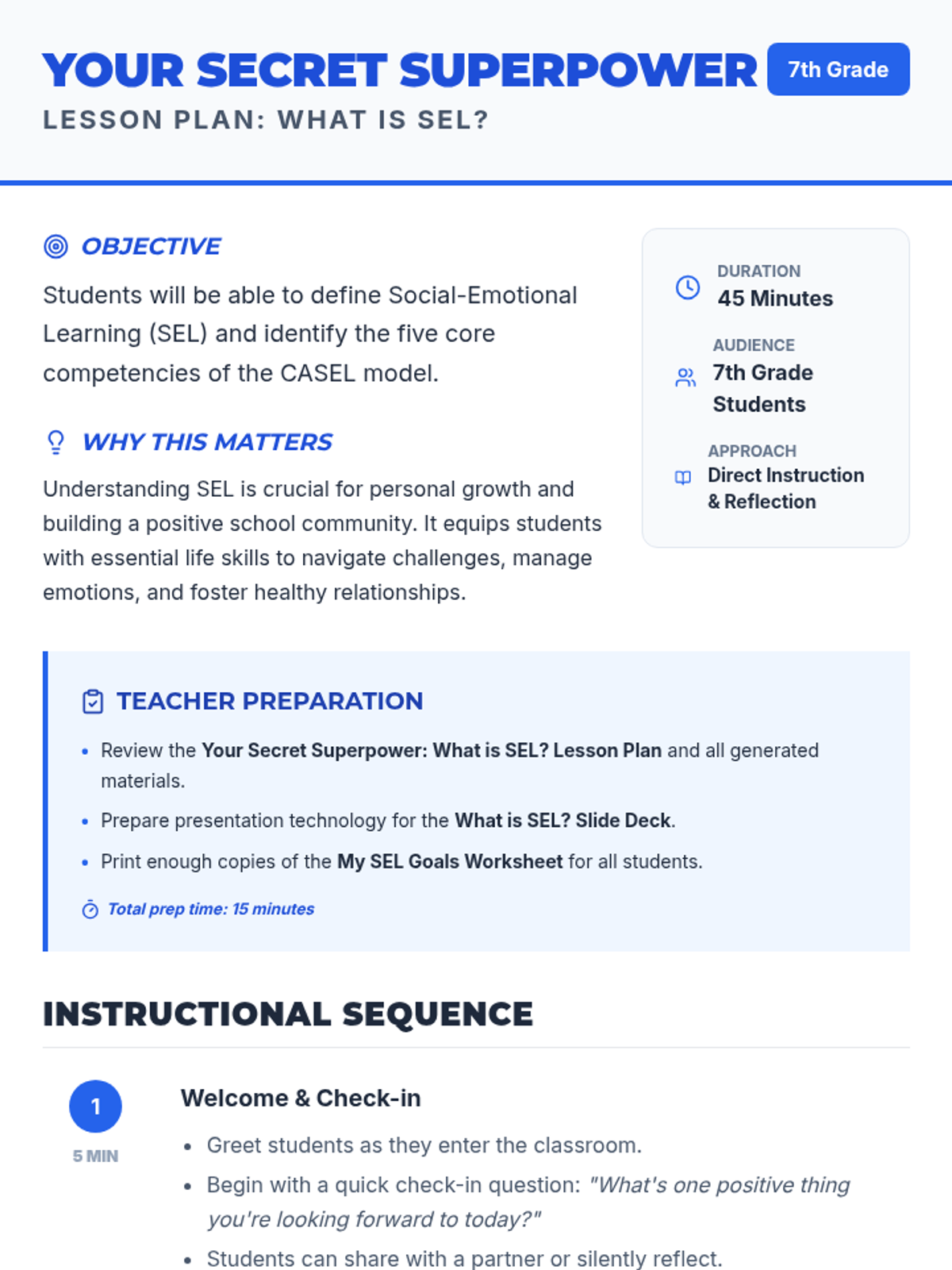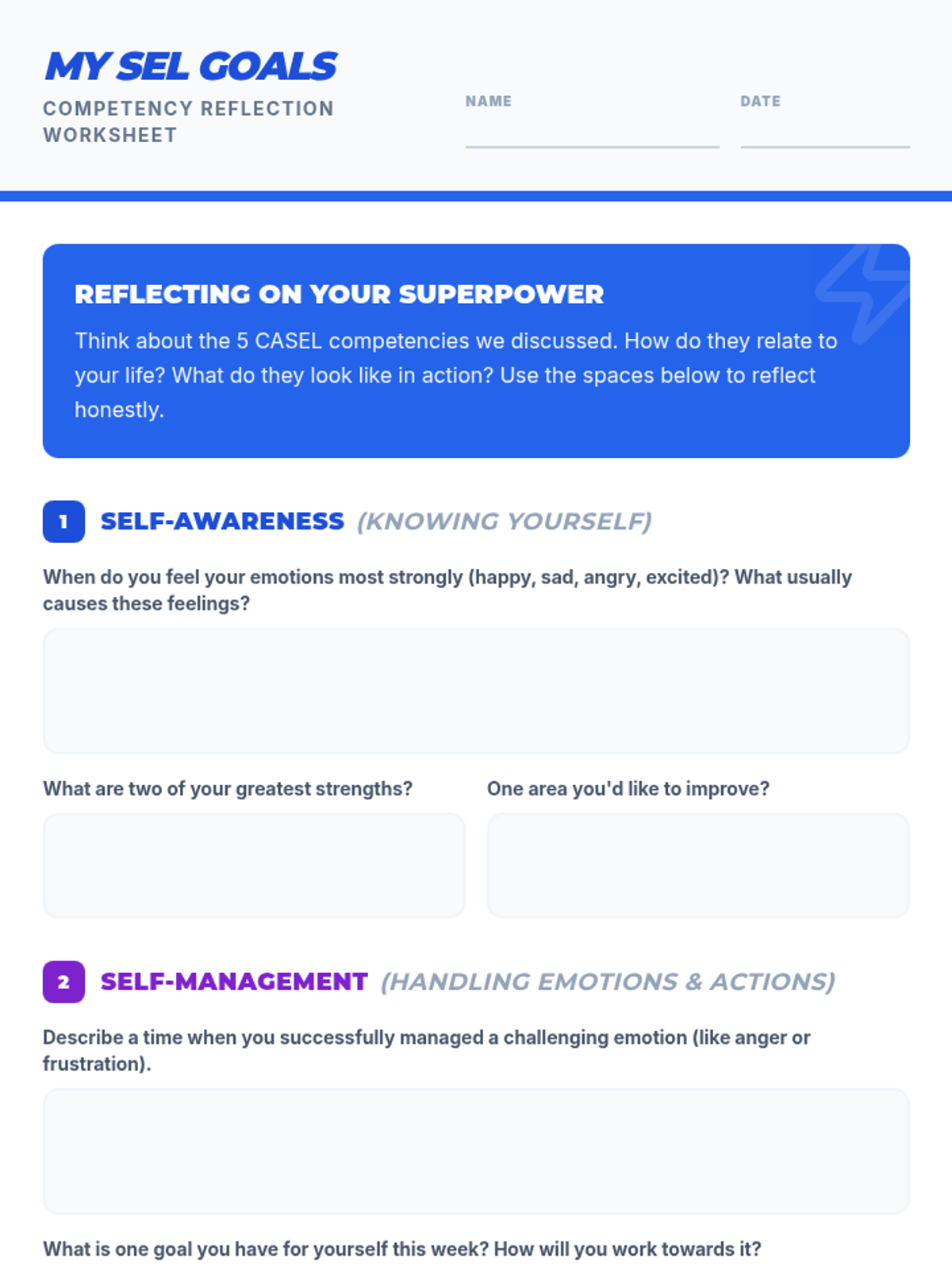 This lesson introduces 7th-grade students to Social-Emotional Learning (SEL) and the five core CASEL competencies through a 'superpower' lens, fostering self-awareness and personal growth.