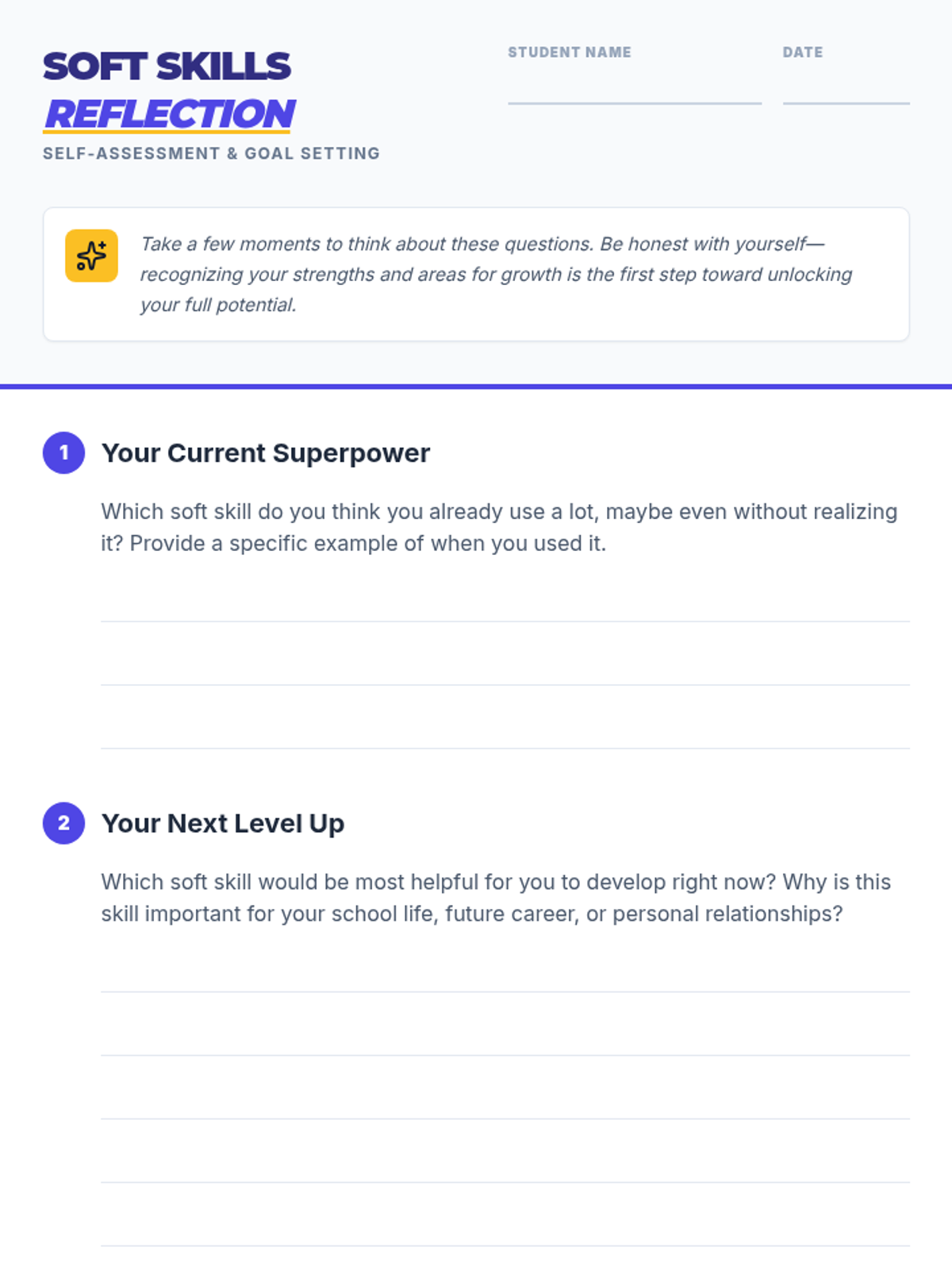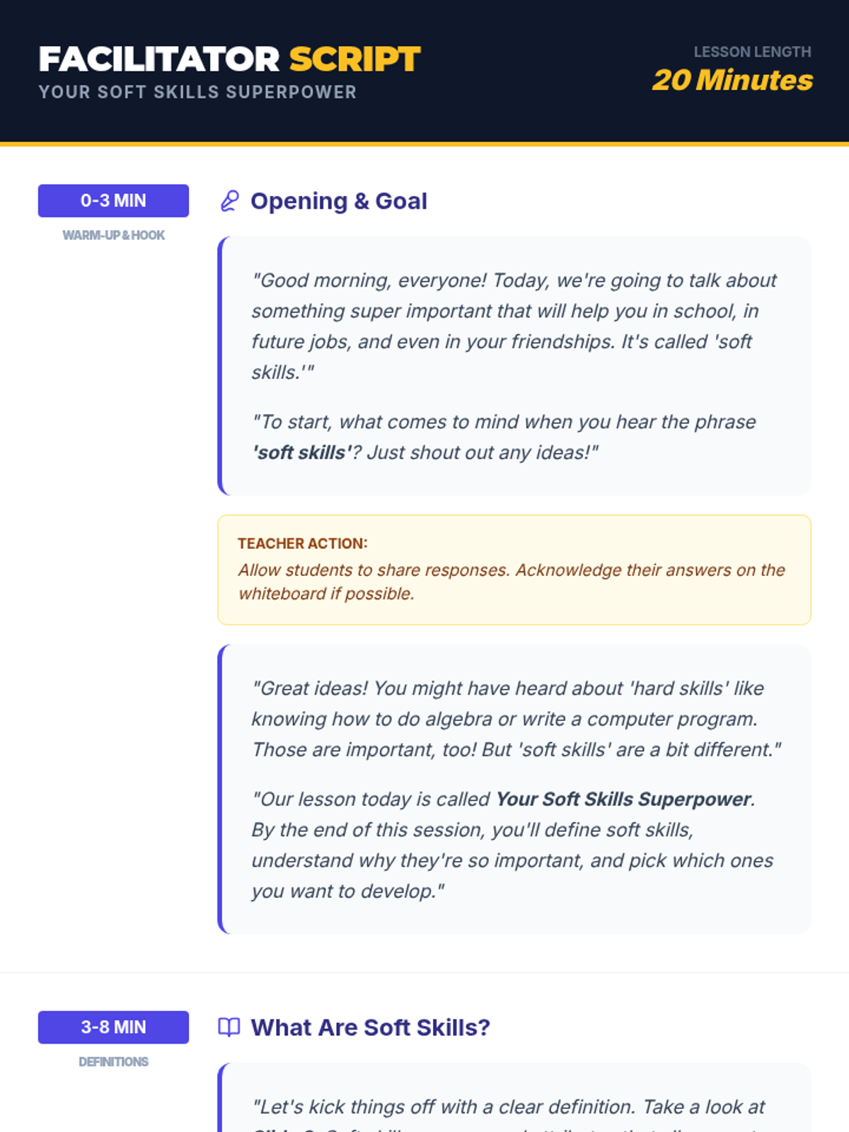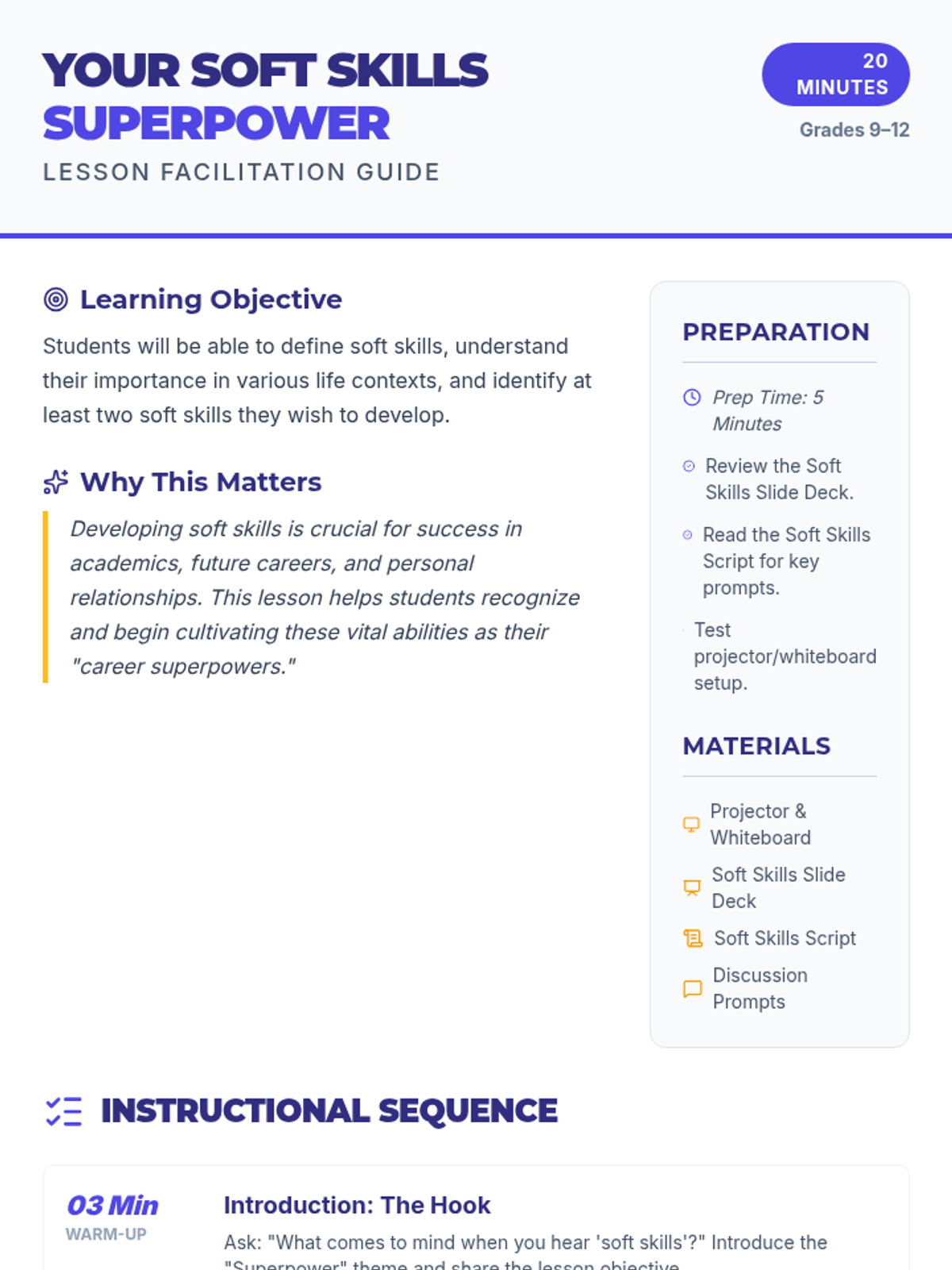 A 20-minute introductory lesson for high school students on the importance of soft skills like communication, teamwork, and adaptability for future success.