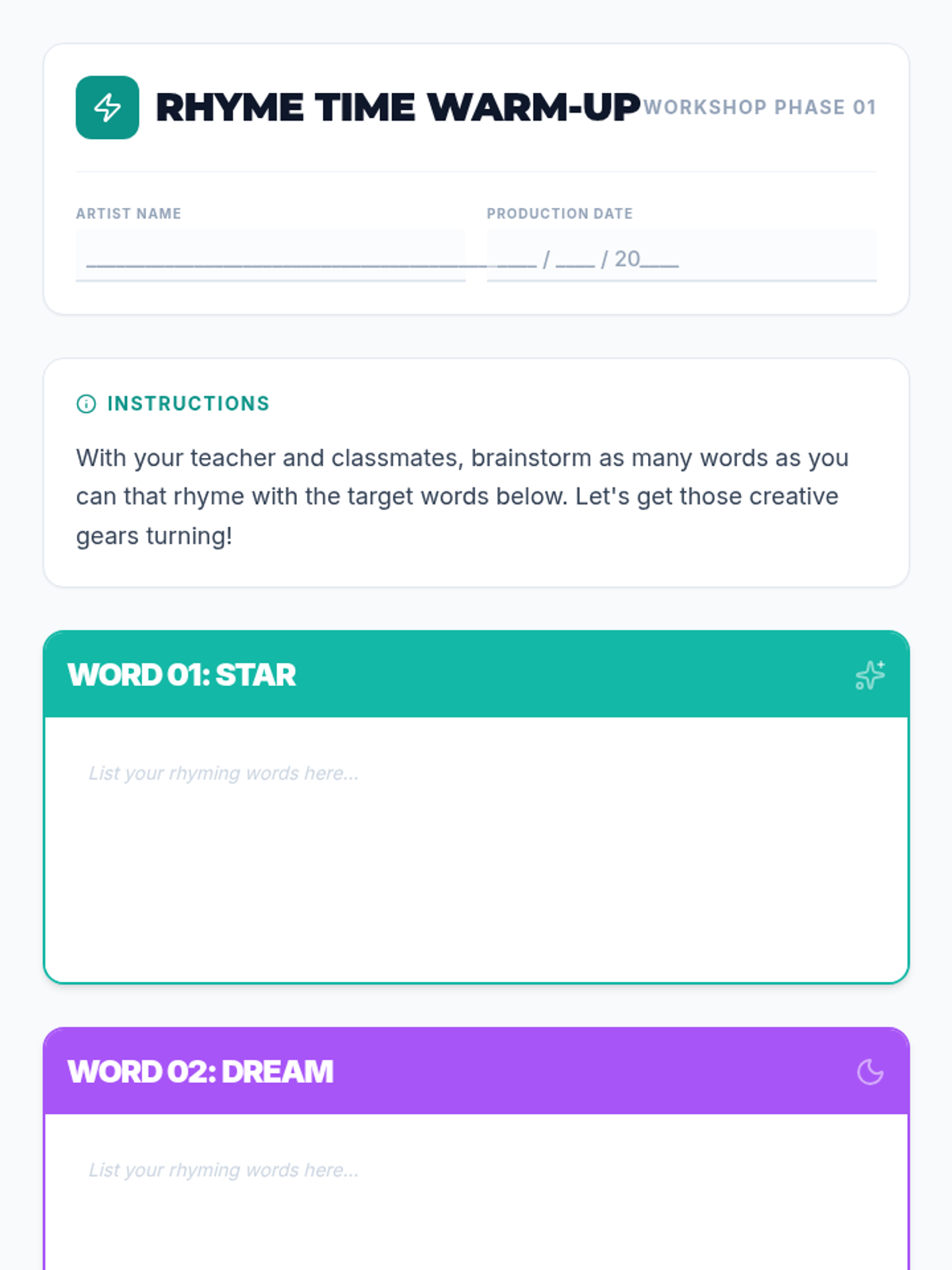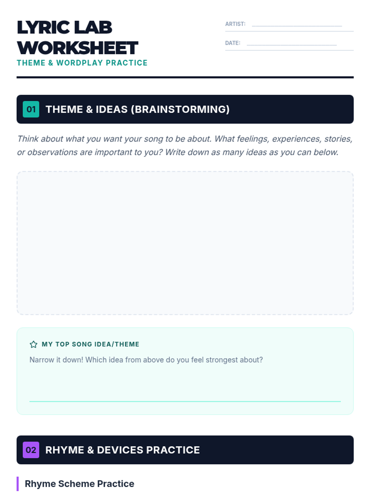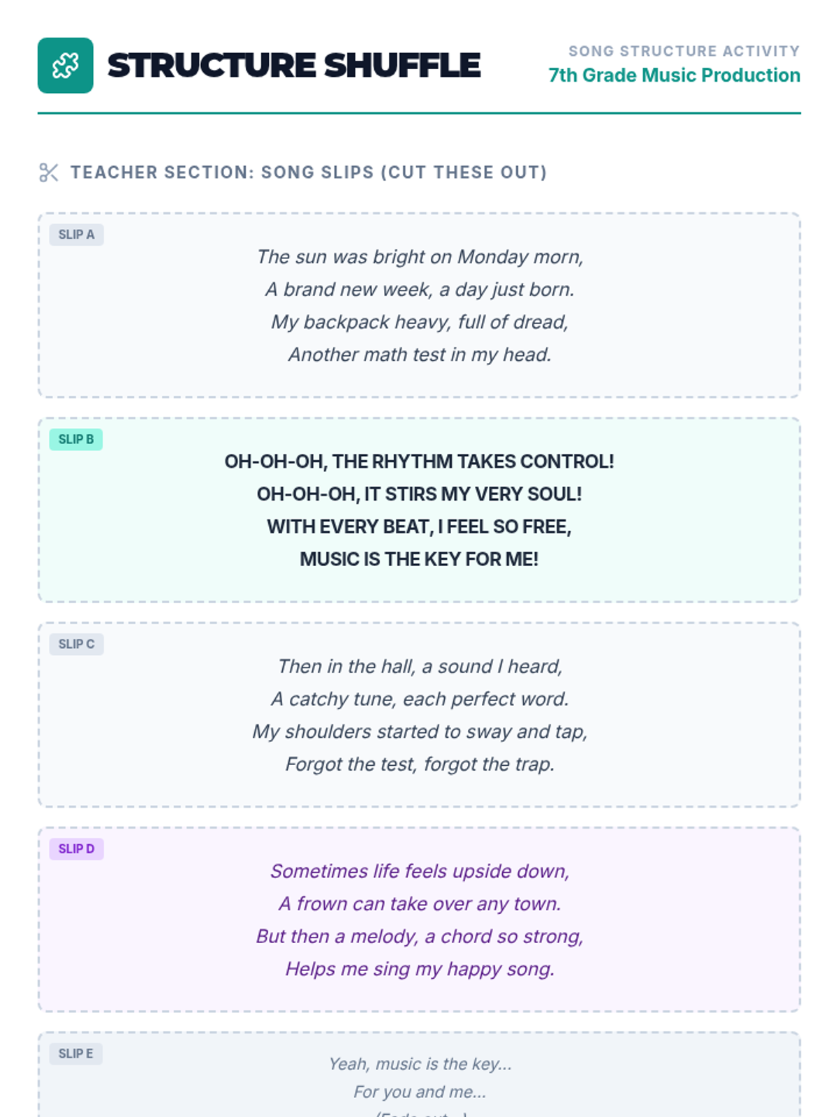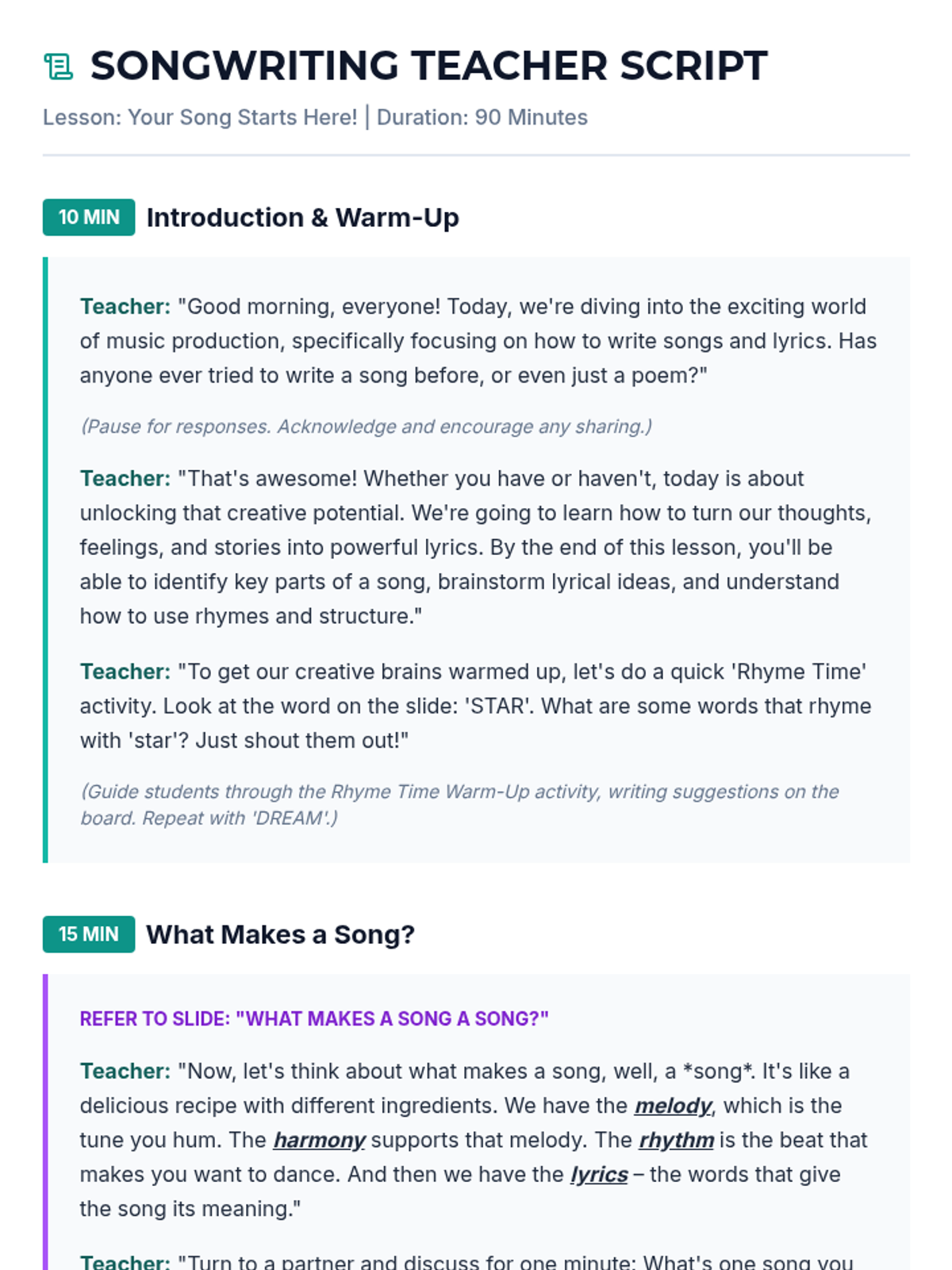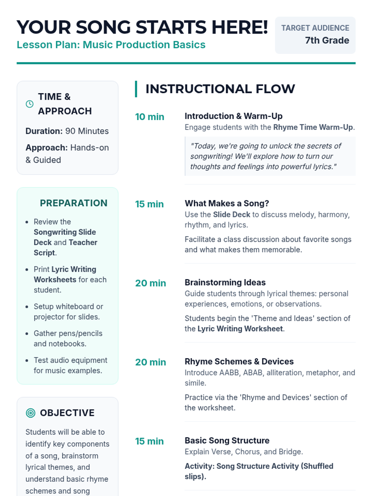 A comprehensive 90-minute lesson introducing 7th graders to songwriting and lyric writing, covering themes, rhyme schemes, poetic devices, and song structure.