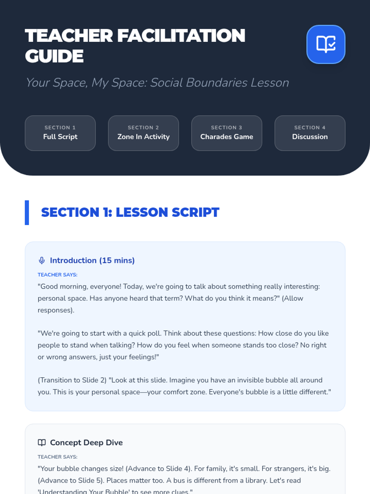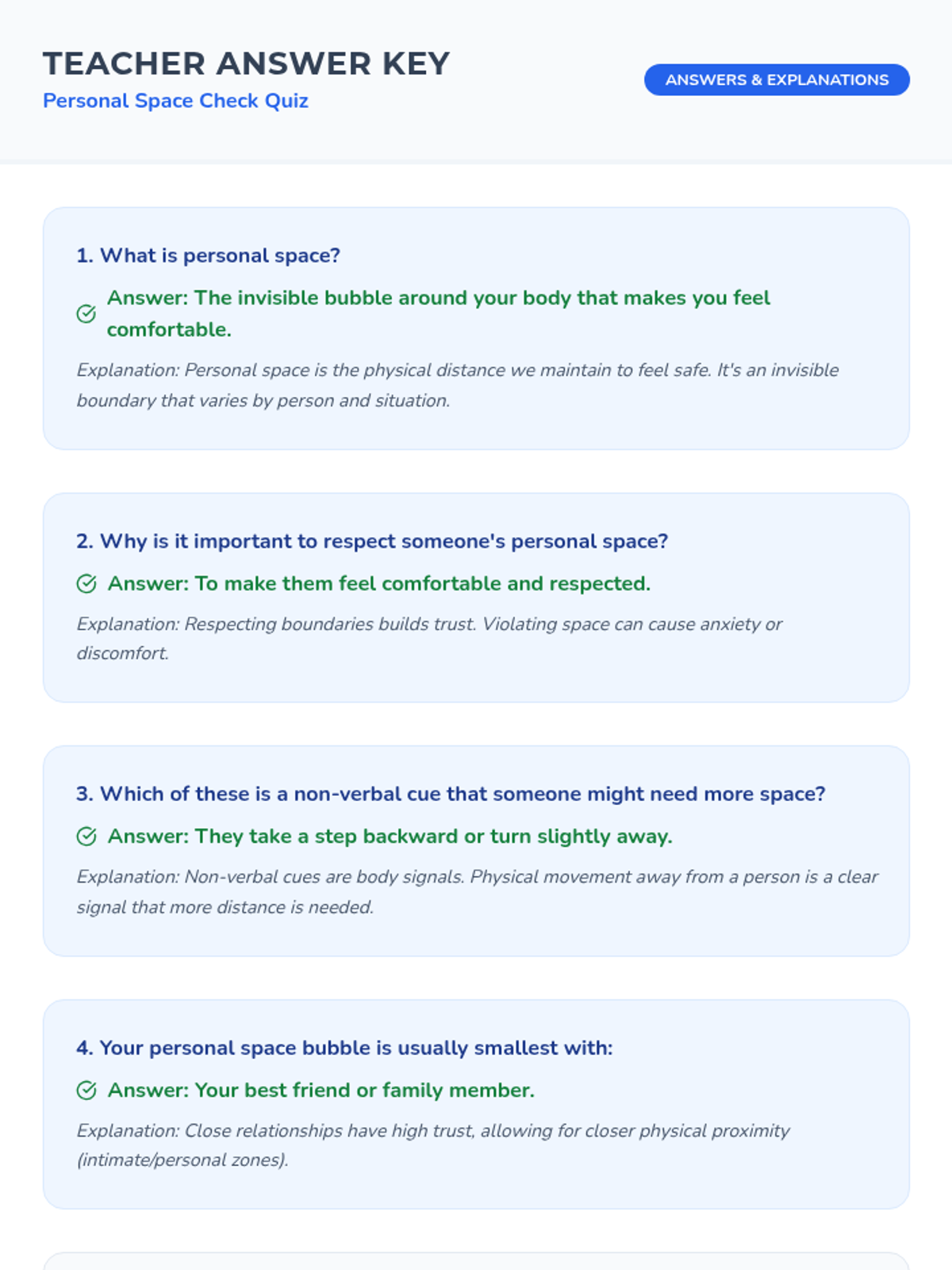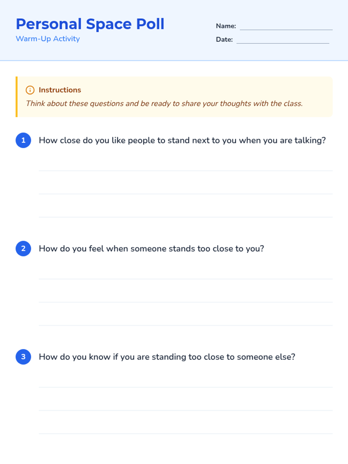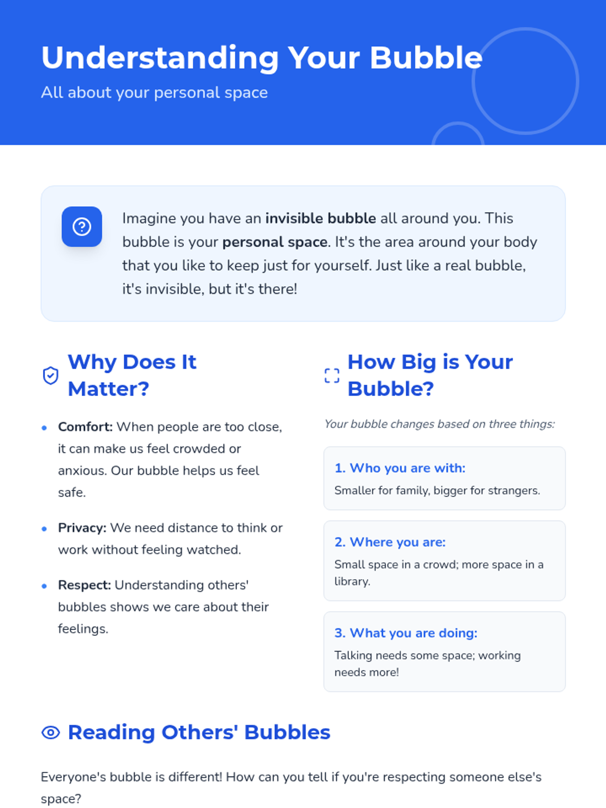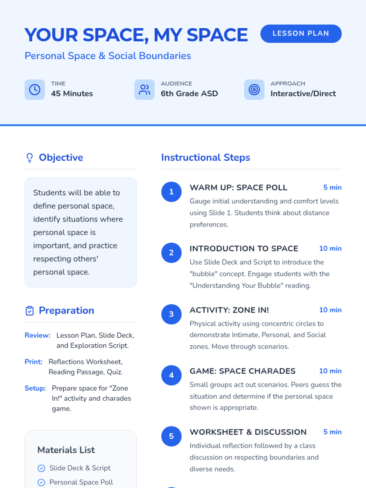 A 45-minute lesson designed for 6th-grade students with ASD to understand and practice personal space boundaries using the 'bubble' concept and physical activity.