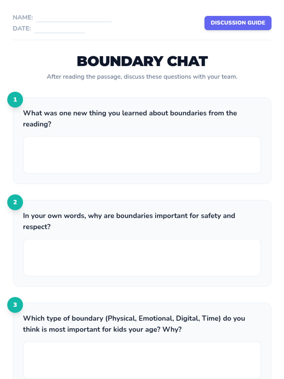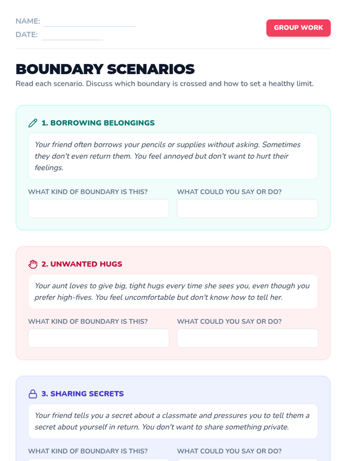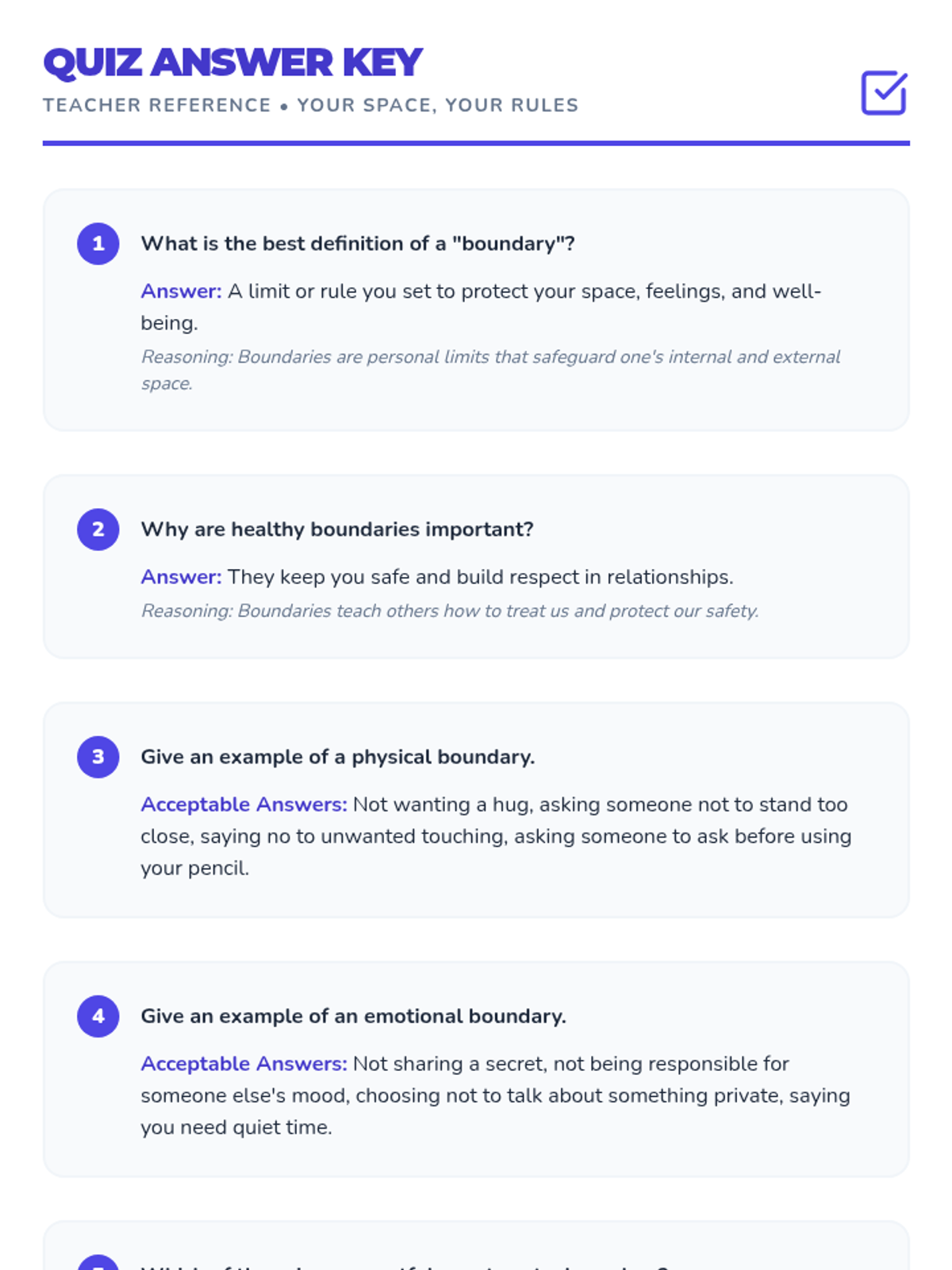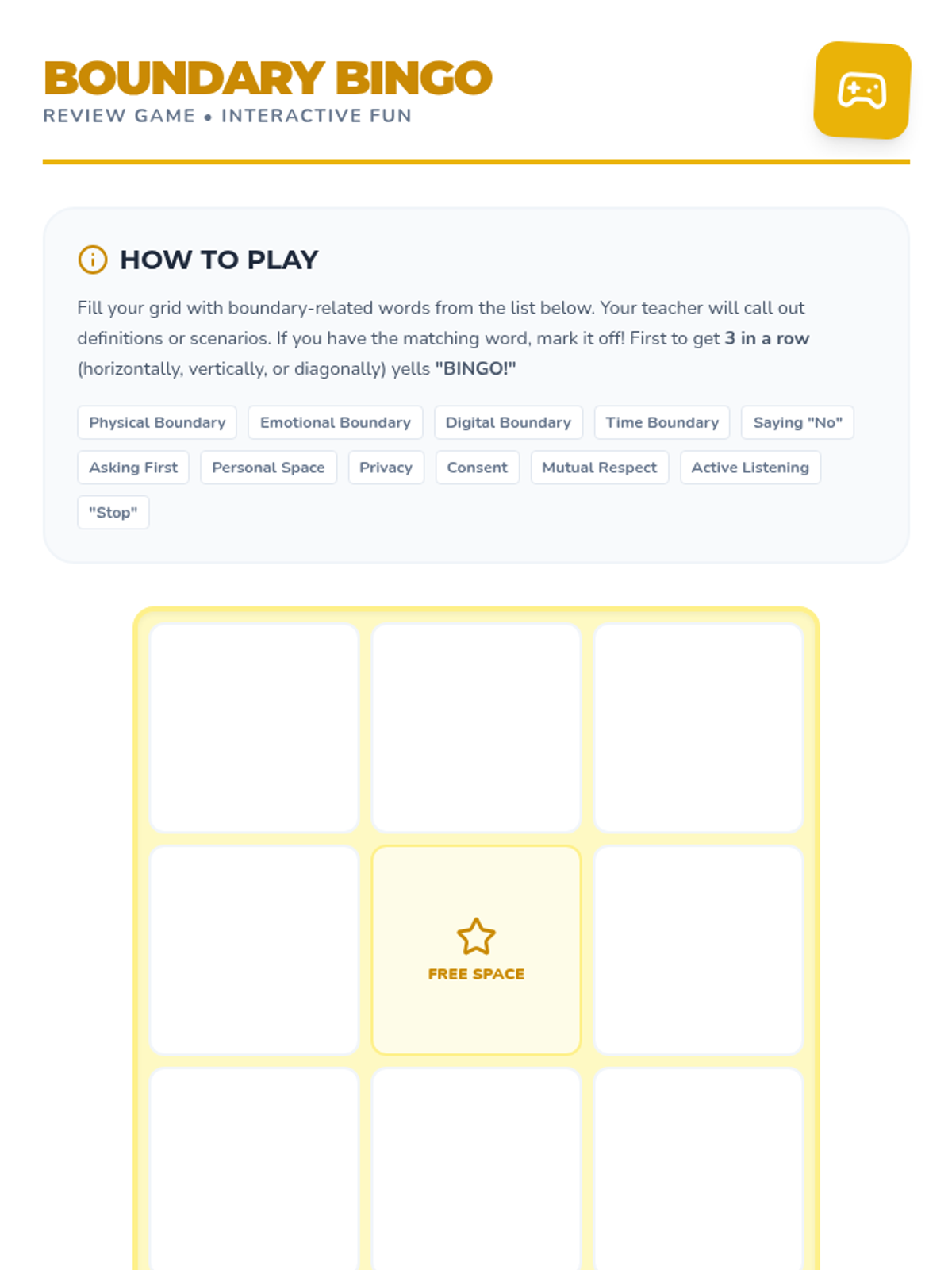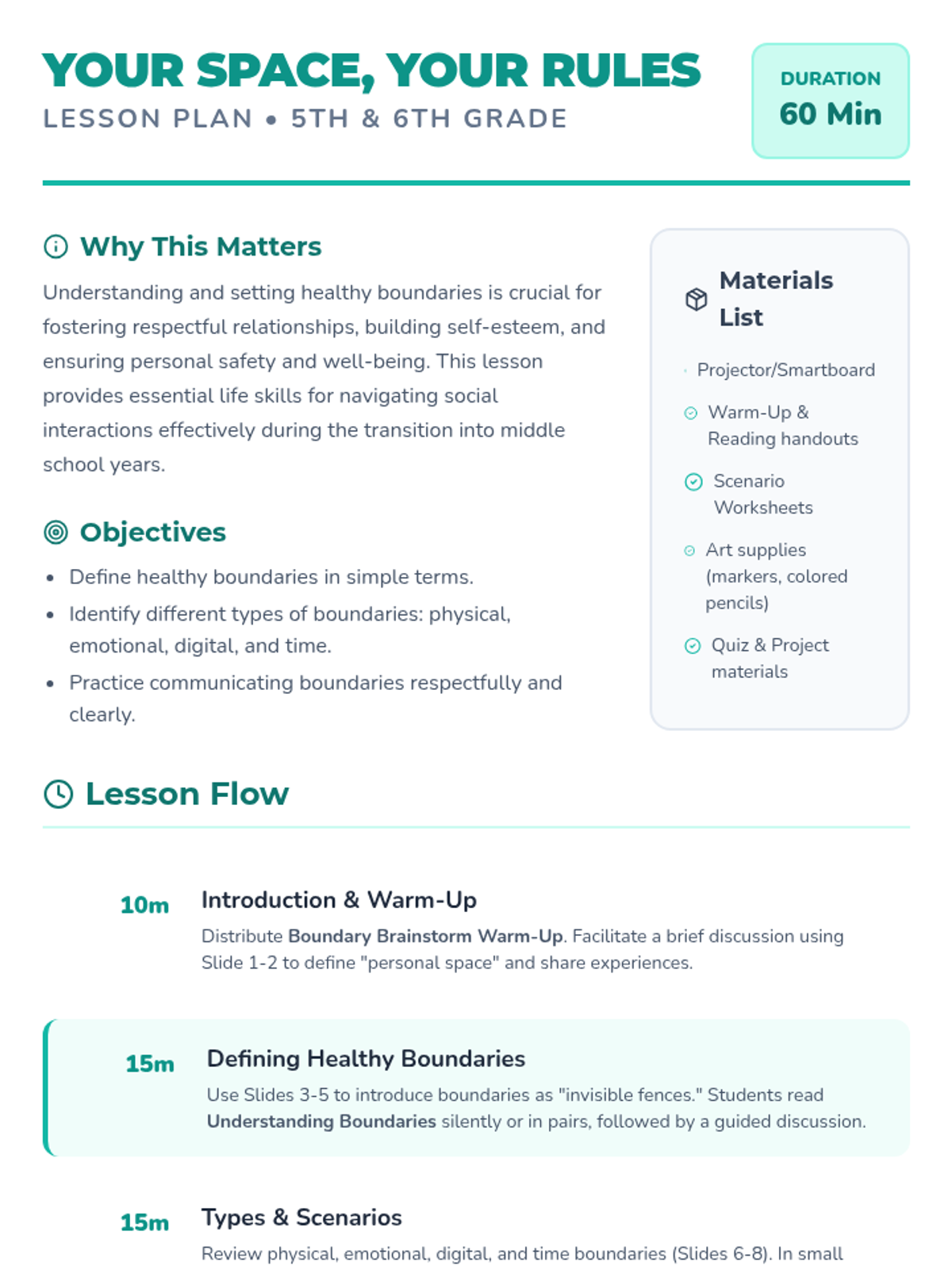 A 60-minute lesson for 5th and 6th graders to understand, set, and respect healthy physical, emotional, and digital boundaries in relationships.