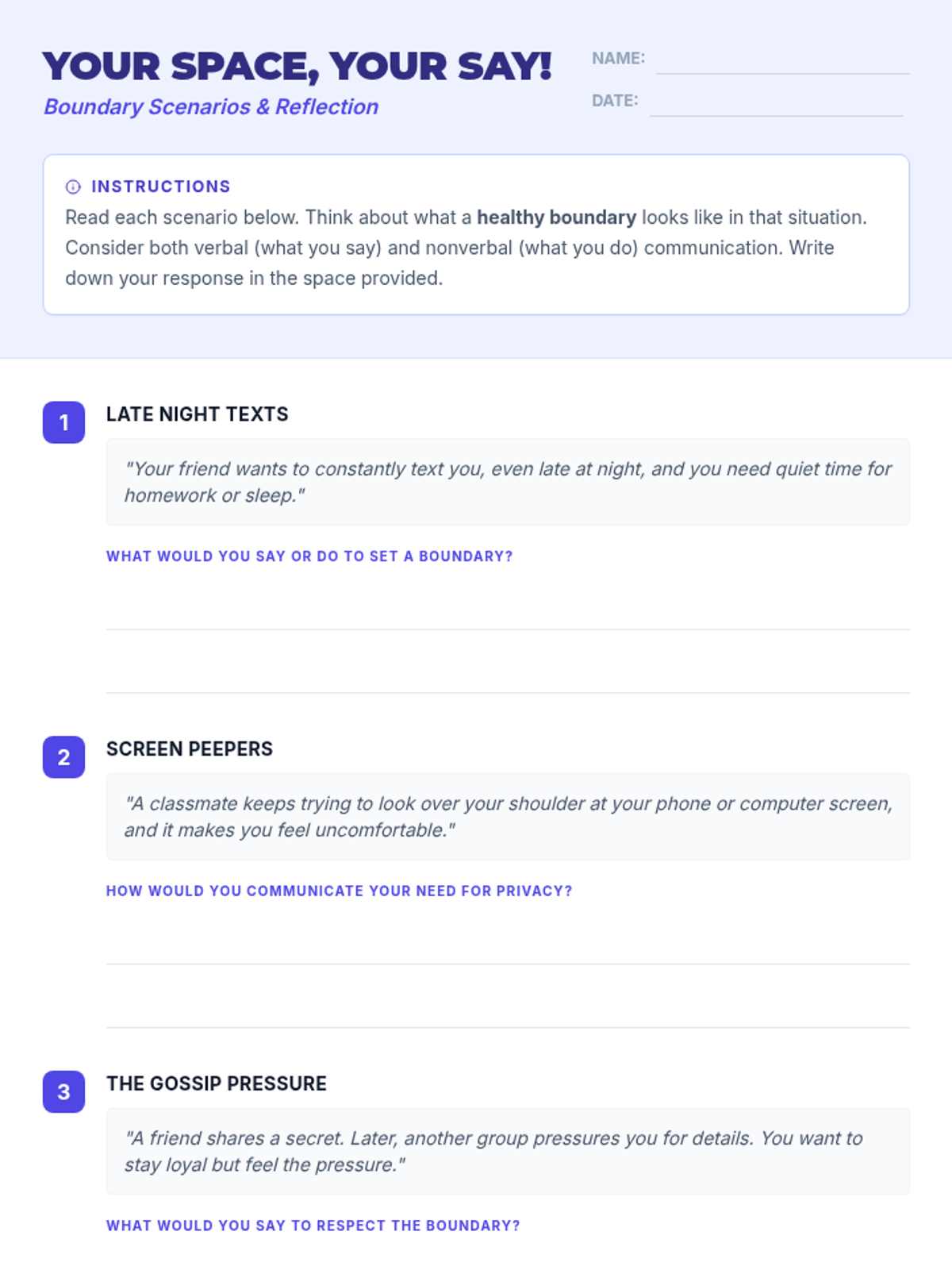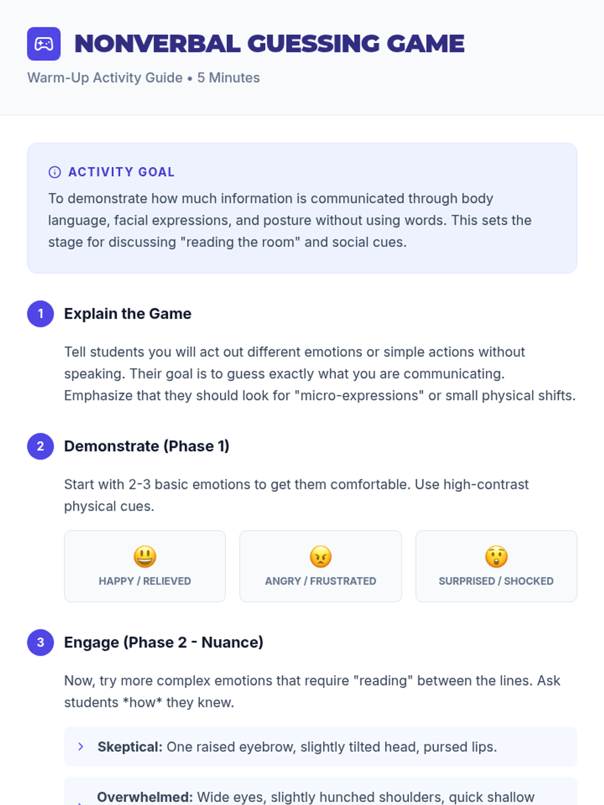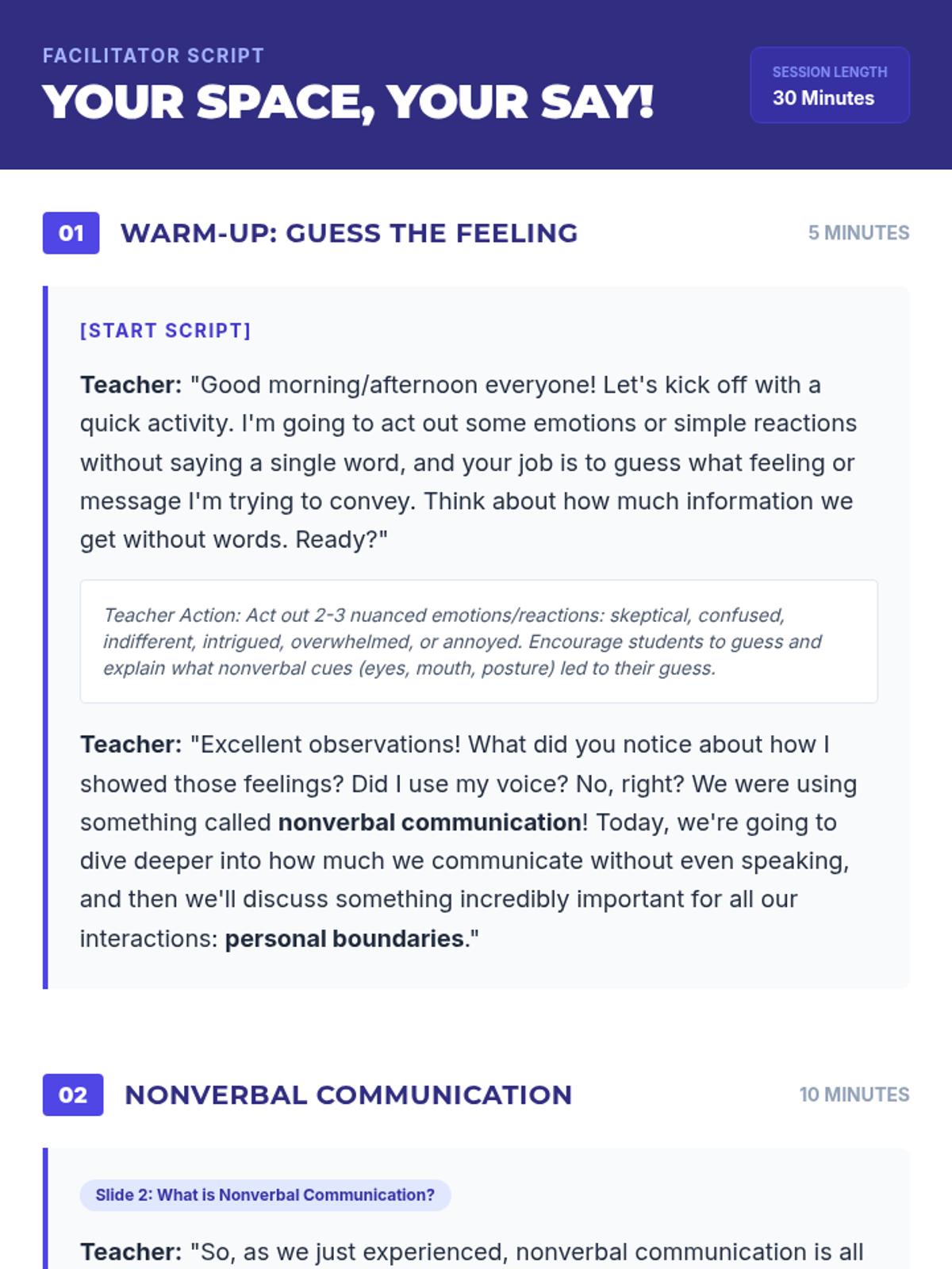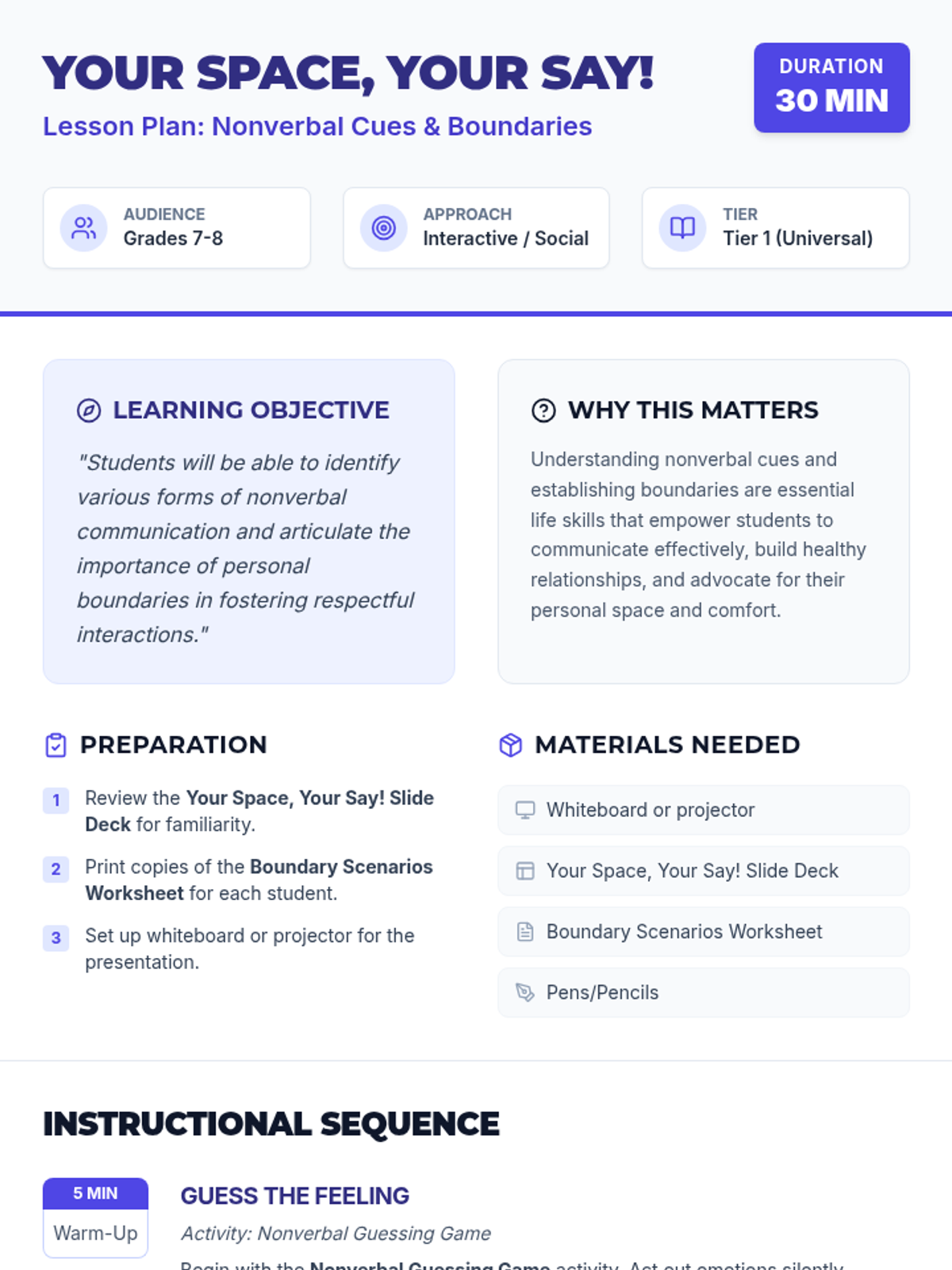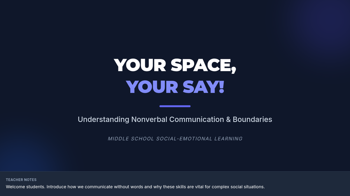 An interactive 30-minute lesson for middle schoolers focusing on nonverbal communication, 'reading the room,' and establishing healthy personal and digital boundaries.