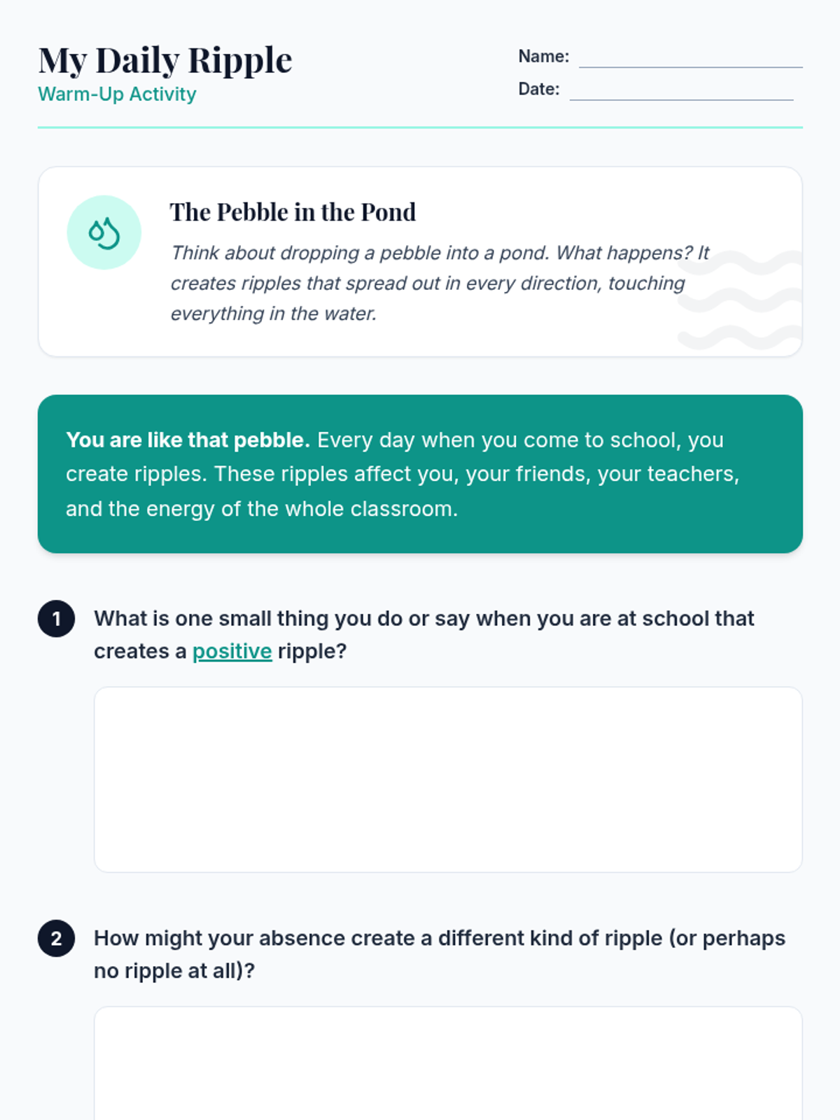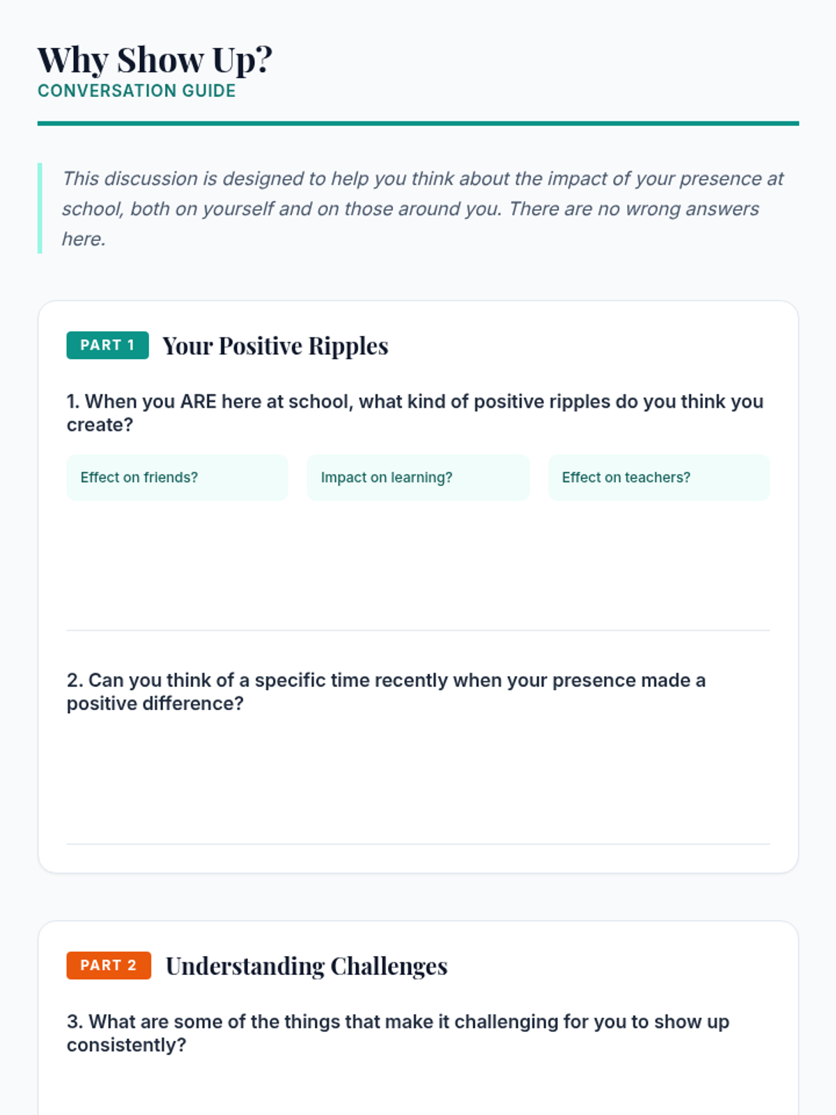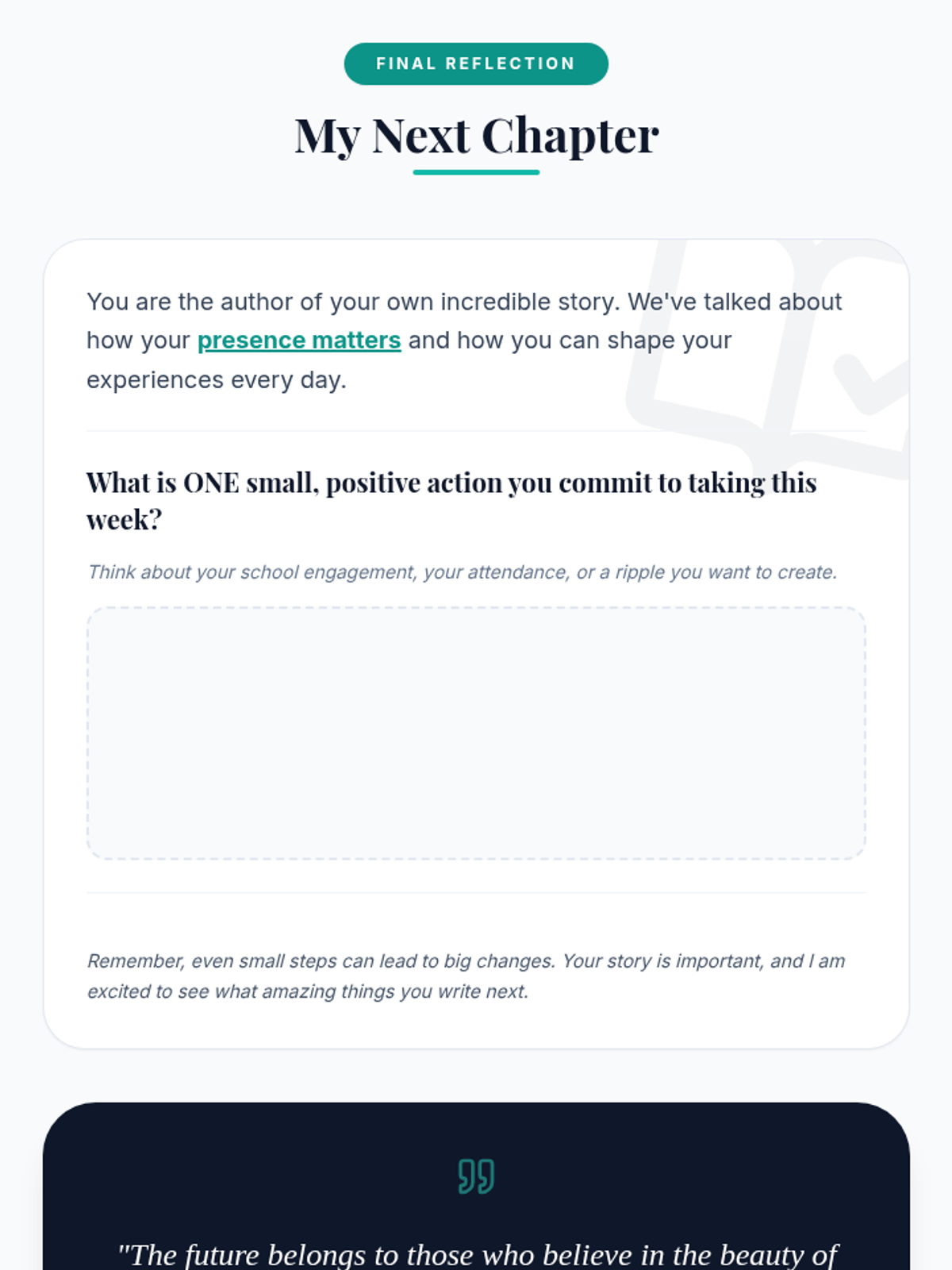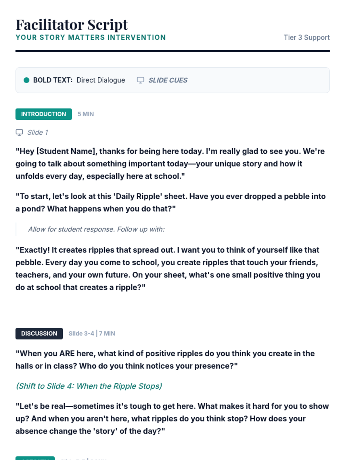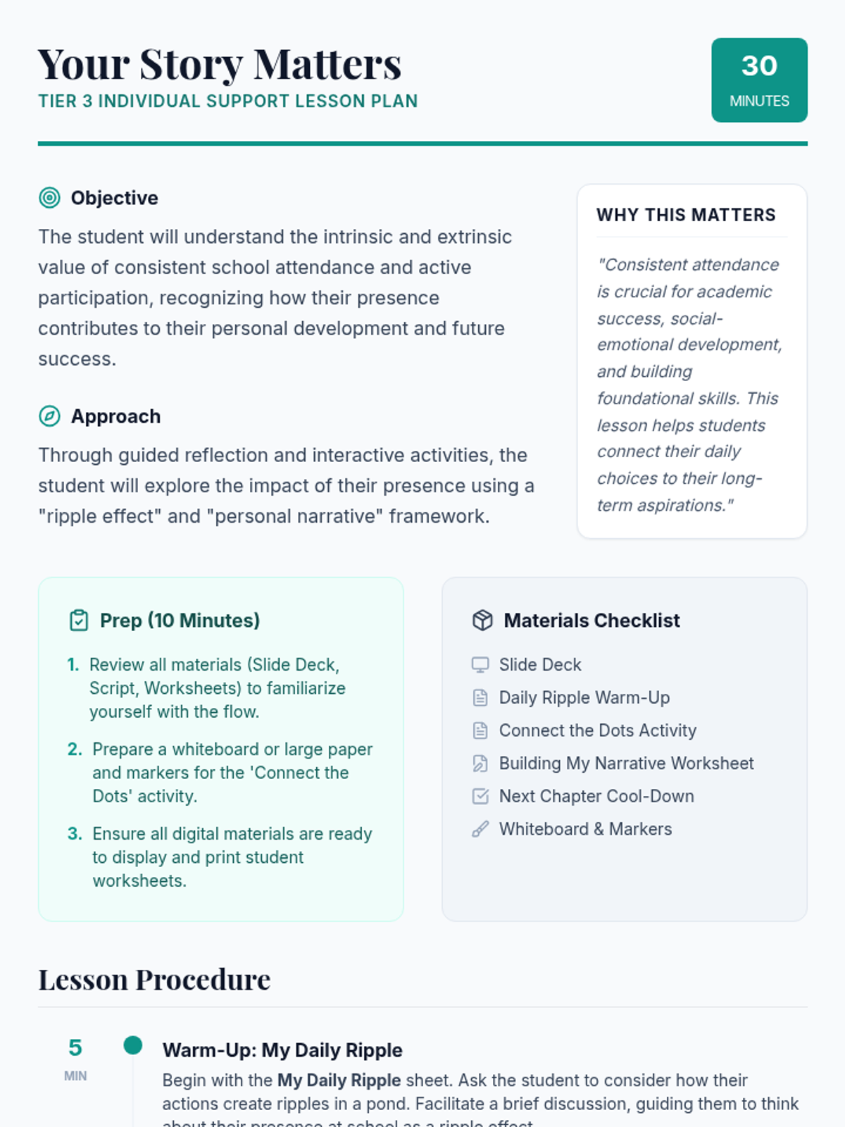 A 30-minute individual Tier 3 intervention for disengaged middle school students, focusing on the ripple effect of their attendance and their role as the author of their own academic and personal narrative.