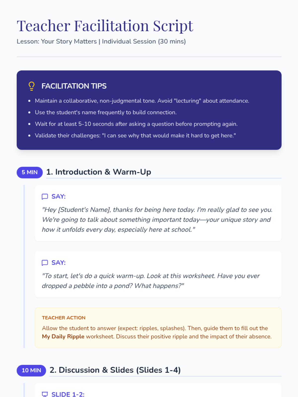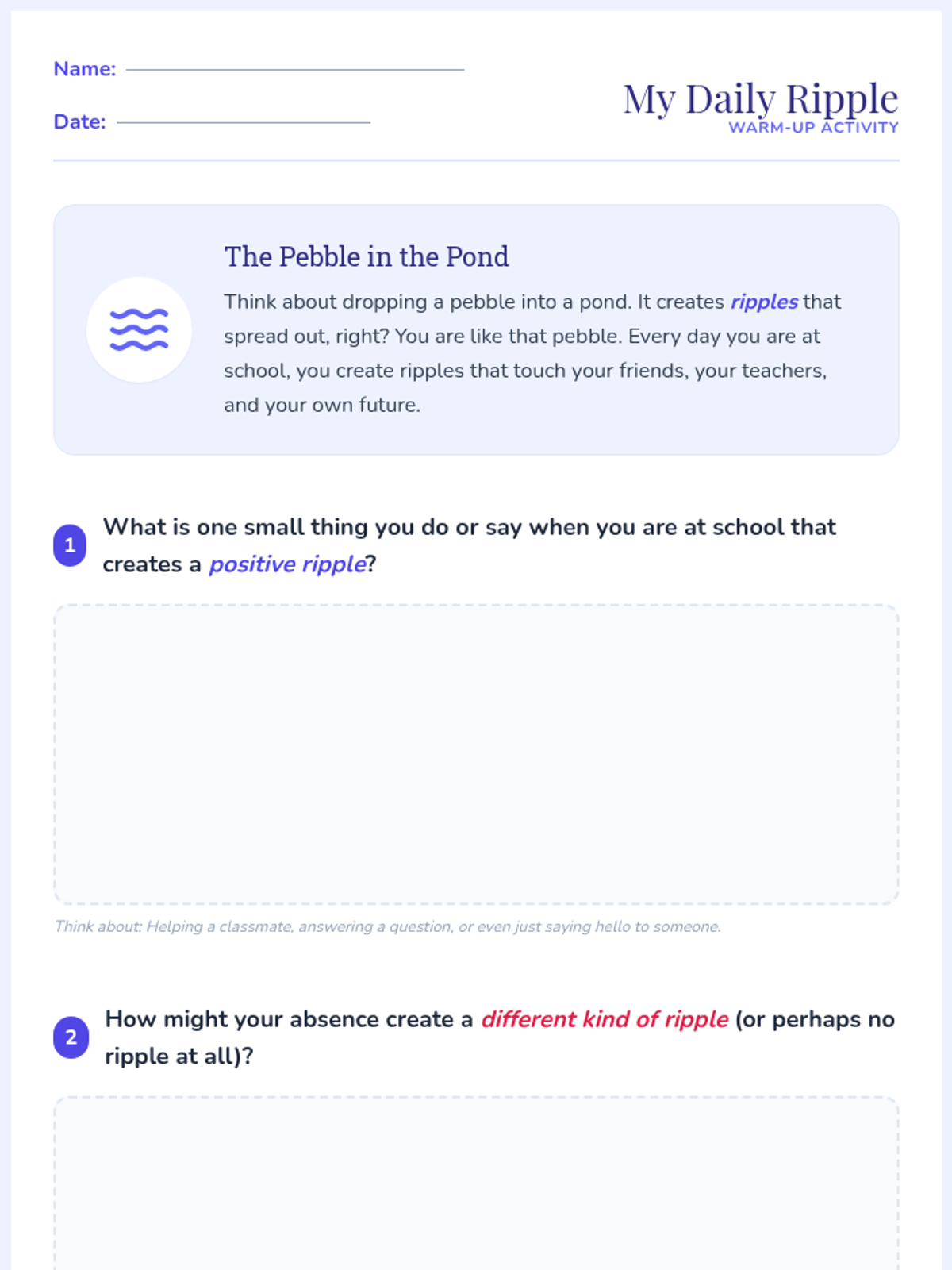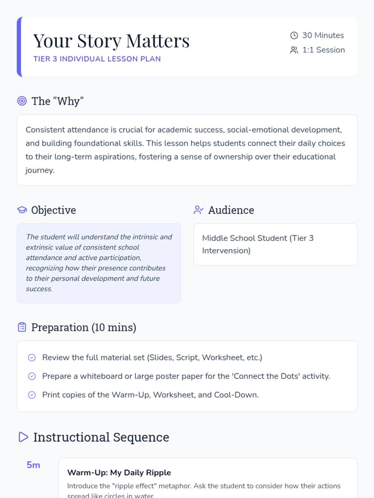 A 30-minute individual Tier 3 lesson designed to help disengaged middle school students reconnect with their education by viewing their school journey as a unique story where their presence creates meaningful ripples.