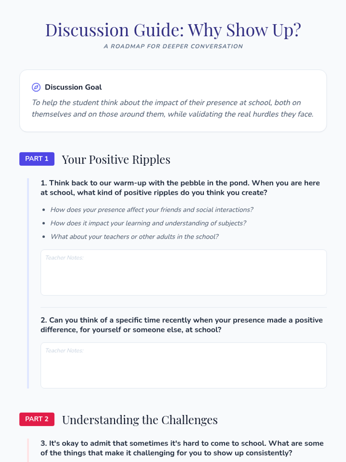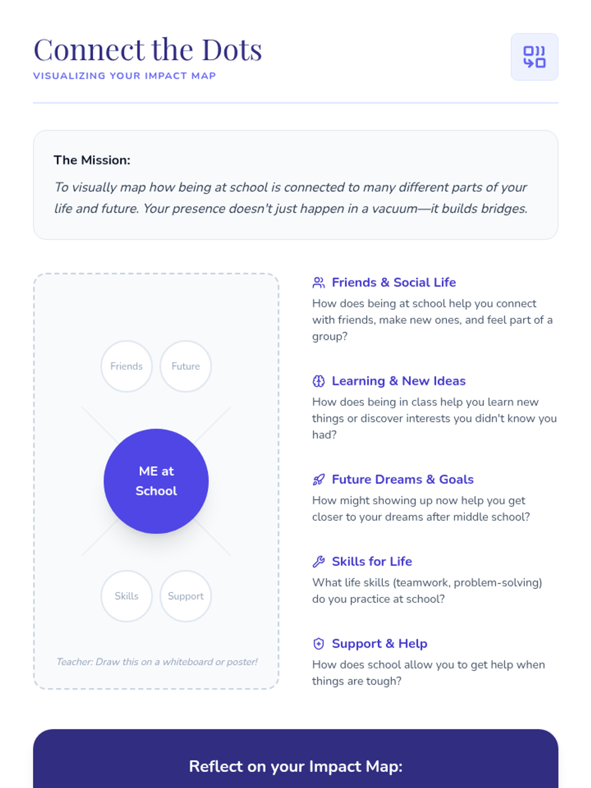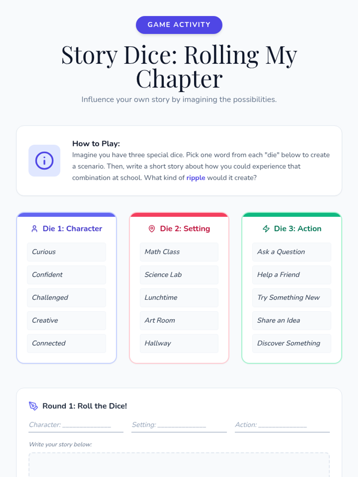 A 30-minute individual Tier 3 lesson designed to help disengaged middle school students reconnect with their education by viewing their school journey as a unique story where their presence creates meaningful ripples.