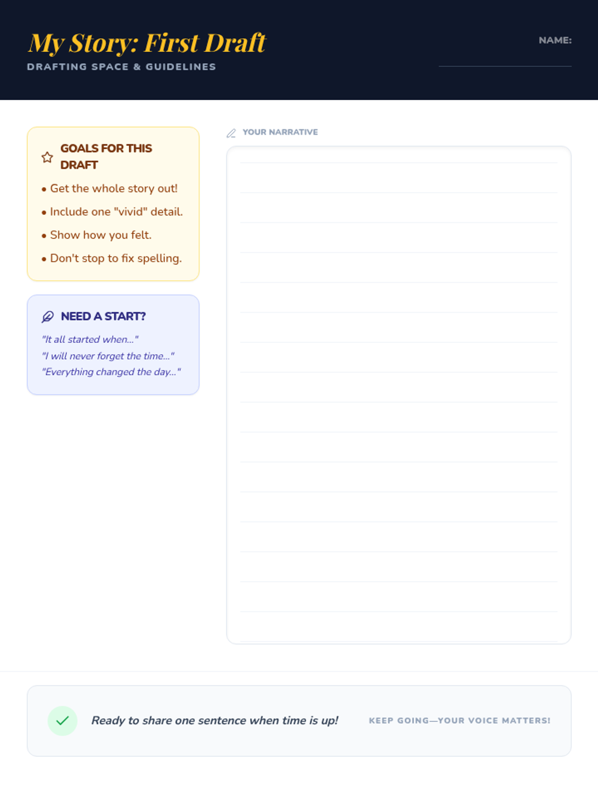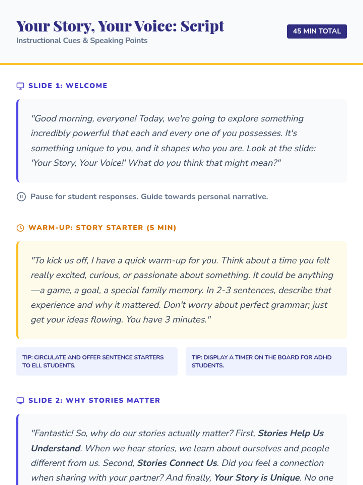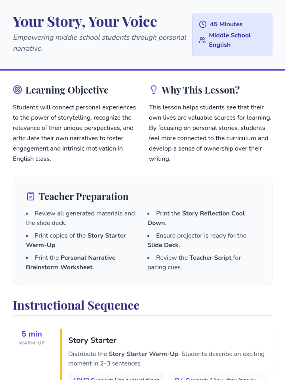 A middle school English lesson focused on re-engaging students by connecting their personal experiences to the power of storytelling and finding their unique writing voice.