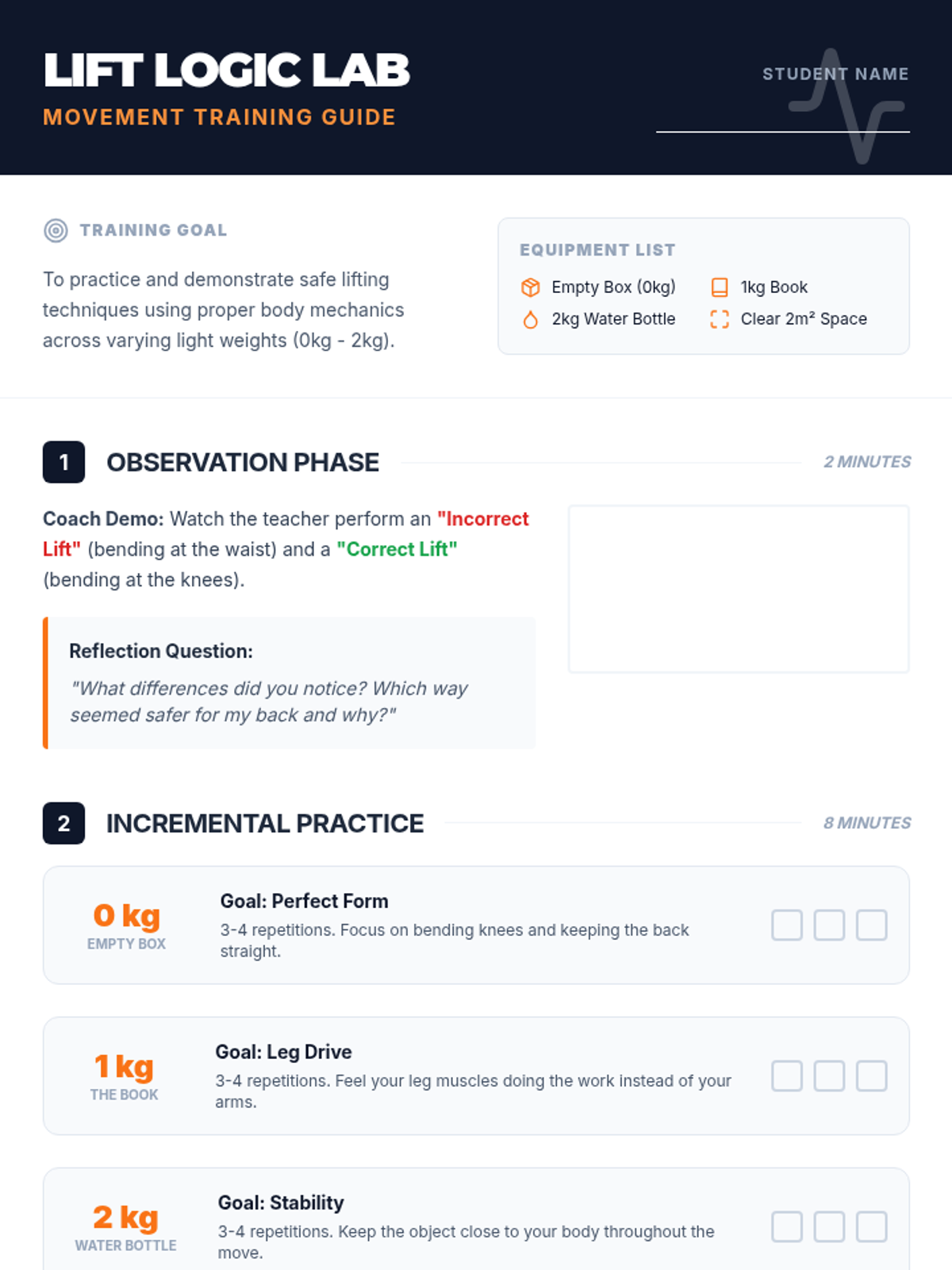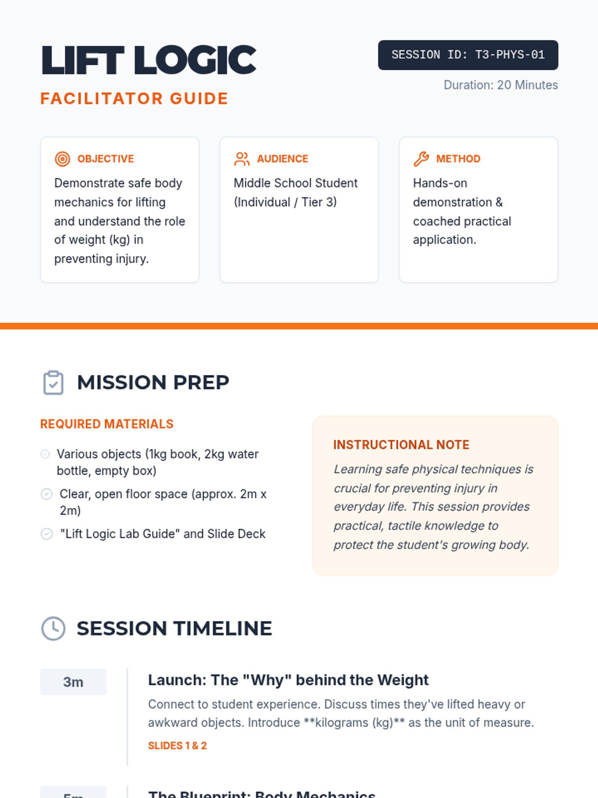 A personalized 20-minute Tier 3 lesson for middle schoolers focused on safe physical movements and body mechanics when lifting weighted objects. Students learn proper technique (bending knees, straight back) and explore the concept of kilograms as a measure of weight.