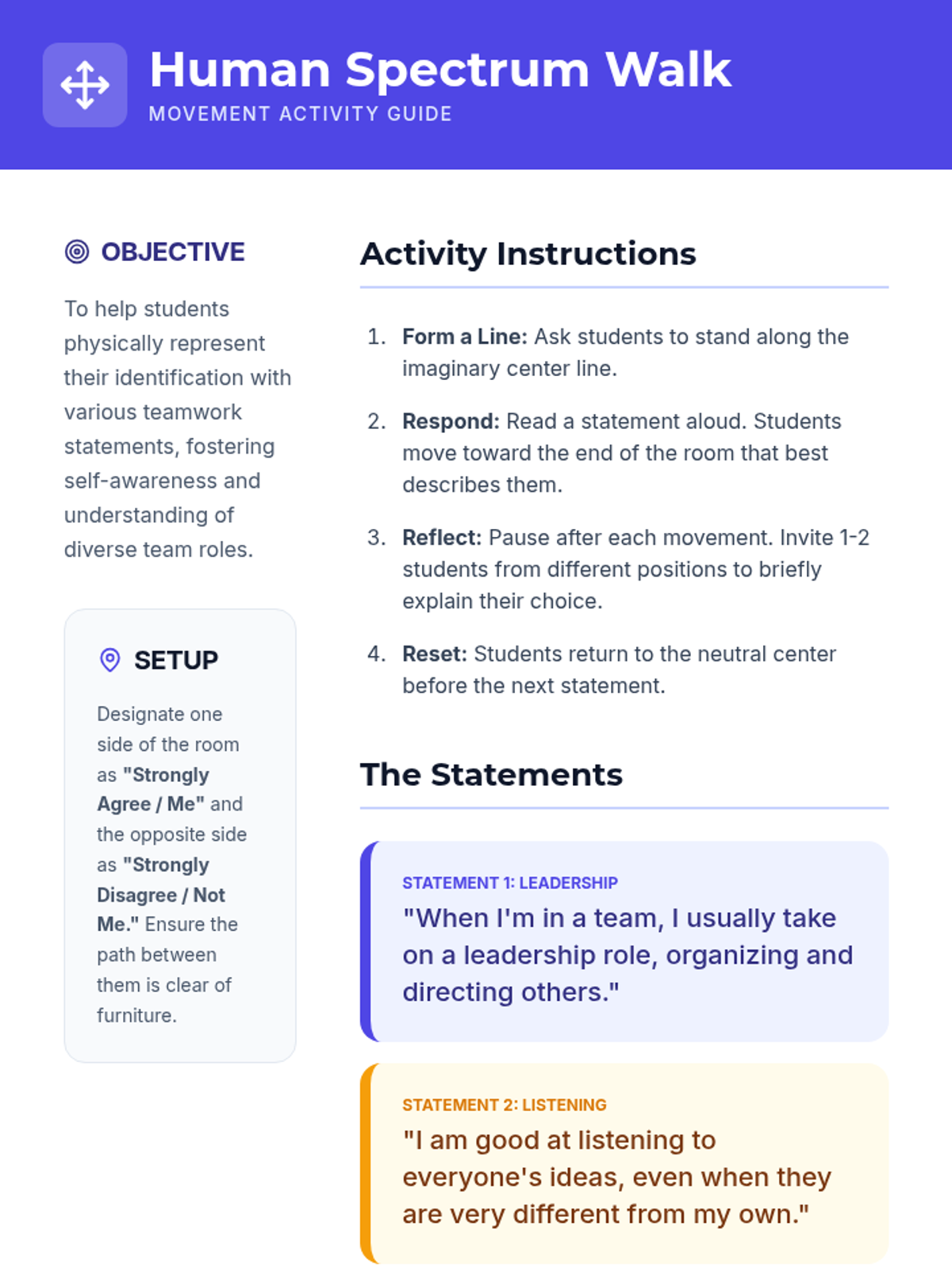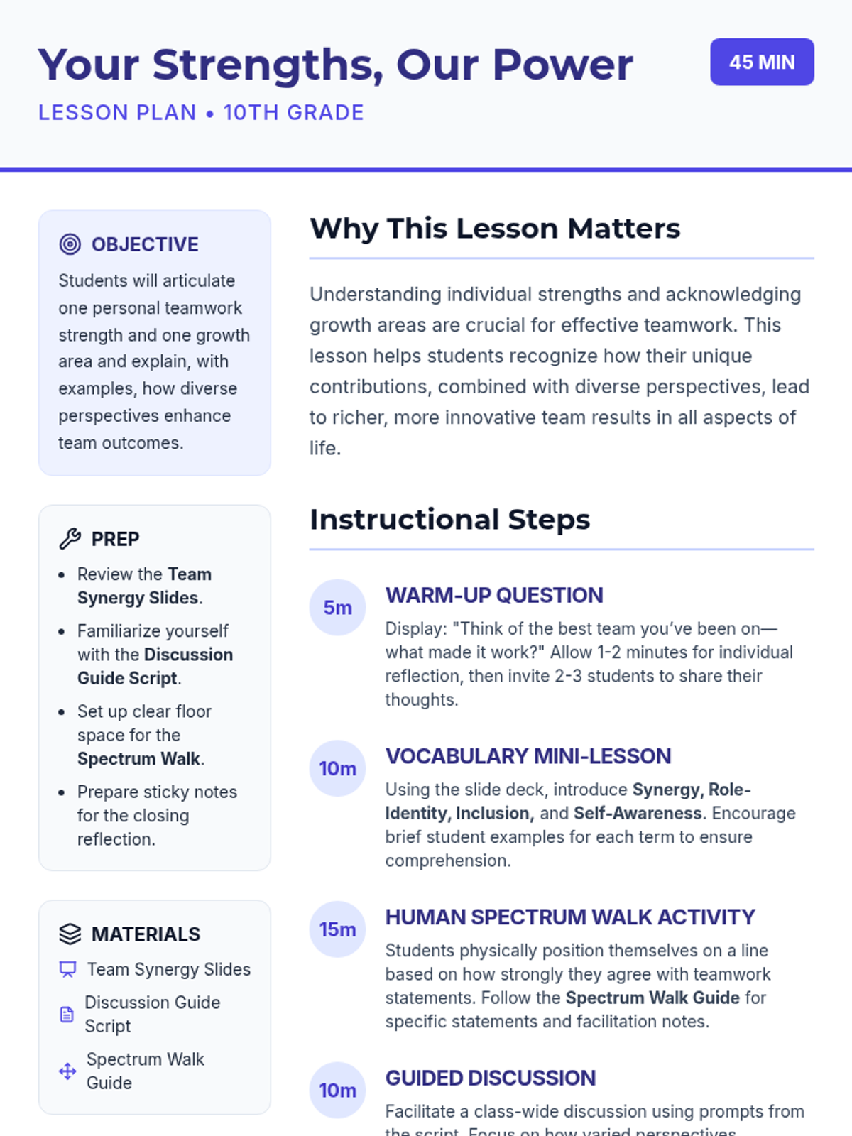 A 45-minute lesson for 10th-grade students to explore personal teamwork strengths, growth areas, and the power of diverse perspectives in collaboration.