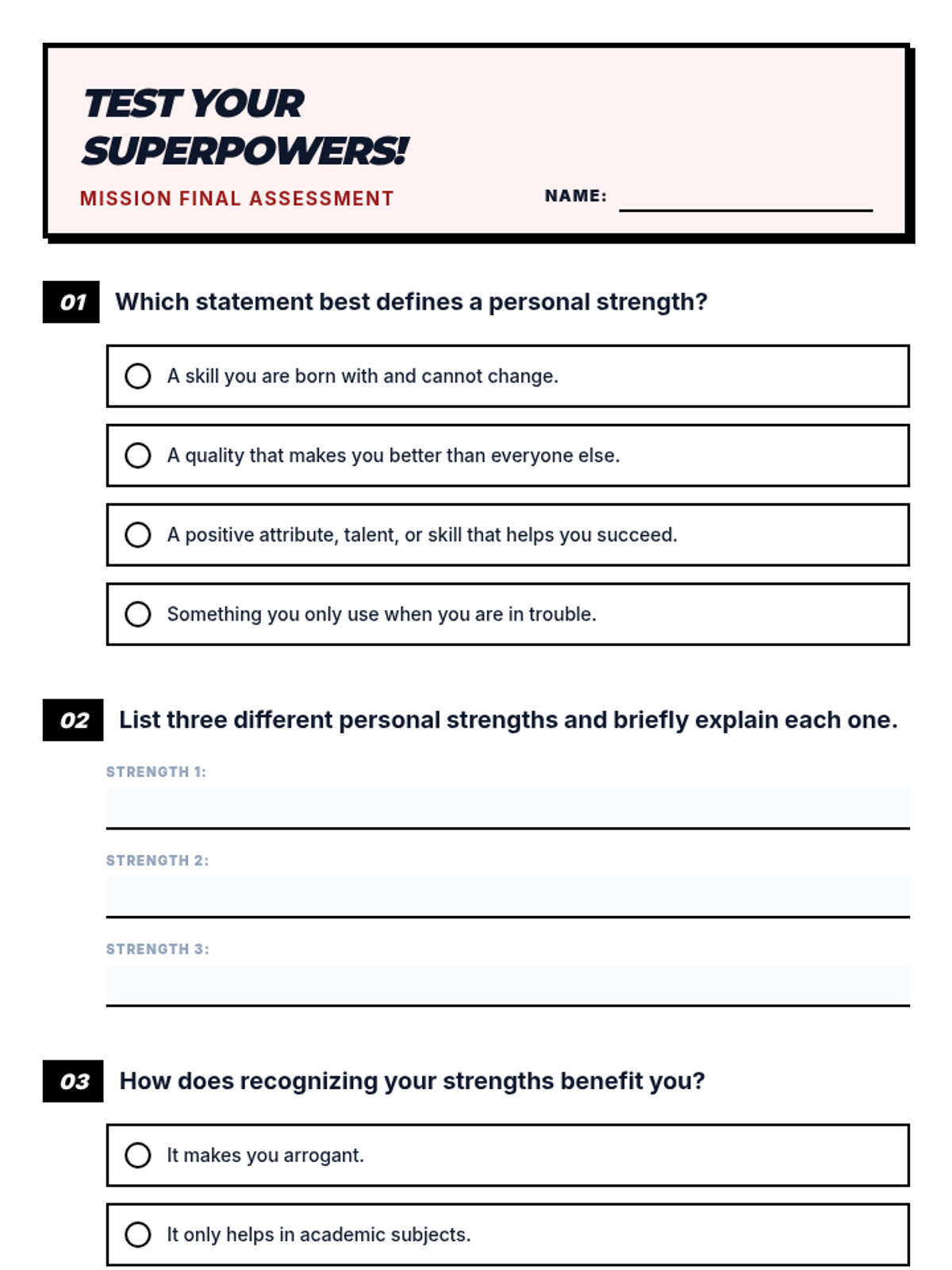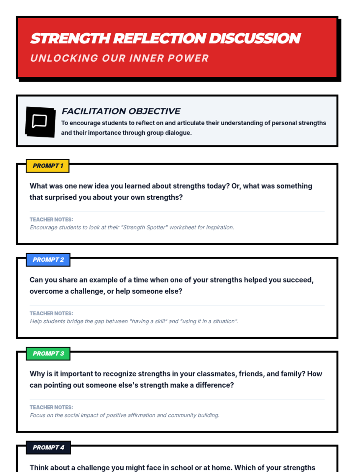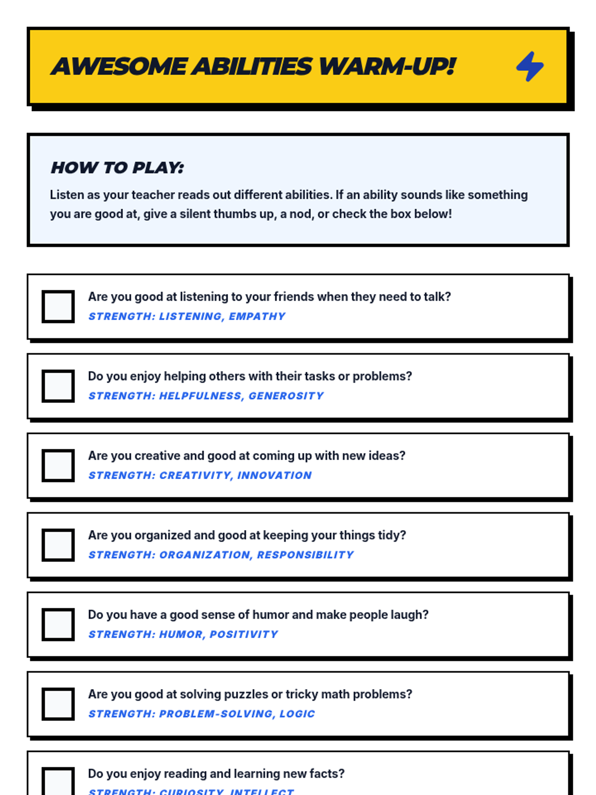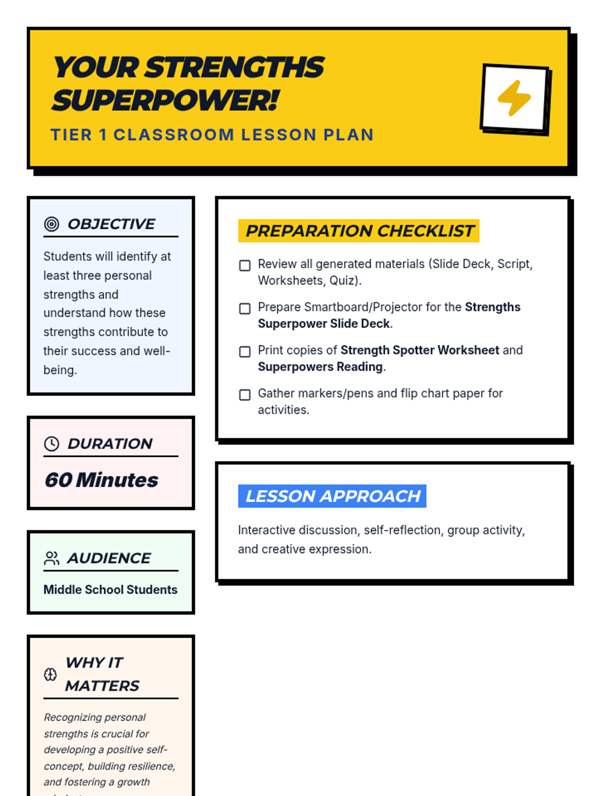 A 1-hour interactive lesson for middle school students to identify, celebrate, and apply their unique personal strengths to build self-esteem and resilience.