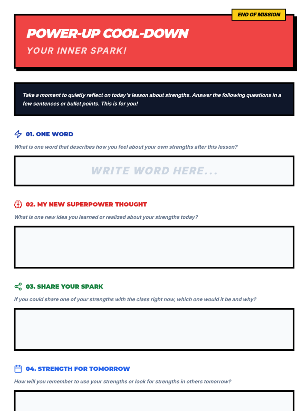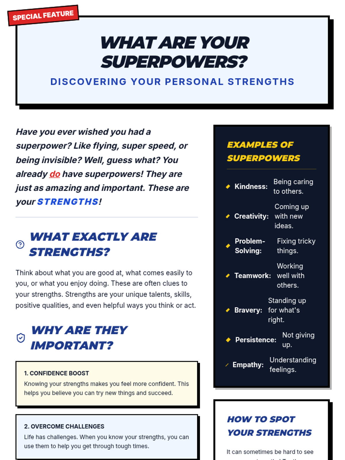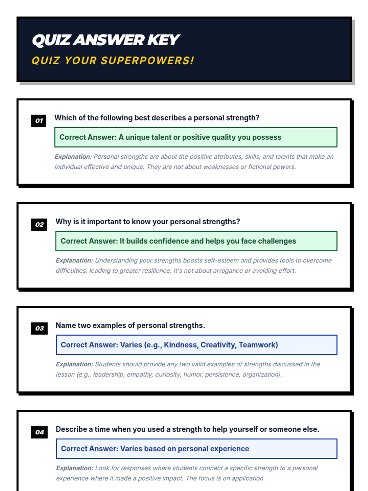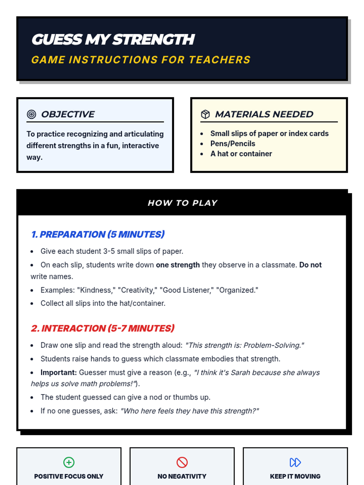 A 1-hour interactive lesson for middle school students to identify, celebrate, and apply their unique personal strengths to build self-esteem and resilience.