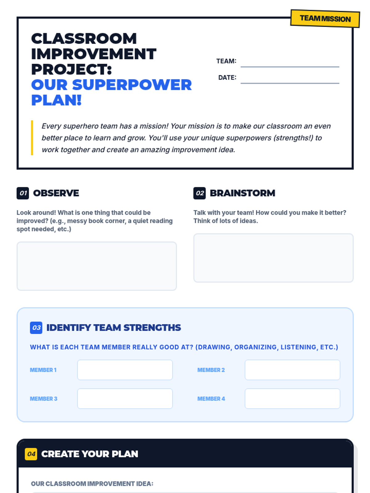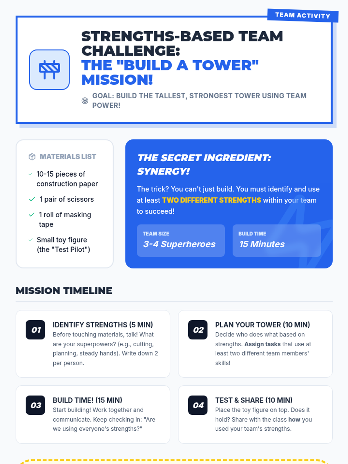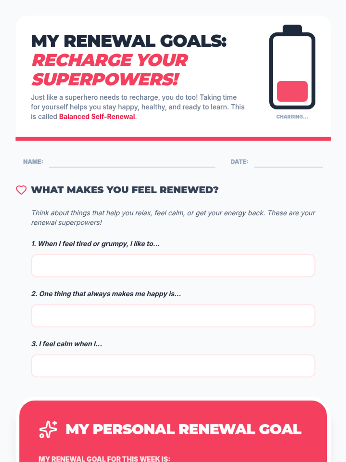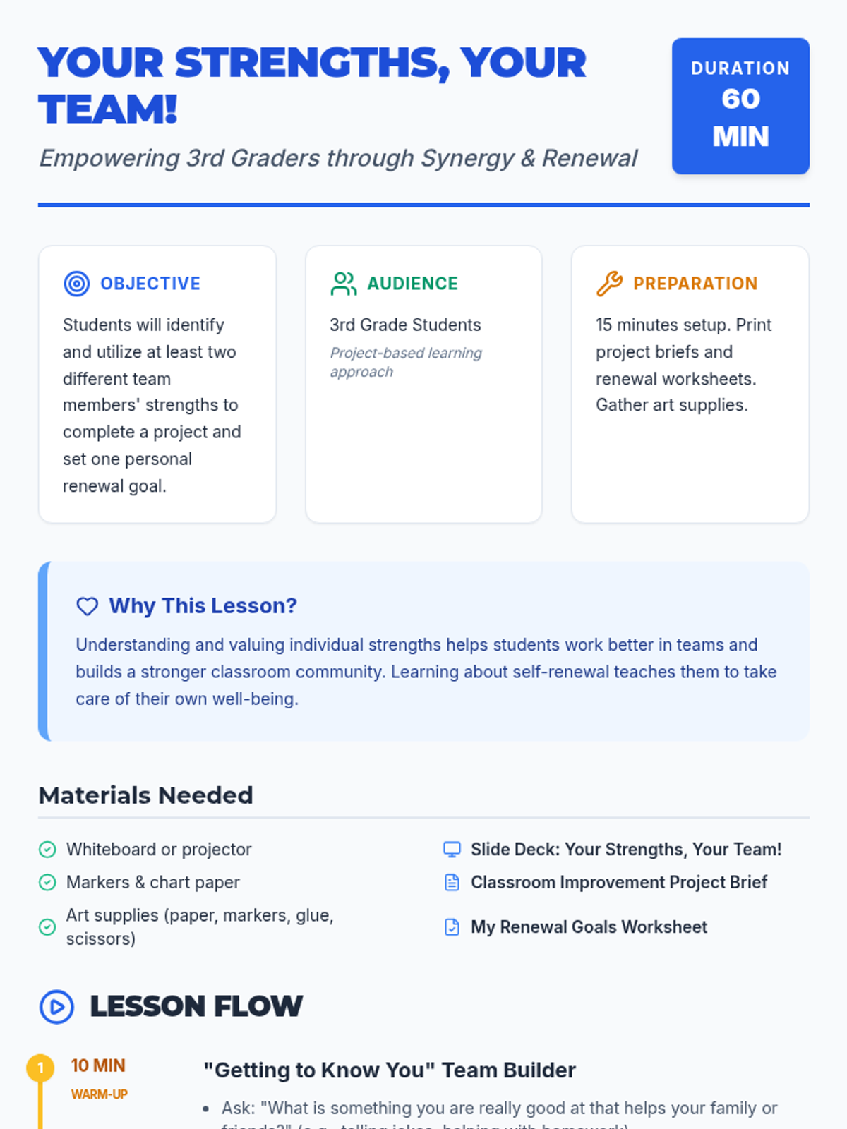 A 60-minute 3rd-grade lesson where students discover their unique strengths, learn about synergy through a classroom improvement project, and set personal renewal goals to maintain well-being.